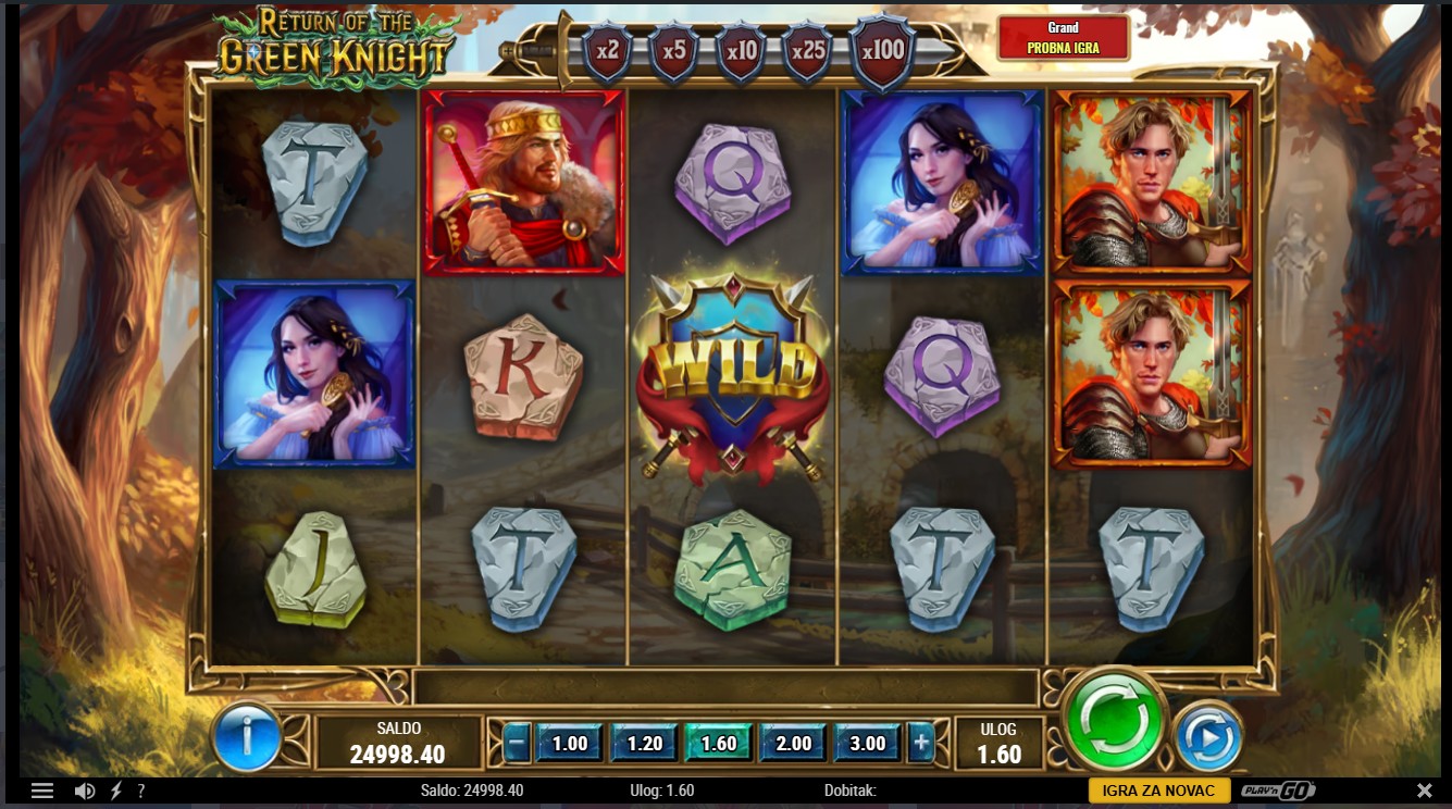 Return of The Green Knight je epska slot igra s 5 rola i 20 fiksnih isplatnih linija smještena u srednjovjekovni svijet hrabrih vitezova i legendi. Ova zabavna igra providera Play'n GO donosi dinamične Wild simbole s multiplikatorima koji mogu udvostručiti ili čak stostruko uvećati dobitke, dok Scatter simboli aktiviraju uzbudljive besplatne vrtnje i dodatne Shield Spinove. Tijekom Free Spins Wild simboli dobivaju rastući Wild Multiplier, a Shield Spins zaključavaju vrijednosti multiplikatora i fiksiraju Wild simbole, što omogućuje osvajanje velikih dobitaka. Progresivni jackpot dodaje dodatnu razinu uzbuđenja za igrače koji traže velike nagrade.
