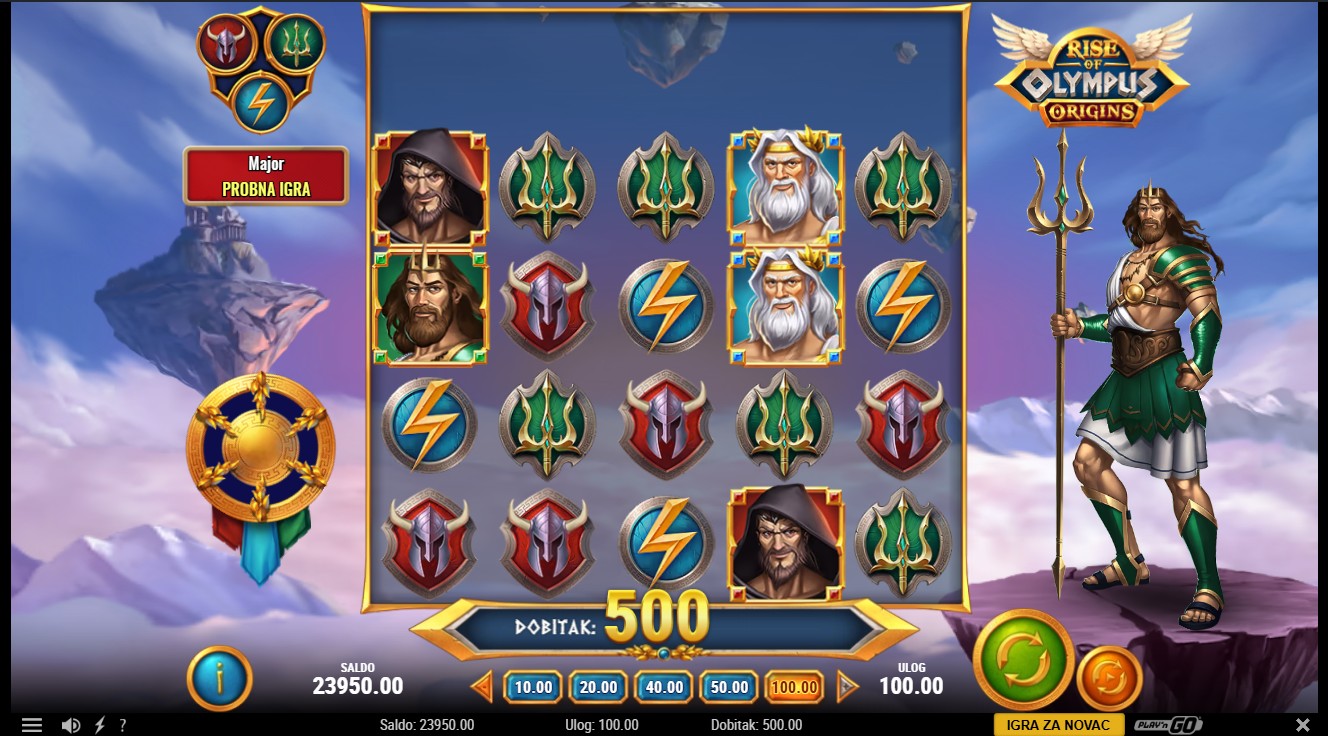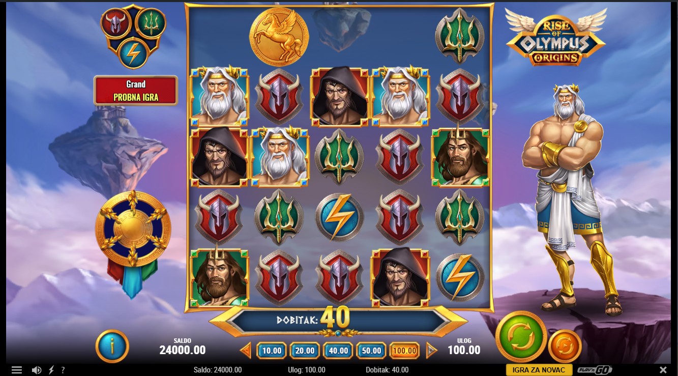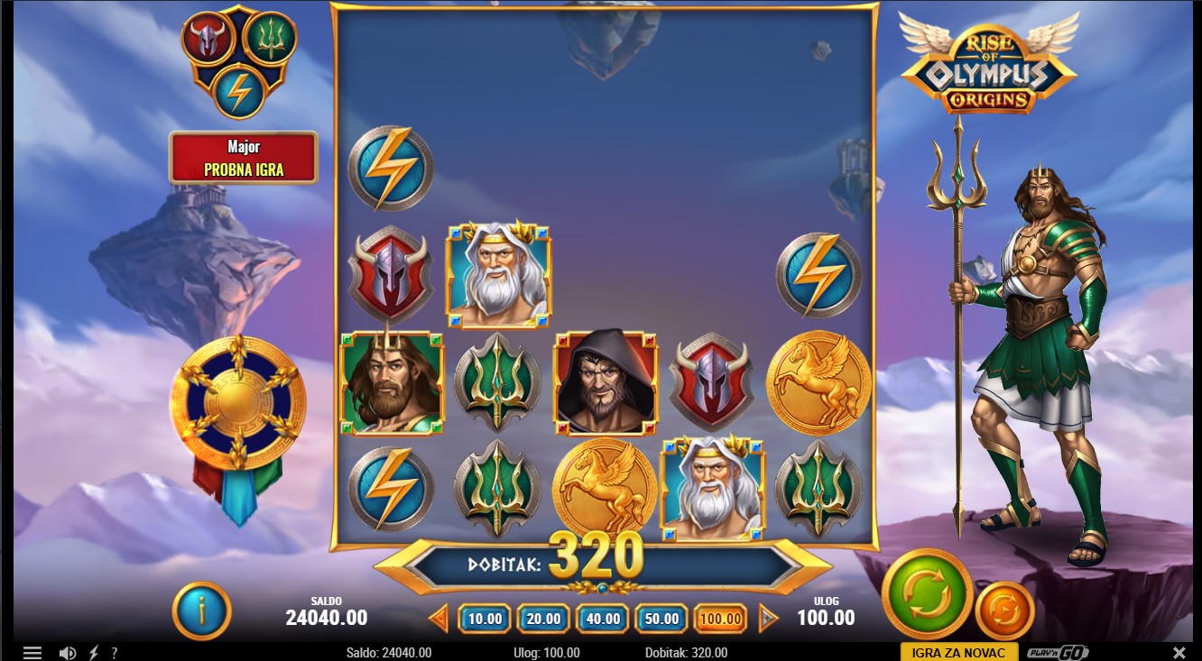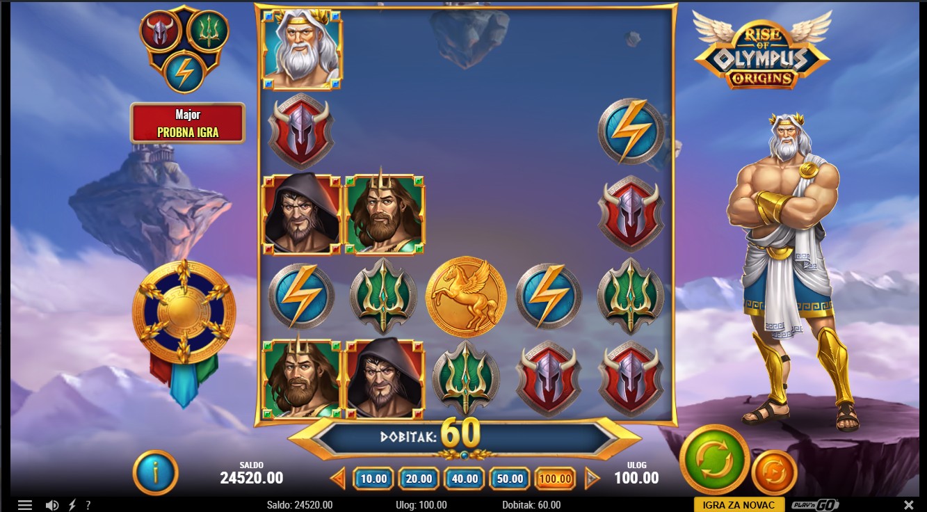 Zakoračite u mitski svijet bogova u Rise of Olympus Origins, slot igru providera Play'n GO s padajućim simbolima na ploči od 5x5 polja. Svi simboli padaju prema dolje i formiraju dobitne kombinacije ako se 3 ili više simbola spoje vodoravno ili okomito. Svaka kombinacija uklanja simbole s ploče, omogućujući stvaranje novih dobitaka. Posebni Wild simboli pojavljuju se kada se uklone kombinacije simbola relikvije, zamjenjujući sve ostale simbole. Aktivirajte Božju ruku pomoću dobitaka simbola bogova: Had, Zeus i Posejdon svaki imaju jedinstvenu moć koja mijenja, uklanja ili dodaje simbole na ploču. Punjenjem mjerača moći, igrač može pokrenuti Bijes Olimpa i ostvariti ponovne vrtnje s dodatnim moćima bogova. Potpuno čišćenje ploče otključava Free Spinove, tijekom kojih se mogu osvojiti škrinje s nagradama koje sežu do 10.000x ukupnog uloga. Igra uključuje i progresivni jackpot s tri razine: Grand, Major i Mini, koji dodatno pojačavaju uzbuđenje.