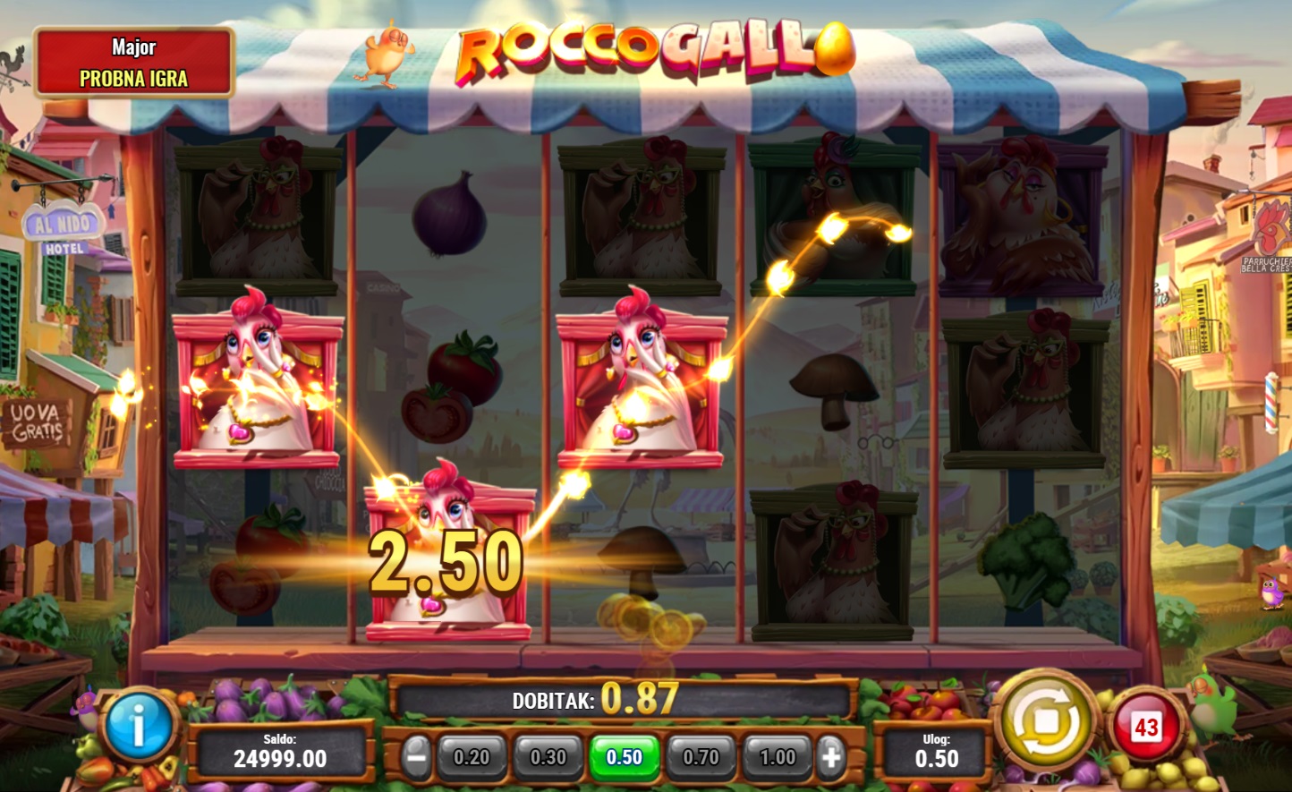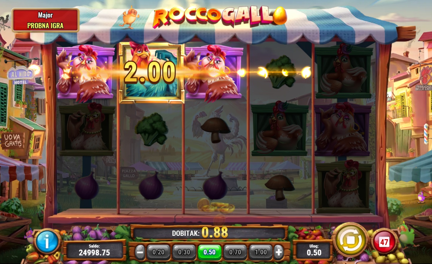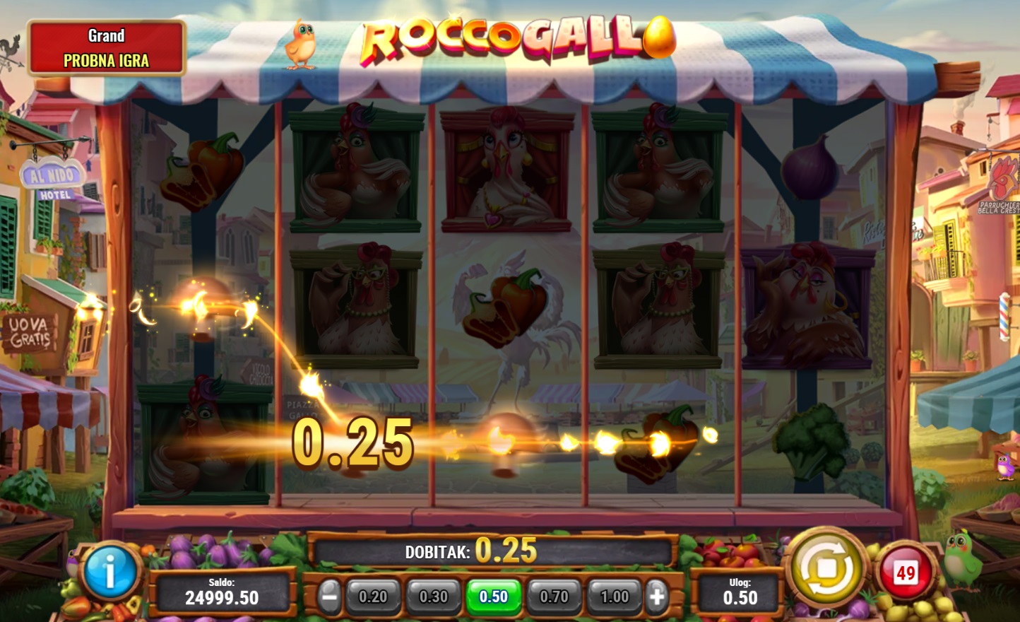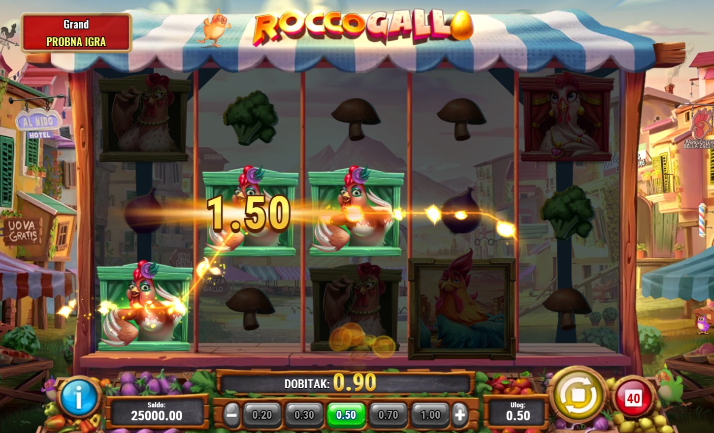 Rocco Gallo je dinamična video slot igra s pet rola i 20 isplatnih linija koja te vodi u svijet pun zabave i dobitaka. Simbol Rocco Gallo djeluje kao Wild, zamjenjujući sve simbole osim Scatter simbola zlatnog jaja, čime povećava šanse za velike dobitke. Igra je prepoznatljiva po svojim jedinstvenim bonus značajkama, uključujući bonus trenutne nagrade i uzbudljive respinove. Svako okretanje donosi priliku za nevjerojatne nagrade, dok posebni simboli Rocco Gallo i Vinnie Volpe dodatno začinjavaju igru. Rocco Gallo nudi balans između redovitih dobitaka i uzbudljivih mogućnosti za velike nagrade.