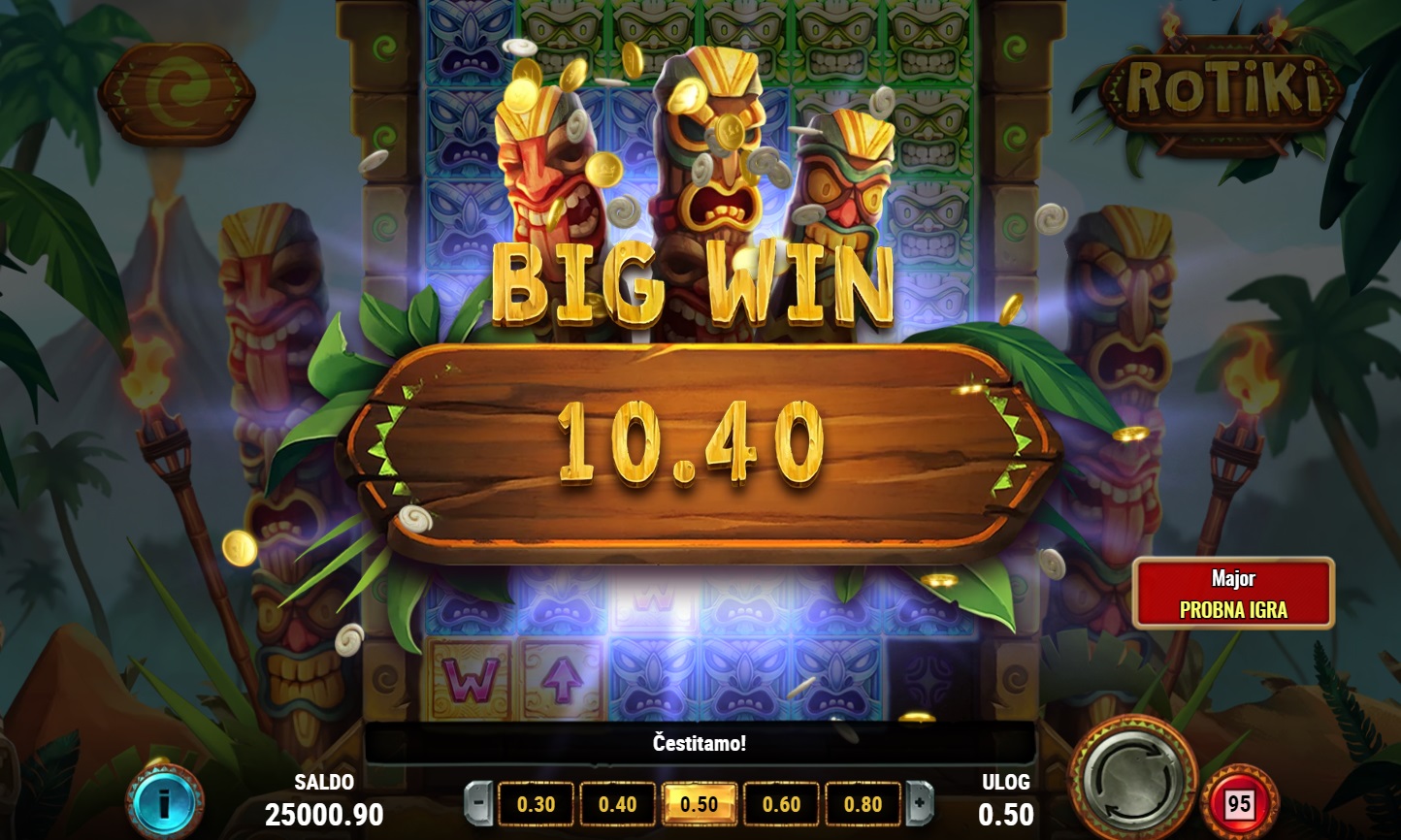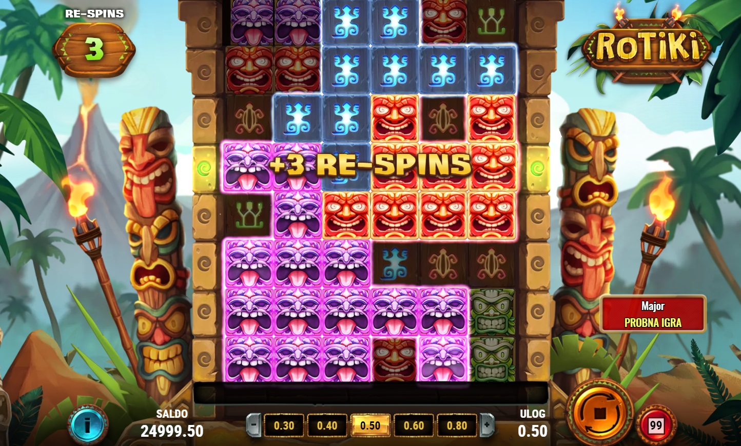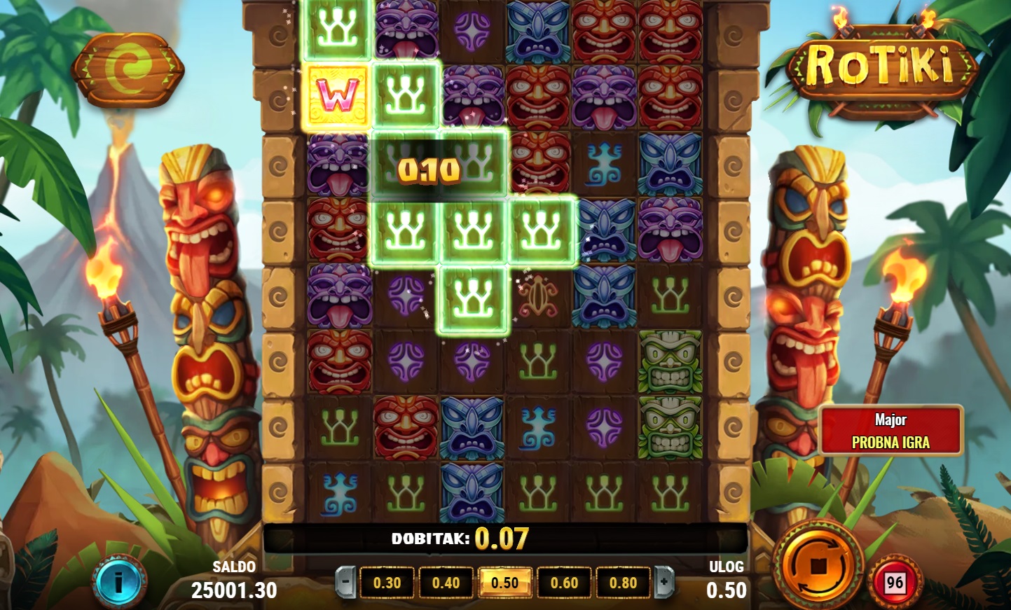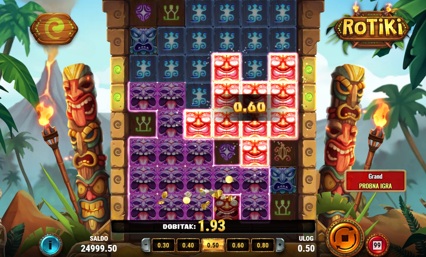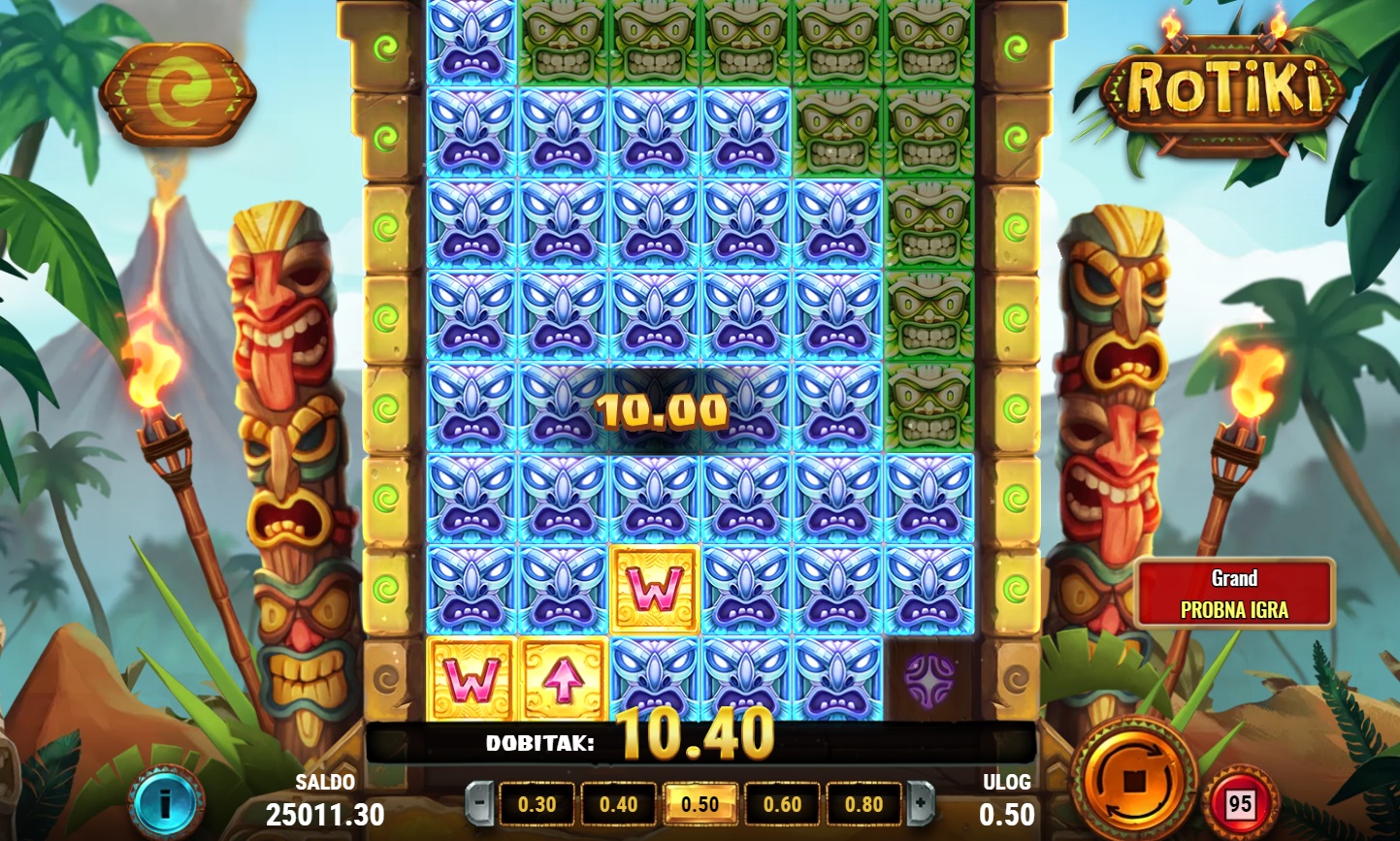 Rotiki je dinamičan videoautomat s jedinstvenom pločom od 6x8 polja gdje dobici dolaze spajanjem pet ili više susjednih simbola. Ova igra nudi brojne uzbudljive značajke, uključujući re-spinove i Wild simbole s posebnim moćima čarolije tiki. Igra pruža priliku za velike dobitke kroz bonus igru sobe s blagom, gdje se skriva mnoštvo iznenađenja. Rotiki je savršen izbor za sve koji traže uzbudljivo iskustvo i velike nagrade!