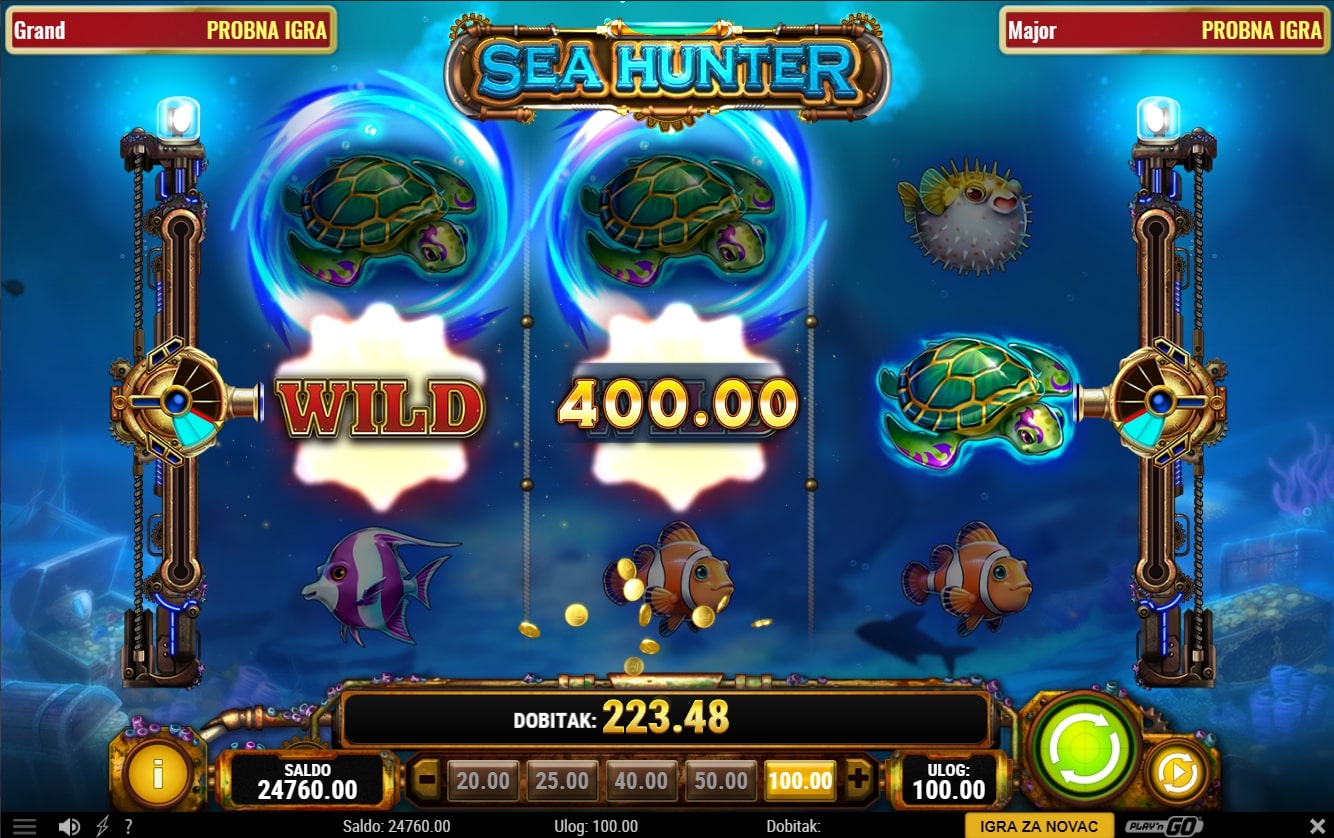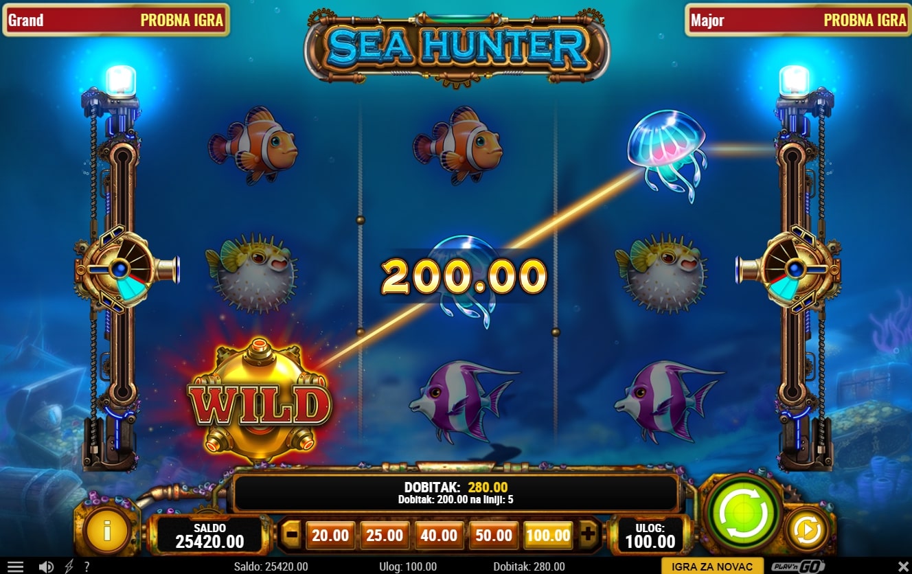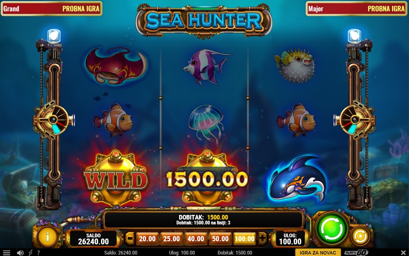 Sea Hunter slot je igra morske tematike koja vodi igrača u podmorje u potrazi za fantastičnim dobicima. Simboli su inspirirani životinjskim svijetom mora, a najviše vrijede simboli hobotnice i kita. Također, igra sadrži simbol morske mine koji može zamijeniti druge simbole u kreiranju dobitaka. Ono što igru čini posebnom je top s mjeračem koji se nalazi za strane slota i može ispaliti posebnu značajku koja povećava šanse dobitaka. Zaigraj Sea Hunter te osvoji osvježavajuće nagrade!