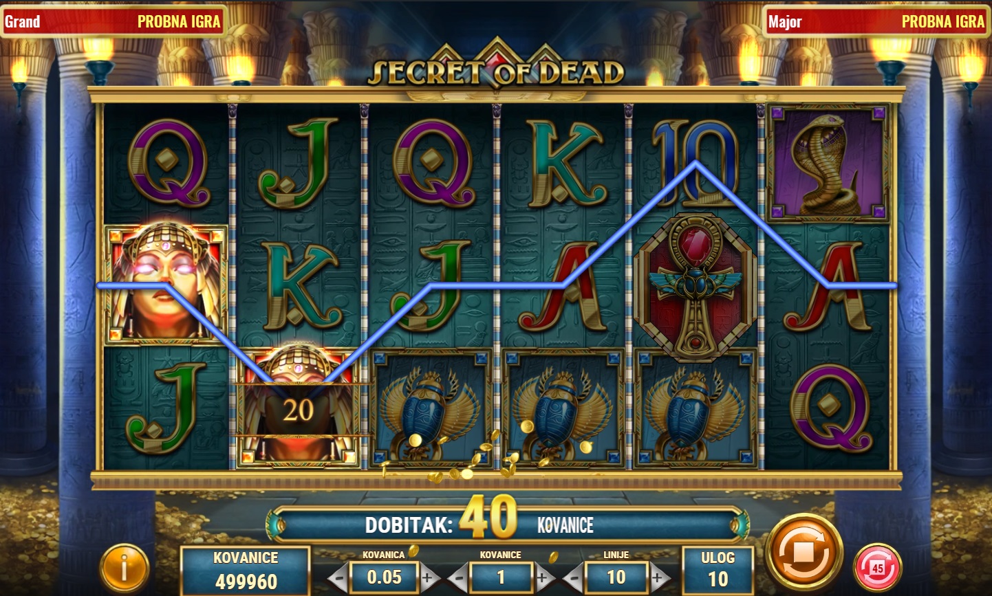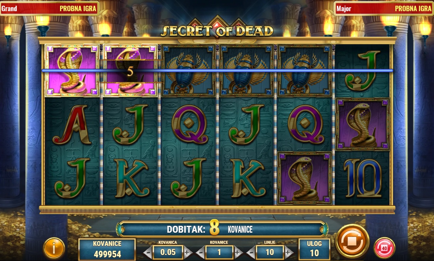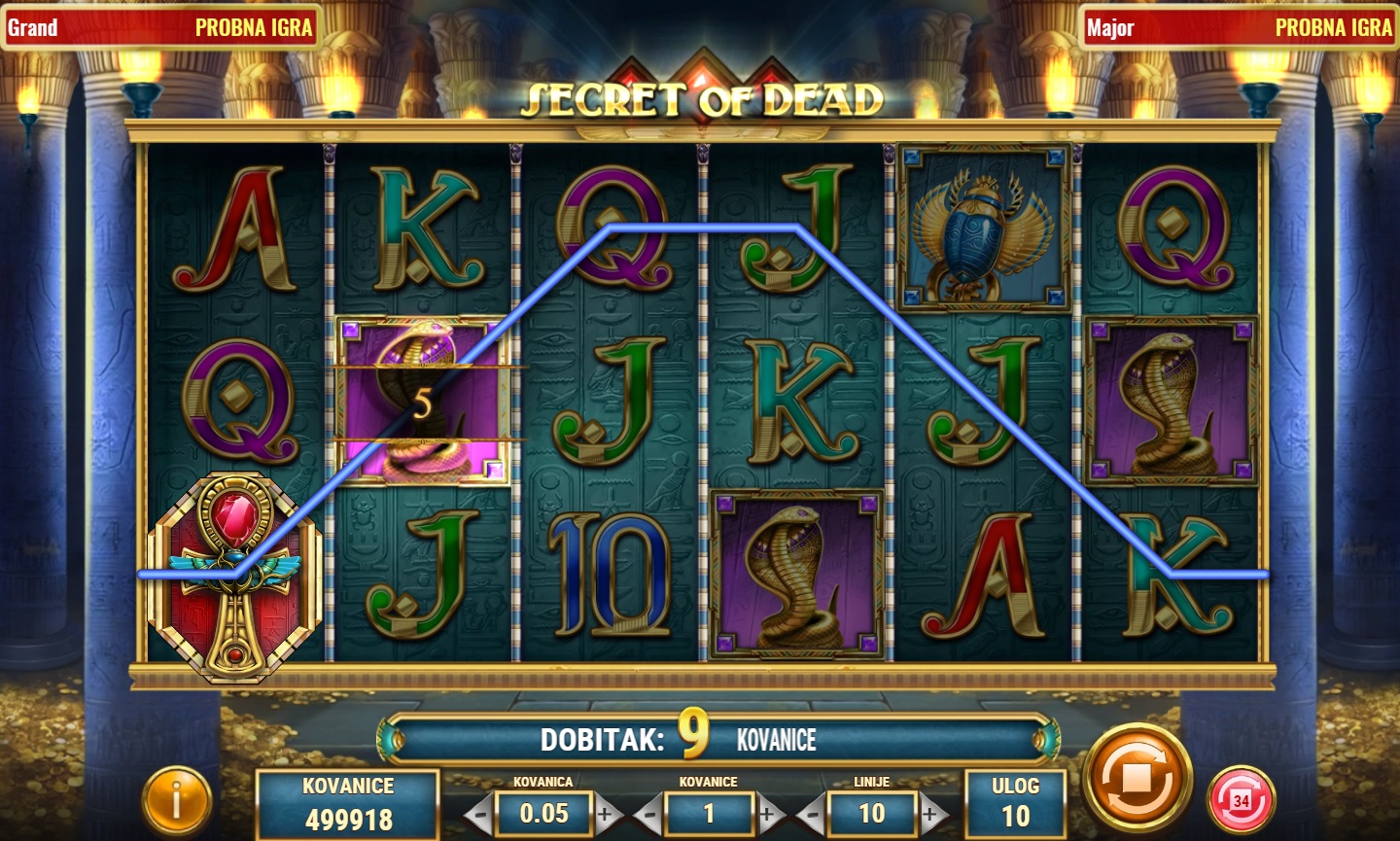 Secret of Dead je fascinantna video slot igra s tematikom drevnog Egipta, koja nudi 6 rola i 10 linija za dobitak. Ova igra omogućava igračima da otkriju bogatstva skrivena u drevnim hramovima. Simbol Scatter, predstavljen Ankhom, koji djeluje i kao Wild simbol može zamijeniti sve ostale simbole za formiranje dobitnih kombinacija. Pojavom 3 ili više Scatter simbola pokreću se bonus besplatne vrtnje, pružajući priliku za dodatne dobitke. Svaka besplatna vrtnja može donijeti specijalne šireće simbole koji povećavaju šanse za osvajanje velikih nagrada!