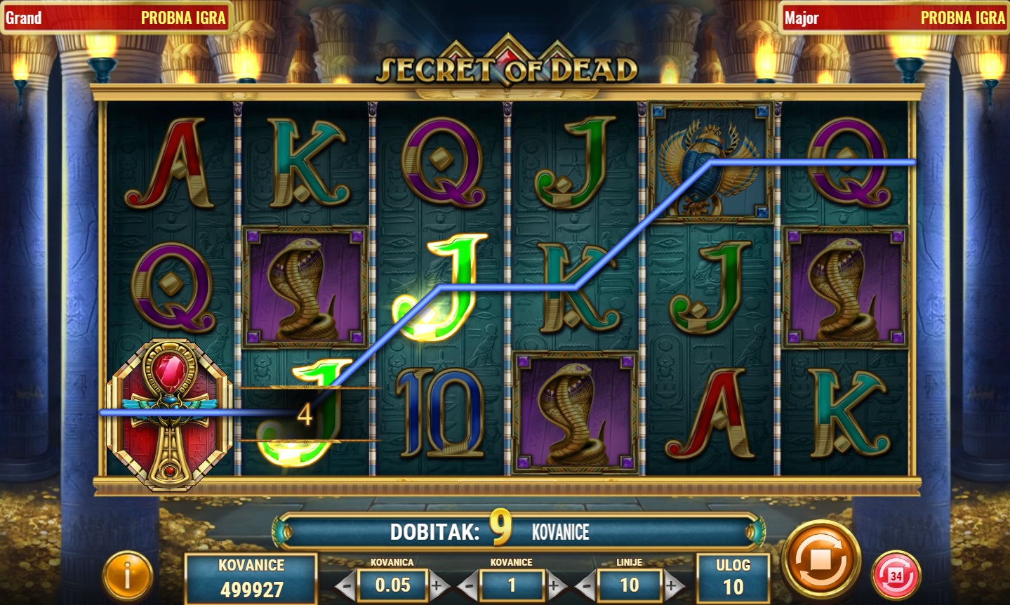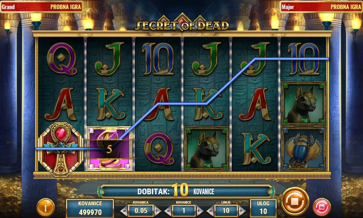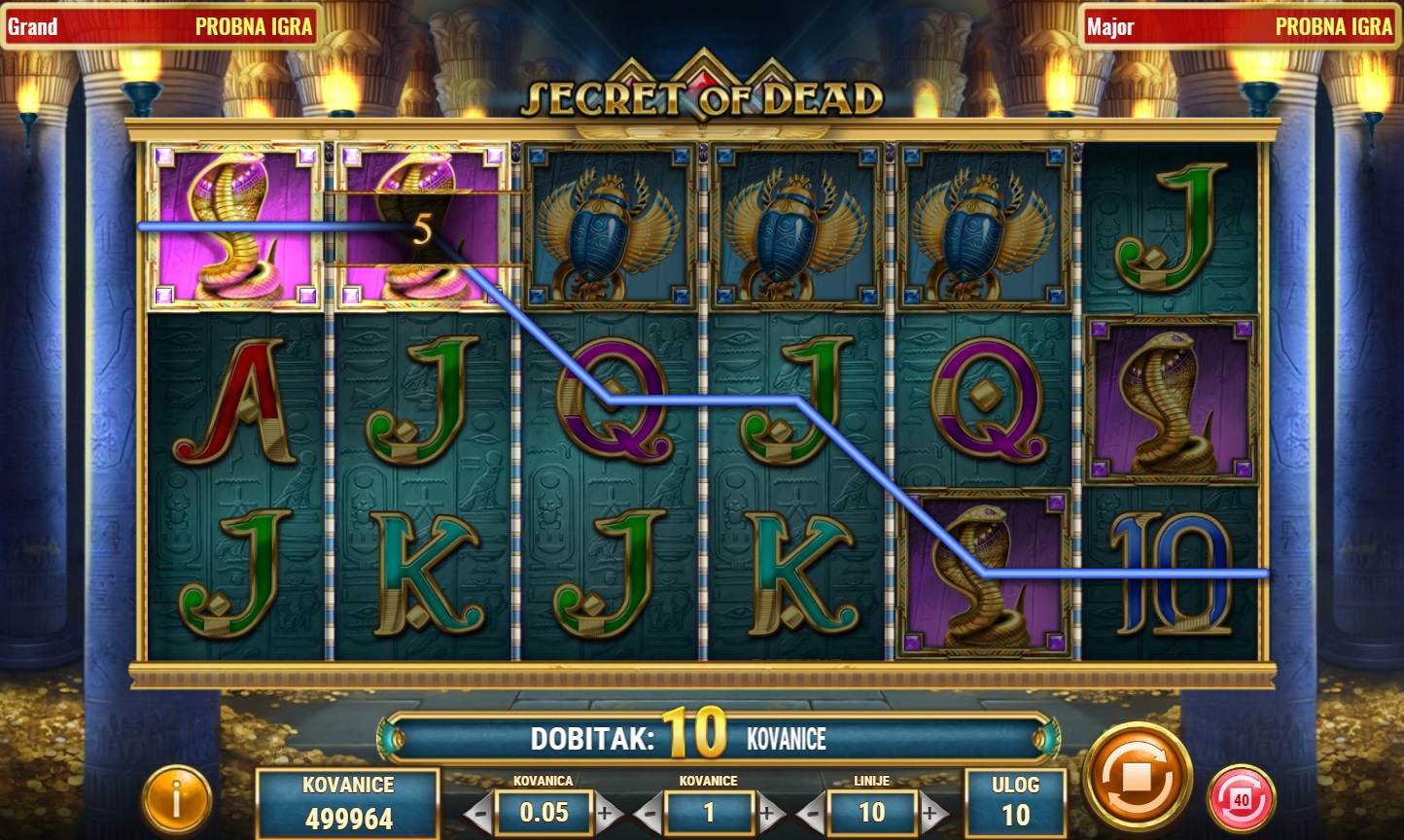 Secret of Dead je fascinantna video slot igra s tematikom drevnog Egipta, koja nudi 6 rola i 10 linija za dobitak. Ova igra omogućava igračima da otkriju bogatstva skrivena u drevnim hramovima. Simbol Scatter, predstavljen Ankhom, koji djeluje i kao Wild simbol može zamijeniti sve ostale simbole za formiranje dobitnih kombinacija. Pojavom 3 ili više Scatter simbola pokreću se bonus besplatne vrtnje, pružajući priliku za dodatne dobitke. Svaka besplatna vrtnja može donijeti specijalne šireće simbole koji povećavaju šanse za osvajanje velikih nagrada!