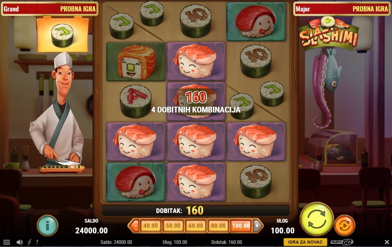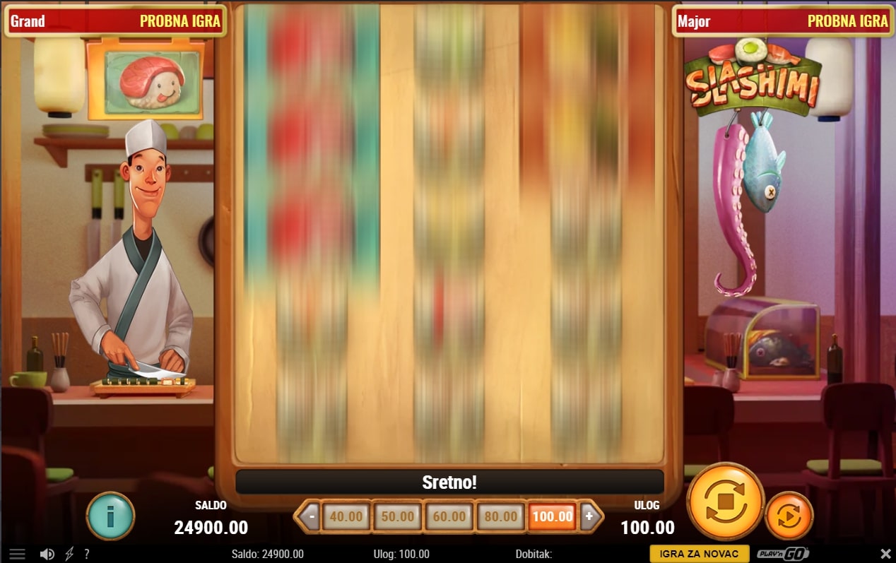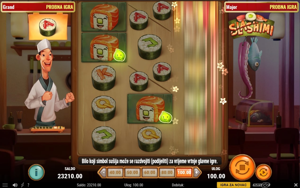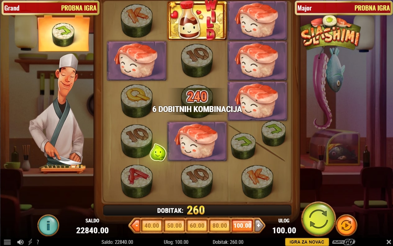 Slashimi slot je igra kulinarske tematike koja vodi u igrača u japansku kuhinju i njihovu tradiciju pripreme hrane. Na meniju je sushi, a najviše isplaćuju oni simboli sushija koji imaju lice. Igra uz to sadrži poseban simbol soja umaka koji mijenja druge simbole, dok wasabi pojavom na tri mjesta na ploči osvaja igraču besplatne vrtnje. Također, kuhar priprema dva za jedan specijal, odnosno prije svake vrtnje nausmično se bira simbol koji će se podijeliti. Zaigraj Slashimi te osvoji slasne nagrade!