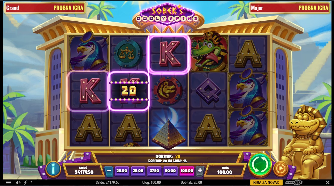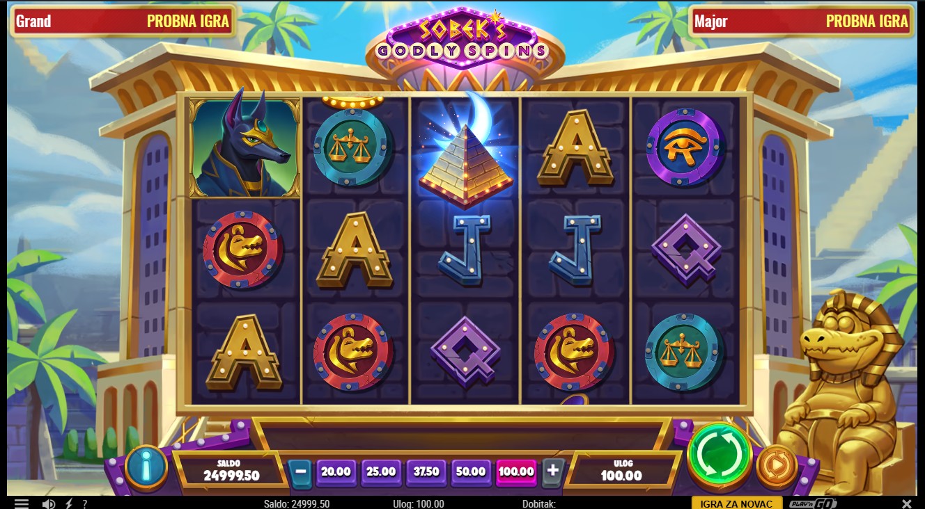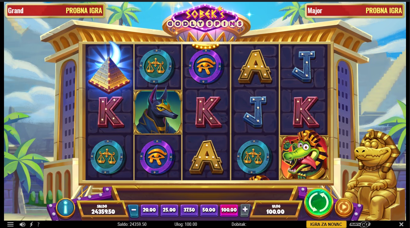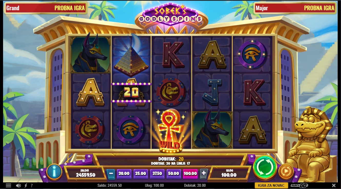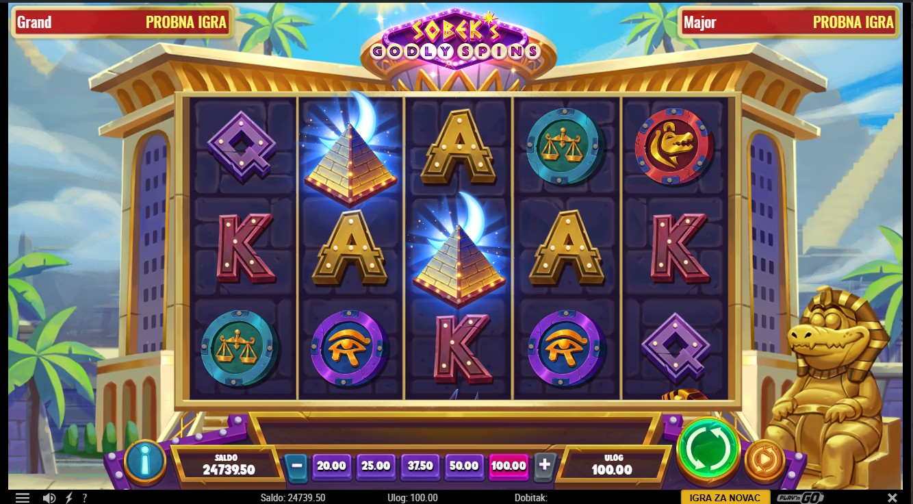 Zakorači u svijet drevnog Egipta uz Sobek’s Godly Spins providera Play’n GO, slot igru s 5 rola i 30 isplatnih linija. Wild simbol Ankh zamjenjuje sve ostale simbole osim scattera i može sudjelovati u više dobitnih kombinacija, dok scatter simbol Pyramid pokreće Godly Wheel, kotač koji određuje broj free spinova. Tijekom free spinova nasumično se dodjeljuje množitelj do 10x, a dva ili više Wild Scatter simbola pokreću Eclipse Spins, besplatne vrtnje unutar free spinova koje zadržavaju prethodni množitelj. Eclipse Spins mogu se pokretati unutar sebe, a maksimalni broj vrtnji može doseći 150. Igra uključuje progresivni jackpot s razinama Grand i Major za dodatno uzbuđenje svakoj rundi.