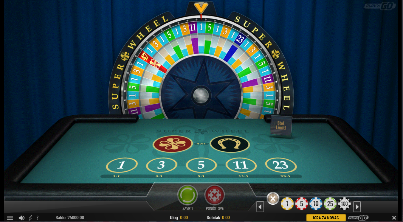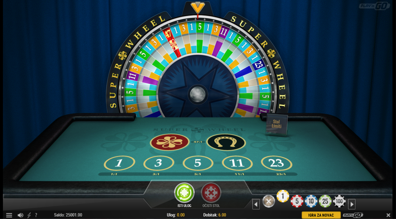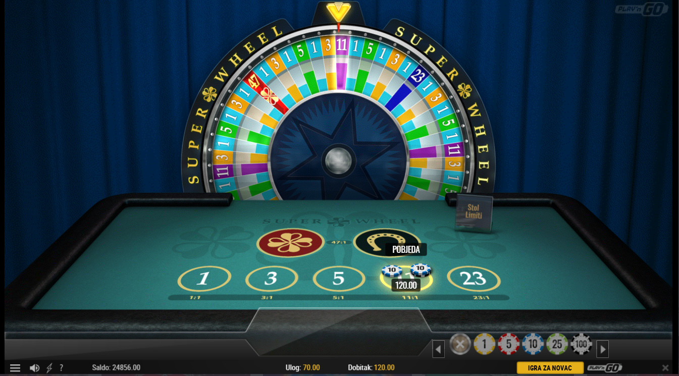 Super Wheel,od providera PlayNGo, je igra koja se vrti oko jednog velikog pitanja: gdje će kotač stati. S jarkim bojama, jednostavnim pravilima i brzom akcijom, savršena je za one koji vole čistu sreću i trenutne rezultate. Na kotaču se nalaze brojevi i simboli, a svaki od njih donosi različite isplate. Igra je vizualno privlačna i bez dodatnih komplikacija. Samo odaberi svoj ulog i gledaj kako se sve okreće u tvoju korist.