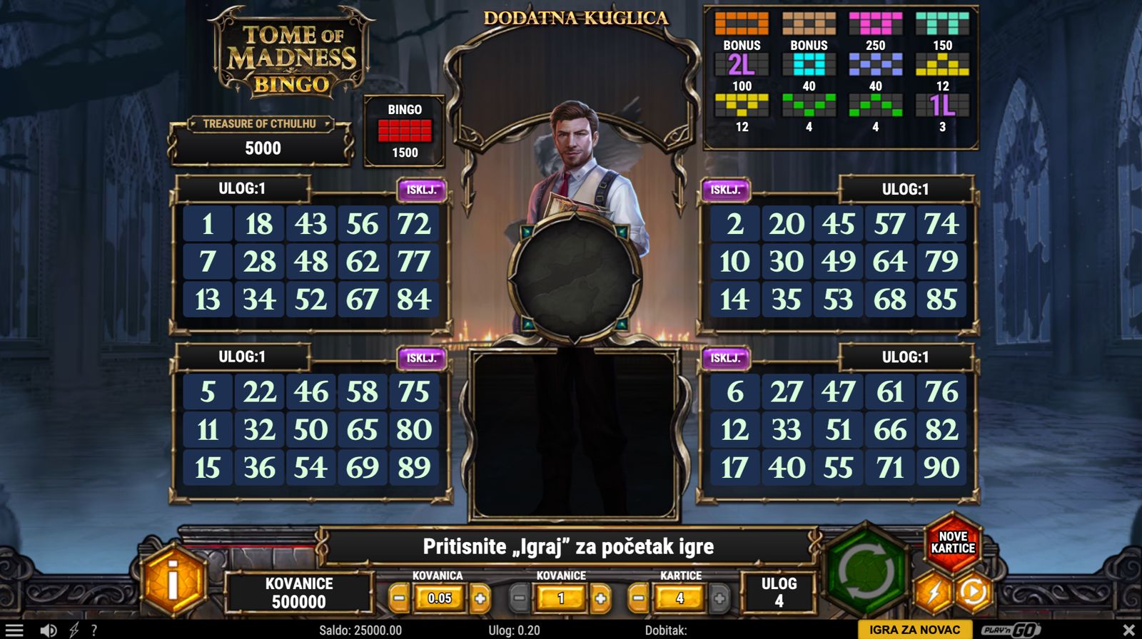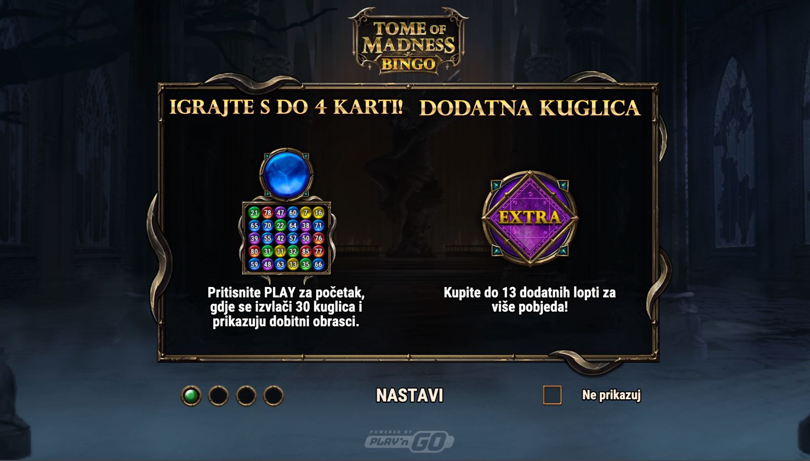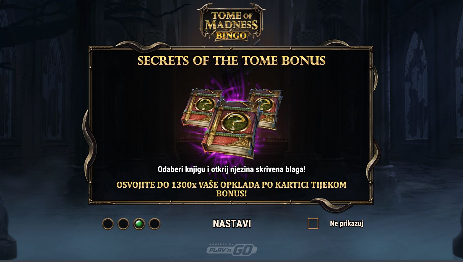 Uroni u mistični svijet binga uz Tome of Madness Bingo, igru providera Play’n GO koja spaja klasičnu bingo mehaniku s tematskim elementima moći i tajanstvenih simbola. Ova igra donosi drugačiji tip kazino iskustva gdje umjesto standardnih slotova koristiš bingo kartice za ostvarivanje dobitaka dok pratiš nasumično izvlačene brojeve. Vizualno privlačan dizajn s motivima čarolija, knjiga mračnih znanja i simbolima koji evociraju tmurnu, mističnu atmosferu čine igru zanimljivom i dinamičnom. Iako igra ne uključuje jackpot, nudi brojne prilike za osvajanje nagrada kroz različite načine dobitaka na bingo karticama.