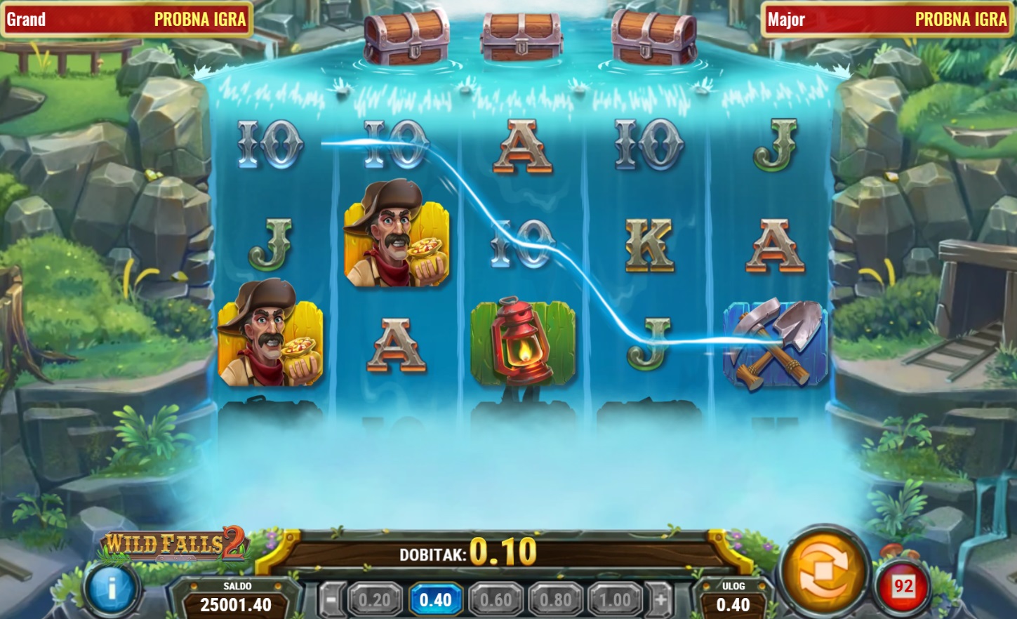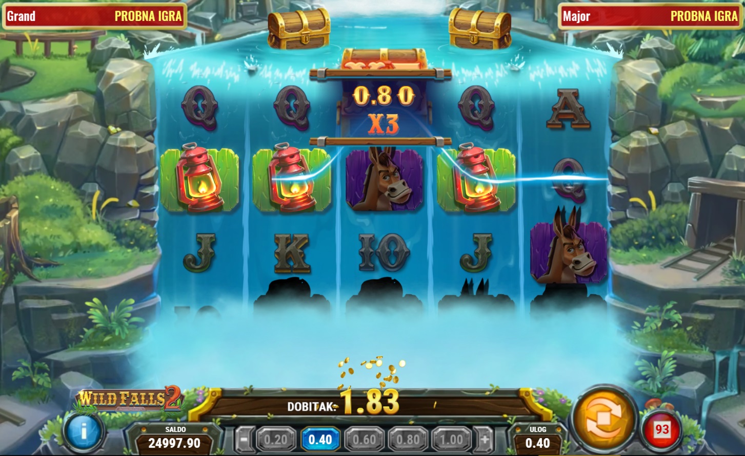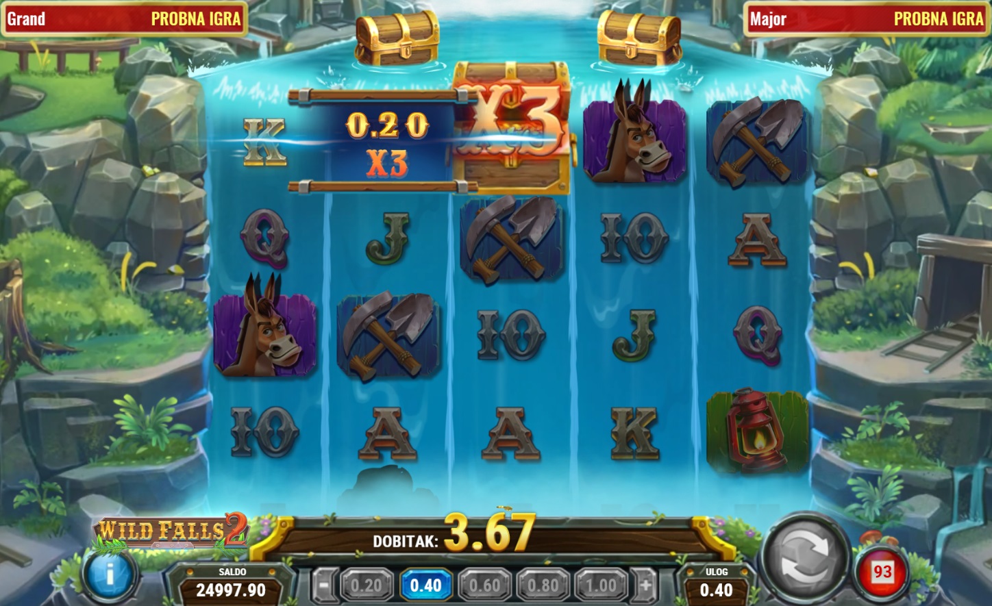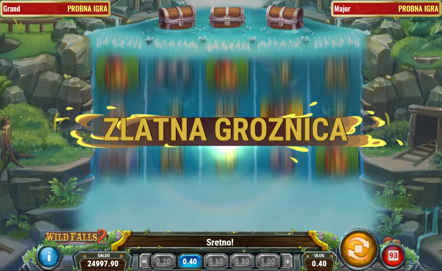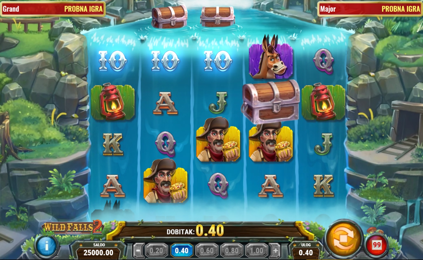 Gameplay u Wild Falls 2 je jednostavan, ali pun akcije. Igra se na 5 rola i 20 do 40 dobitnih linija, a škrinje su ključni simboli jer su i Wild i Scatter. Kada se 1 ili 2 škrinje zaustave na rolama, aktivira se Brzi Re-spin, pri čemu se škrinje fiksiraju i proširuju role. Uz 3 škrinje, dobivaš bonus besplatne vrtnje Rijeke Zlata, gdje škrinje polako klize niz role, pružajući više prilika za dobitak. Zlatne škrinje donose multiplikatore, a u bonusu Nevjerojatne Rijeke Zlata multiplikatori se mogu povećavati do X9.