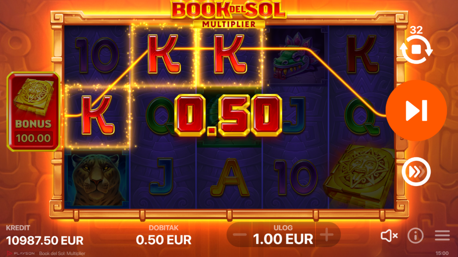 U igri Book del Sol: Multiplier, doživjet ćeš uzbuđenje uz specijalne proširujuće simbole i progresivne množitelje. Ova video slot igra nudi 10 fiksnih linija za dobitak s raznolikim bonusima. Pomoću simbola Scatter možeš aktivirati besplatne vrtnje koje donose još više šansi za osvajanje velikih nagrada. Skupljaj simbole Sunca kako bi nadogradio vrijednost množitelja i povećao svoje dobitke. Uz fascinantnu grafiku i uzbudljivu igru, Book del Sol: Multiplier pruža nezaboravno iskustvo.