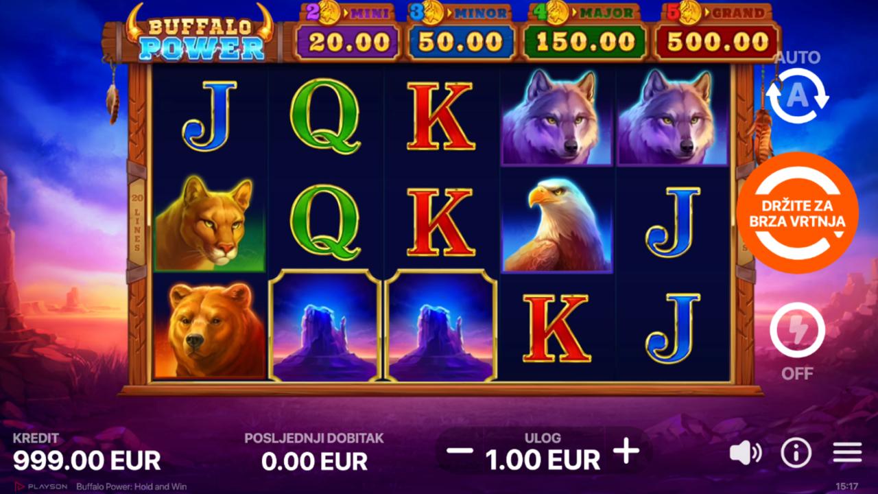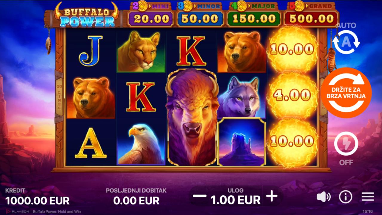 Zakorači u svijet divljine i moćnih životinja uz Buffalo Power: Hold and Win, slot igru providera Playson koja donosi atmosferu prerije, bizona i prirodne snage. Vizualno atraktivna igra kombinira klasičnu tematiku s modernim efektima i dinamičnim bonus značajkama. Iako igra ne uključuje jackpot, Buffalo Power: Hold and Win nudi solidan potencijal dobitaka kroz posebne funkcije i multiplikatore.