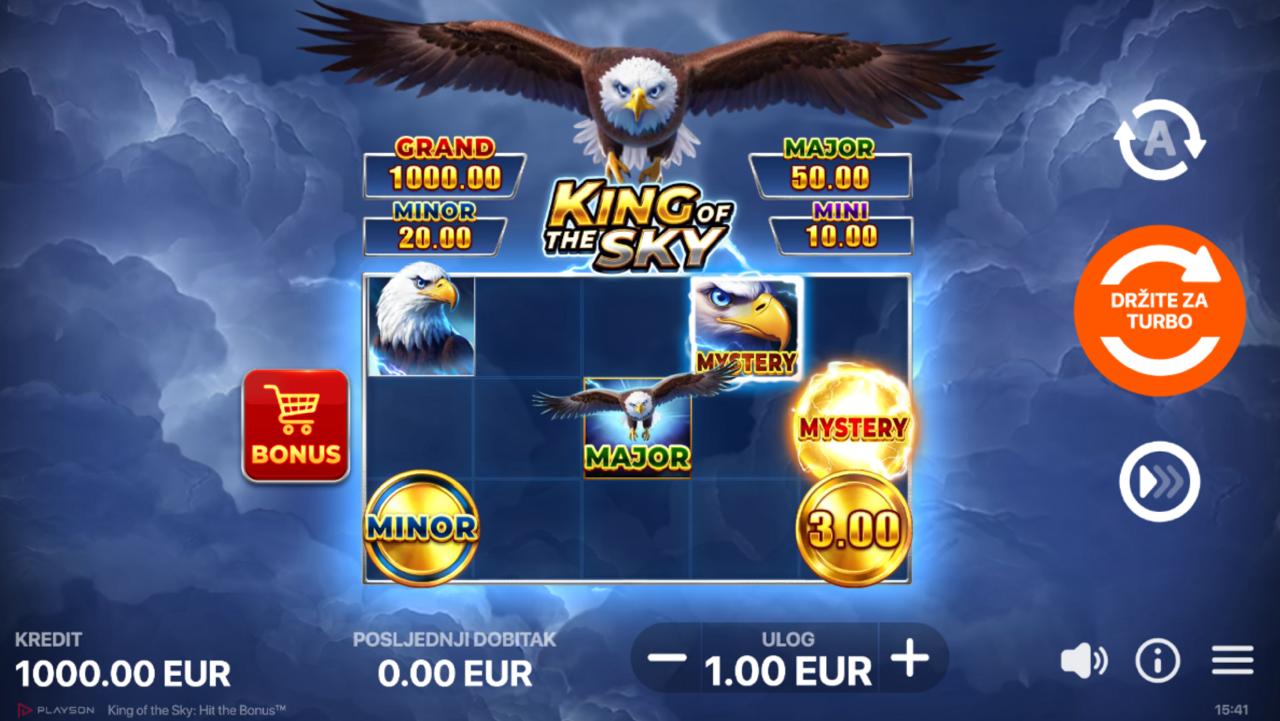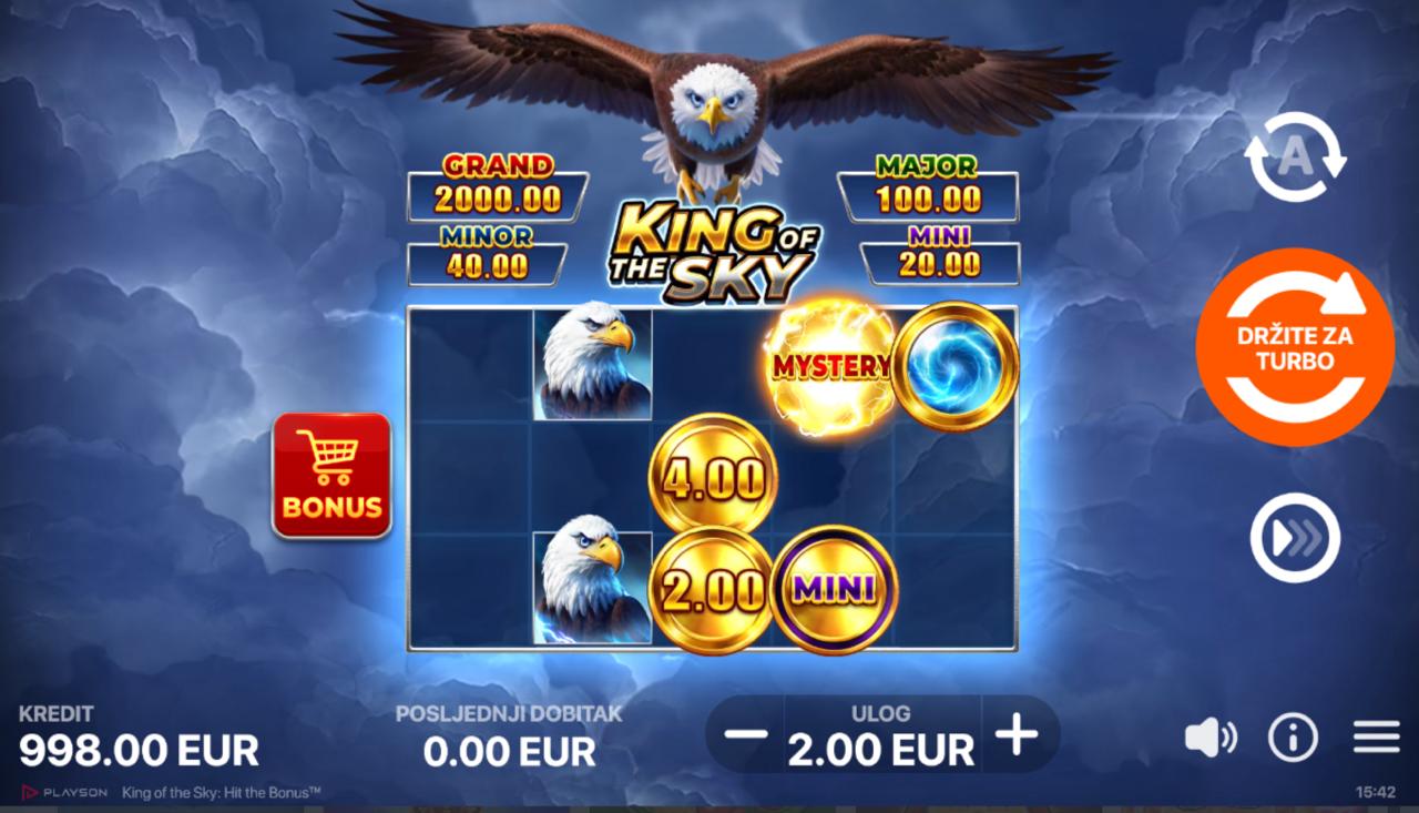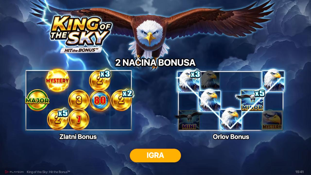 Uroni u nebesku avanturu uz King of the Sky: Hit the Bonus, slot igru providera Playson koja donosi atmosferu oluja, orlova i zlatnih nagrada. Igra se fokusira na bonus mehanike umjesto klasičnih linija, stvarajući intenzivno i dinamično iskustvo igranja. Iako igra ne uključuje jackpot, King of the Sky: Hit the Bonus nudi vrlo visok potencijal dobitaka kroz dvije bonus igre, multiplikatore i posebne simbole.