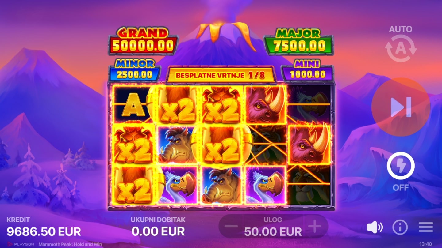 Mammoth Peak: Hold & Win slot je igra koja vodi igrača u prapovijesni svijet mamuta i drugih izumrlih vrsta. Upravo simbol mamuta djeluje kao Wild i mijenja druge simbole u potrazi za vhunskim nagradama, dok simbol Scattera može igraču osvojiti besplatne vrtnje. Igra sadrži i bonus simbol meteora koji može aktivirati značajku vulkana i igrača odvesti do Bonus igri, ali i prilika za Jackpot koje se ne propuštaju. Zaigraj Mammoth Peak: Hold & Win i uroni u svijet fantastičnih dobitaka.