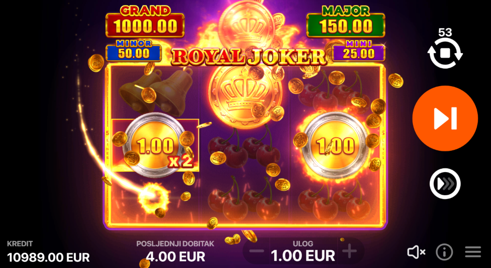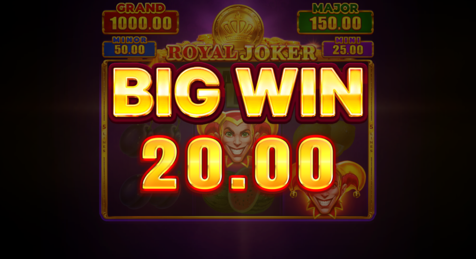 Royal Joker: Hold and Win vodi te u svijet prepun bonusa i uzbuđenja. Ova slot igra s 25 linija za dobitak nudi uzbudljive bonus runde koje se aktiviraju s 3 Bonus simbola. S Royal Bonus značajkom povećaj svoje šanse za velike dobitke. U Bonus Igri, samo Bonus, Royal Bonus i Joker simboli pojavljuju se na bubnjevima, a svaki novi simbol resetira broj ponovnih vrtnji na 3. Uživaj u spoju zabave i velikih nagrada s Royal Joker: Hold and Win!