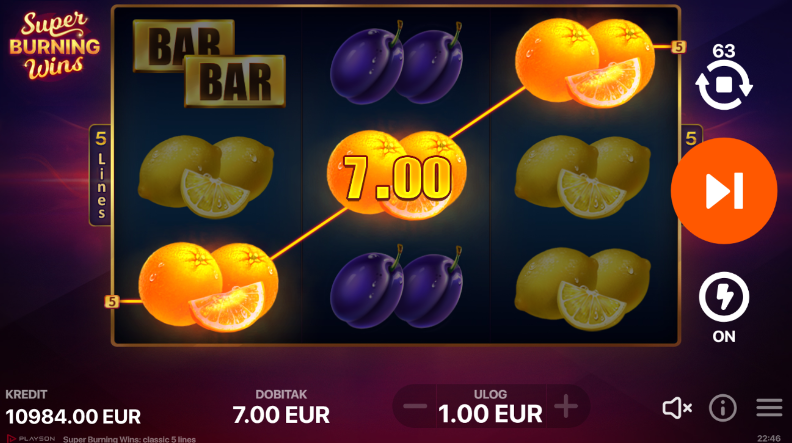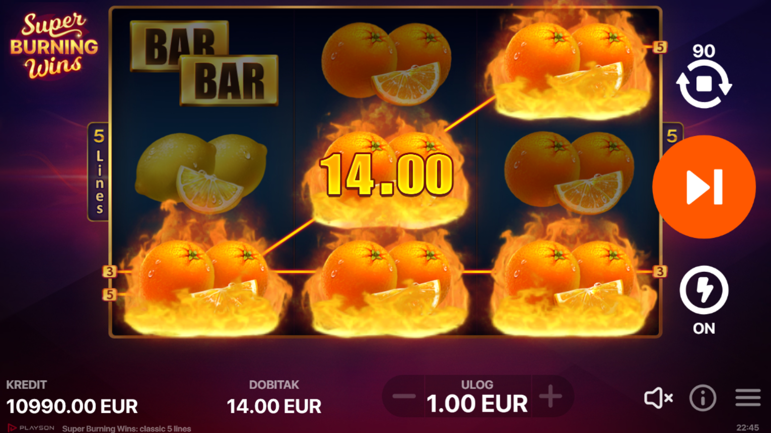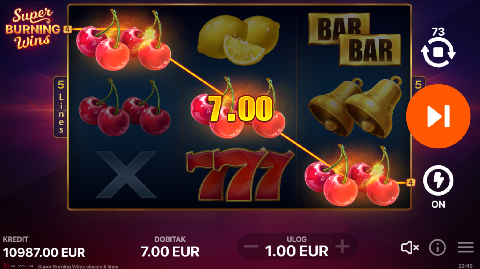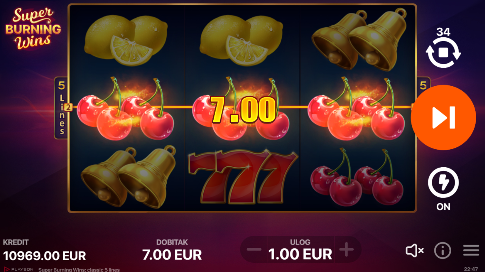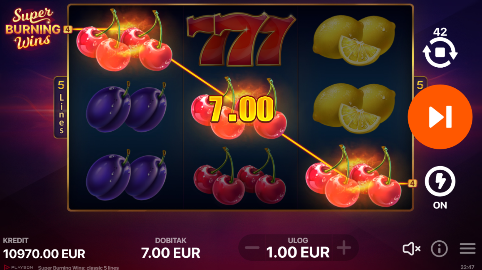 U igri Super Burning Wins, uživat ćeš u klasičnom 3x3 voćnom slotu s pet fiksnih linija za dobitak. Ova igra donosi jednostavan, ali uzbudljiv gameplay koji uključuje udvostručenje dobitka kad zaslon preplave identični voćni simboli. Uz prepoznatljive voćne simbole i crvene sedmice, tu je i prazni simbol koji dodatno doprinosi autentičnom doživljaju!