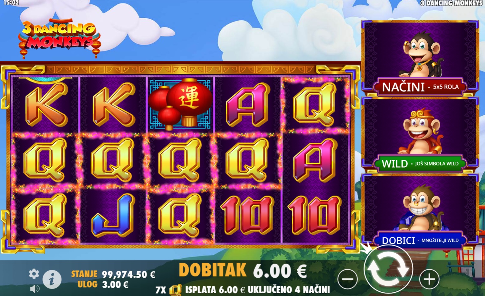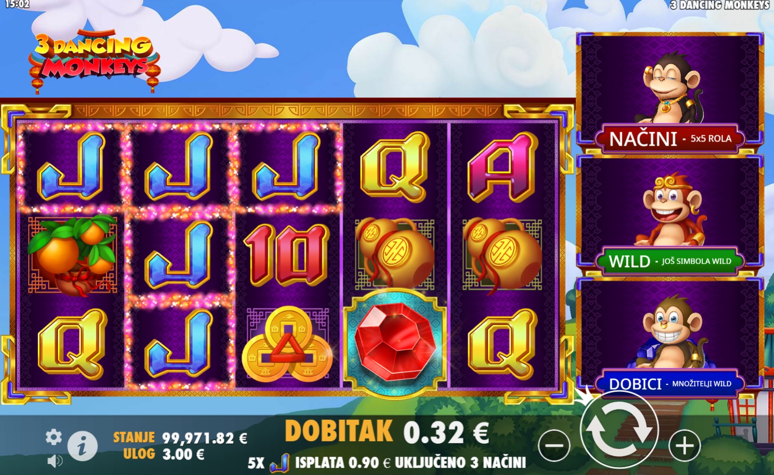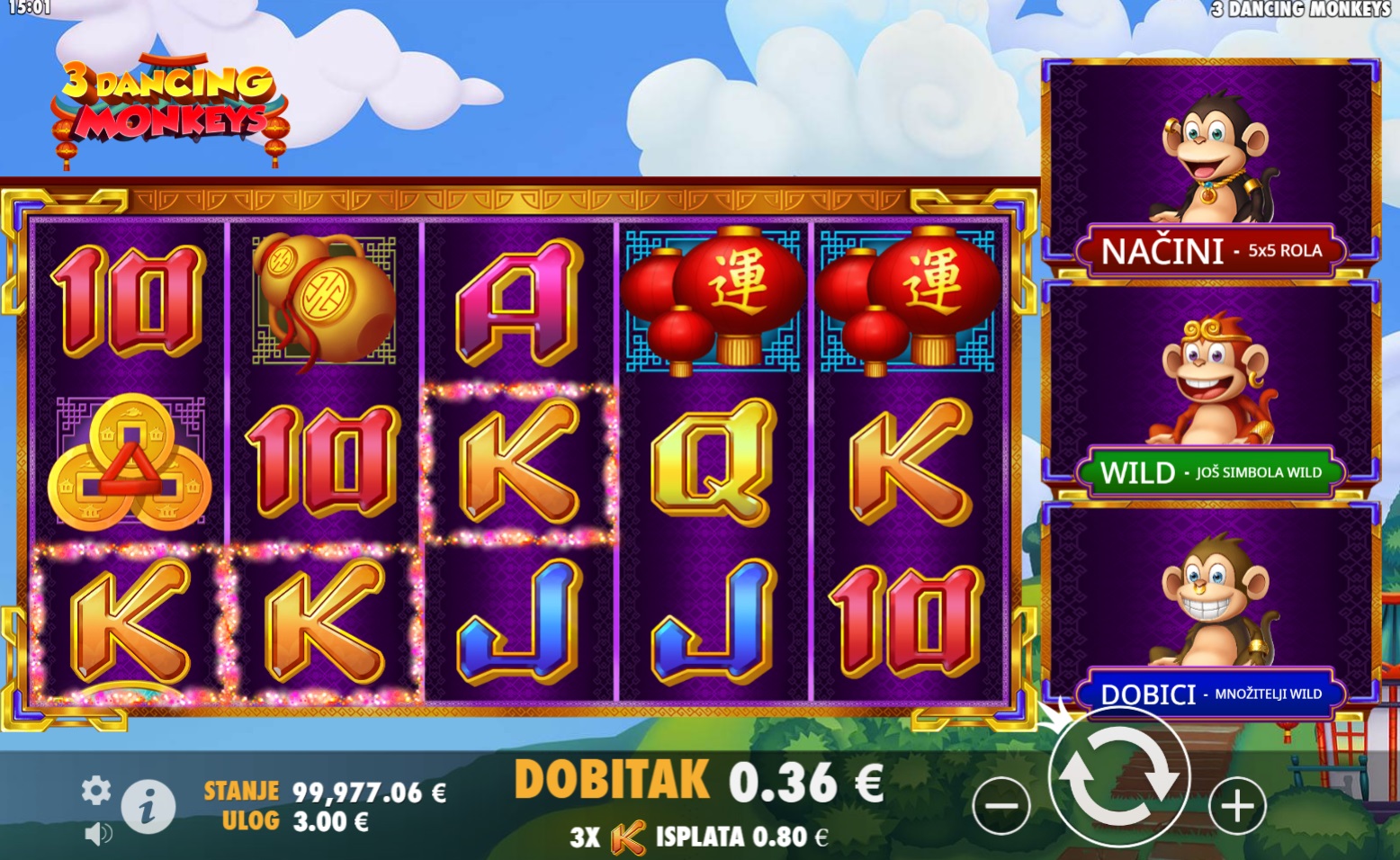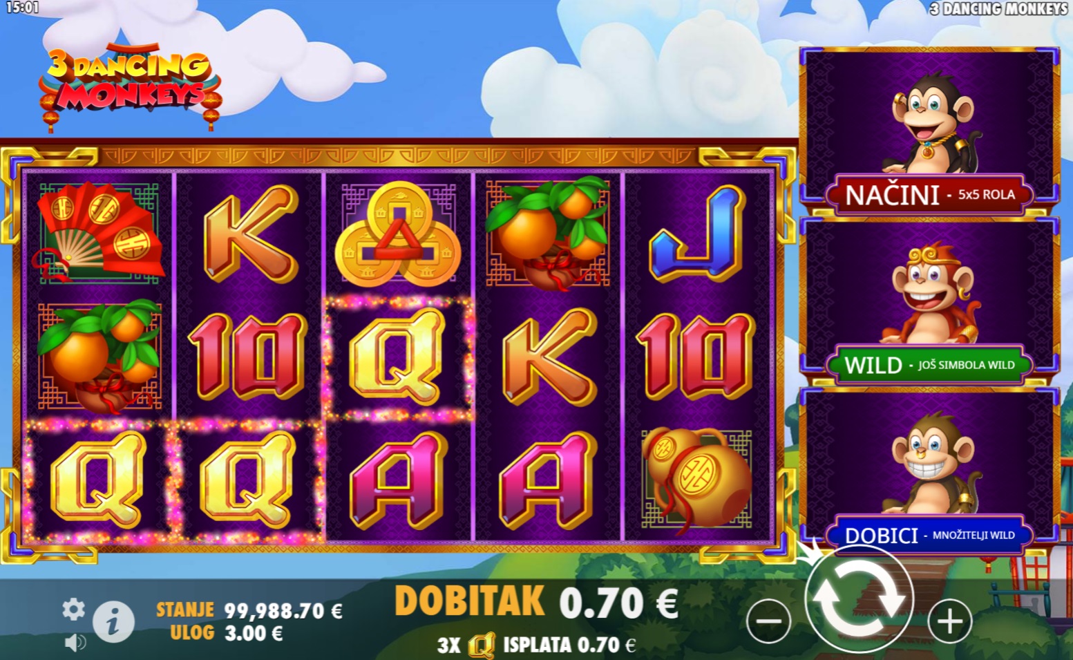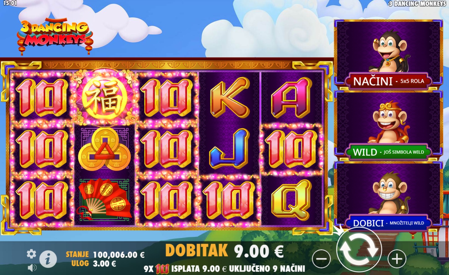 U igri 3 Dancing Monkeys™, uživat ćeš u raznolikim bonusima i šarenim simbolima. Svi simboli donose dobitak s lijeva na desno na susjednim poljima, počevši od krajnje lijeve role. Wild simbol zamjenjuje sve simbole osim simbola dragulja i pojavljuje se na 2., 3. i 4. roli. Dobici se dodjeljuju za kombinacije susjednih simbola. Igra nudi 243 načina za dobitak, a posebna značajka su besplatne vrtnje koje se mogu pokrenuti uz pomoć dragulja. Igra je dinamična i puna iznenađenja, savršena za sve ljubitelje slot igara!