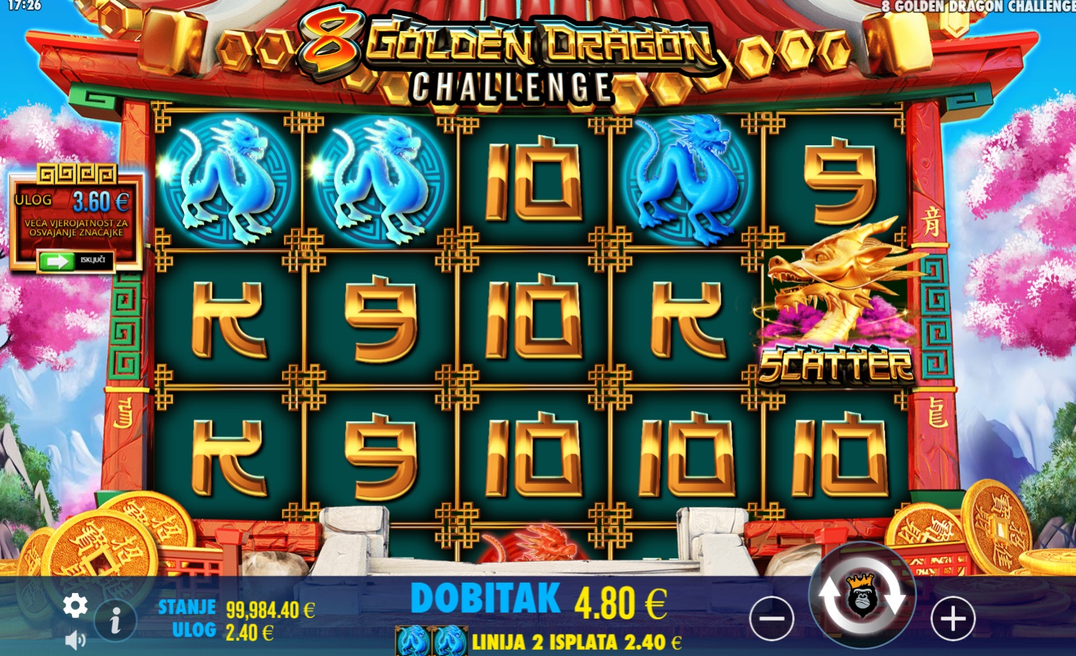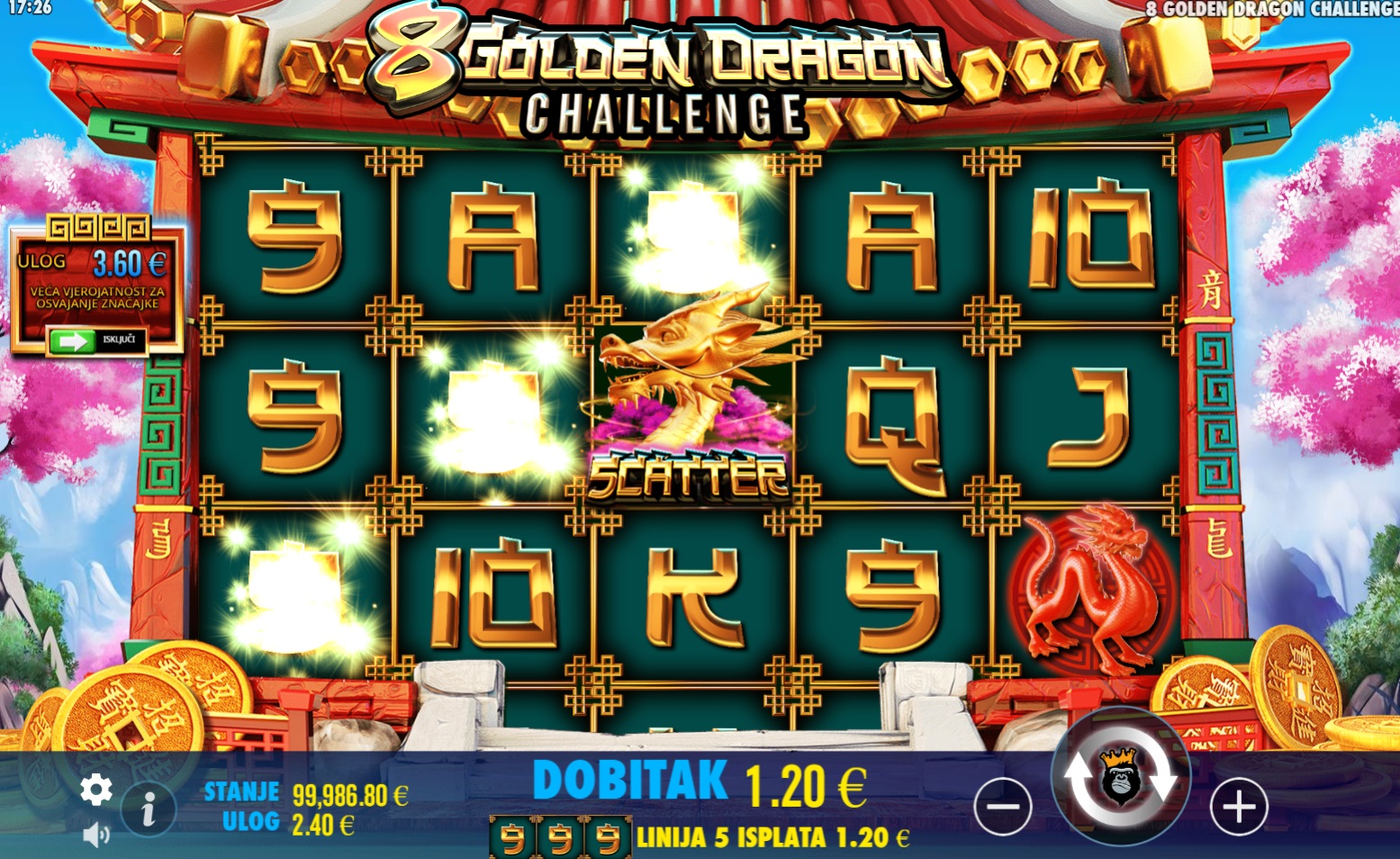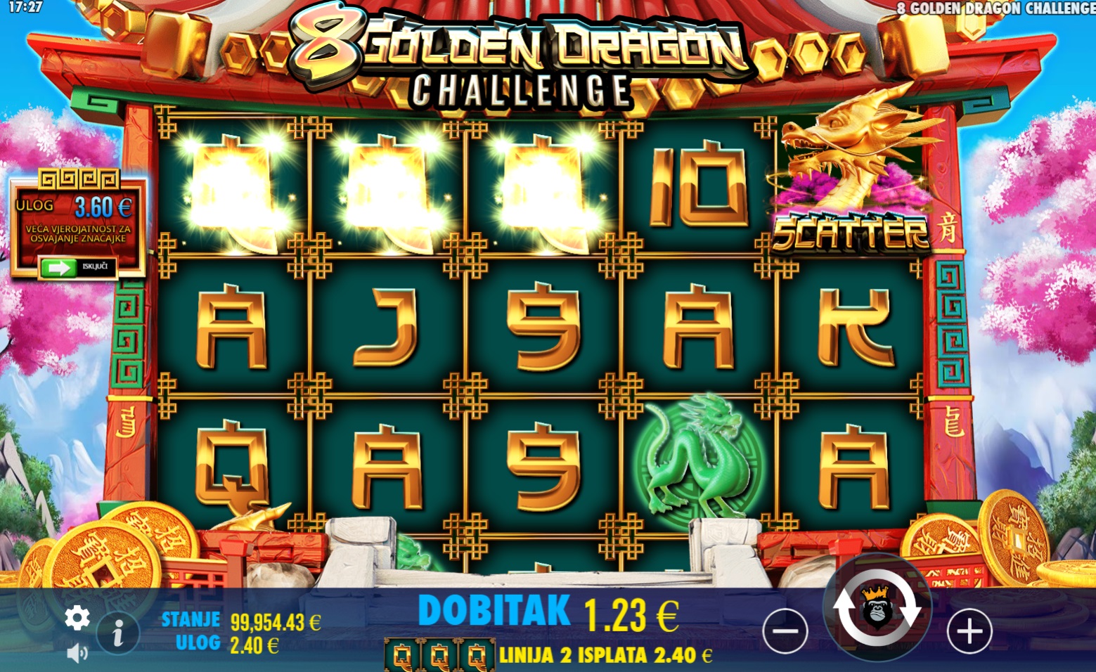 8 Golden Dragon Challenge je uzbudljiva slot igra koja te vodi na putovanje u svijet zmajeva i velikih dobitaka. Igra se na klasičnim valjcima gdje se dobitne kombinacije broje s lijeva na desno, počevši od krajnje lijeve role. Ključ igre su posebni Scatter simboli koji se pojavljuju samo na 1., 3. i 5. roli. Kada prikupiš tri Scatter simbola, aktiviraš bonus značajku koja zamjenjuje uobičajene role s osam malih slotova veličine 3x3. U ovoj bonus igri, samo simboli zmaja i prazna polja dolaze na male slotove, pružajući ti šansu za dodatne dobitke. Prati simbole zmaja i otkrij koliko možeš osvojiti u ovoj jedinstvenoj igri!
