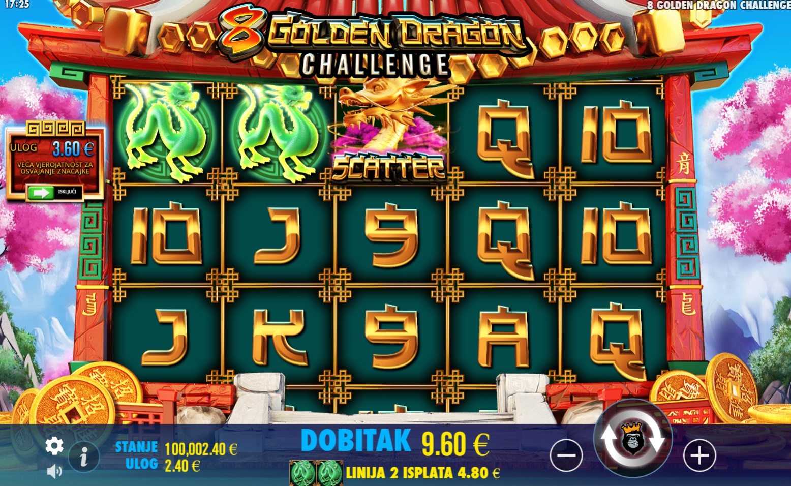 Igra 8 Golden Dragon Challenge ima RTP od 96.01%, što znači da nudi dobre šanse za povratak uloga tijekom vremena. Volatilnost je srednja, što znači da možeš očekivati česte, ali manje dobitke. Ova igra je savršena za igrače koji vole balans između rizika i nagrada.