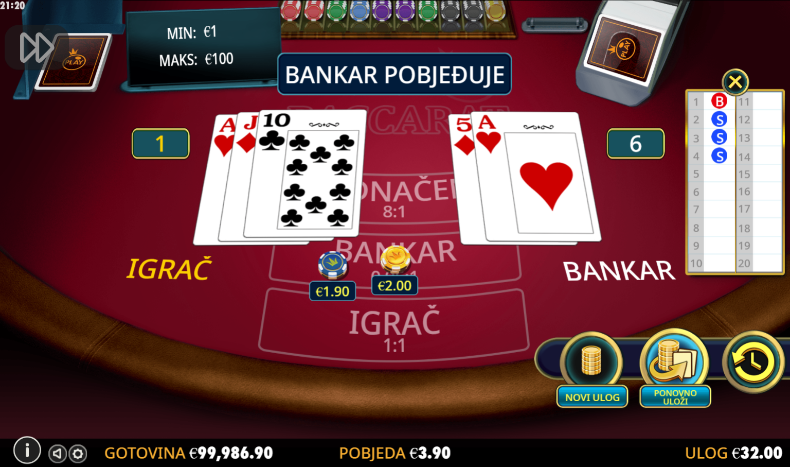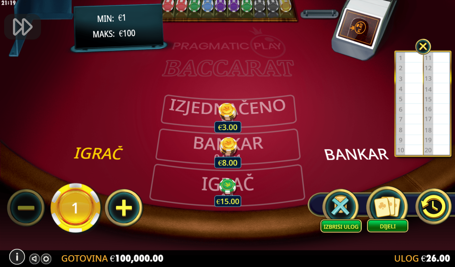 Igra Baccarat je vrlo jednostavna. U svakoj rundi dijele se karte igraču i bankaru, a cilj je imati ruku s ukupnim brojem bodova što bliže 9. Ako ukupni zbroj prelazi 9, odbija se 10 bodova (npr. 15 postaje 5). Možeš staviti ulog na pobjedu igrača, bankara ili remi. Bankar i igrač imaju posebna pravila za izvlačenje treće karte, ali to ti ne treba brinuti jer sve ide automatski. Jednostavna, brza i napeta igra savršena je za one koji vole uzbuđenje s malo taktike.