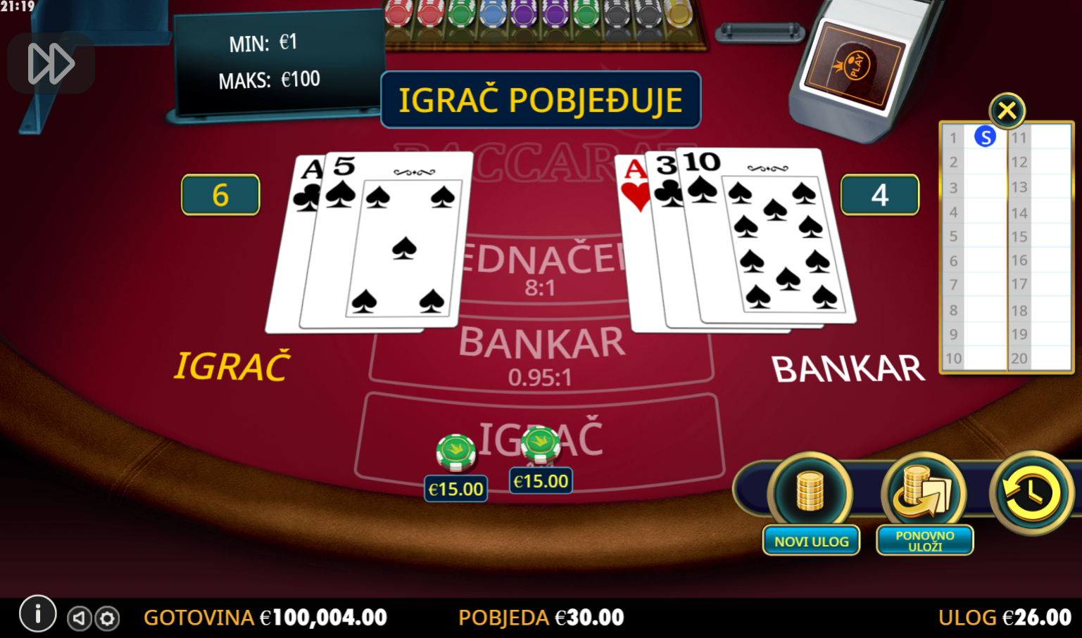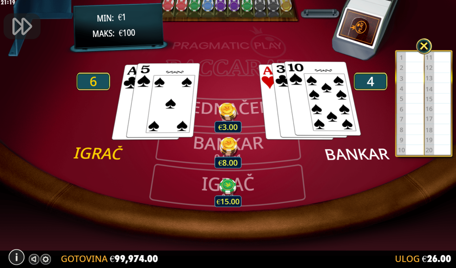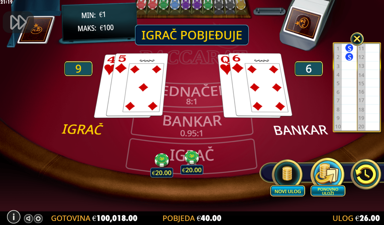 Baccarat je klasična kartaška igra u kojoj ćeš se susresti s napetim trenucima dok predviđaš ishod svake runde. Tvoj zadatak je pogoditi tko će imati bolji rezultat ili hoće li runda završiti neriješeno. Pravila su jasna – igra se s osam špilova, a cilj je postići rezultat što bliži broju 9. Bodovanje karata je jednostavno: as vrijedi 1 bod, karte od 2 do 9 vrijede koliko i njihov broj, dok su desetke i figure bez bodova. Ova brza i dinamična igra nudi razne mogućnosti za osvajanje, uz atraktivne omjere isplate.