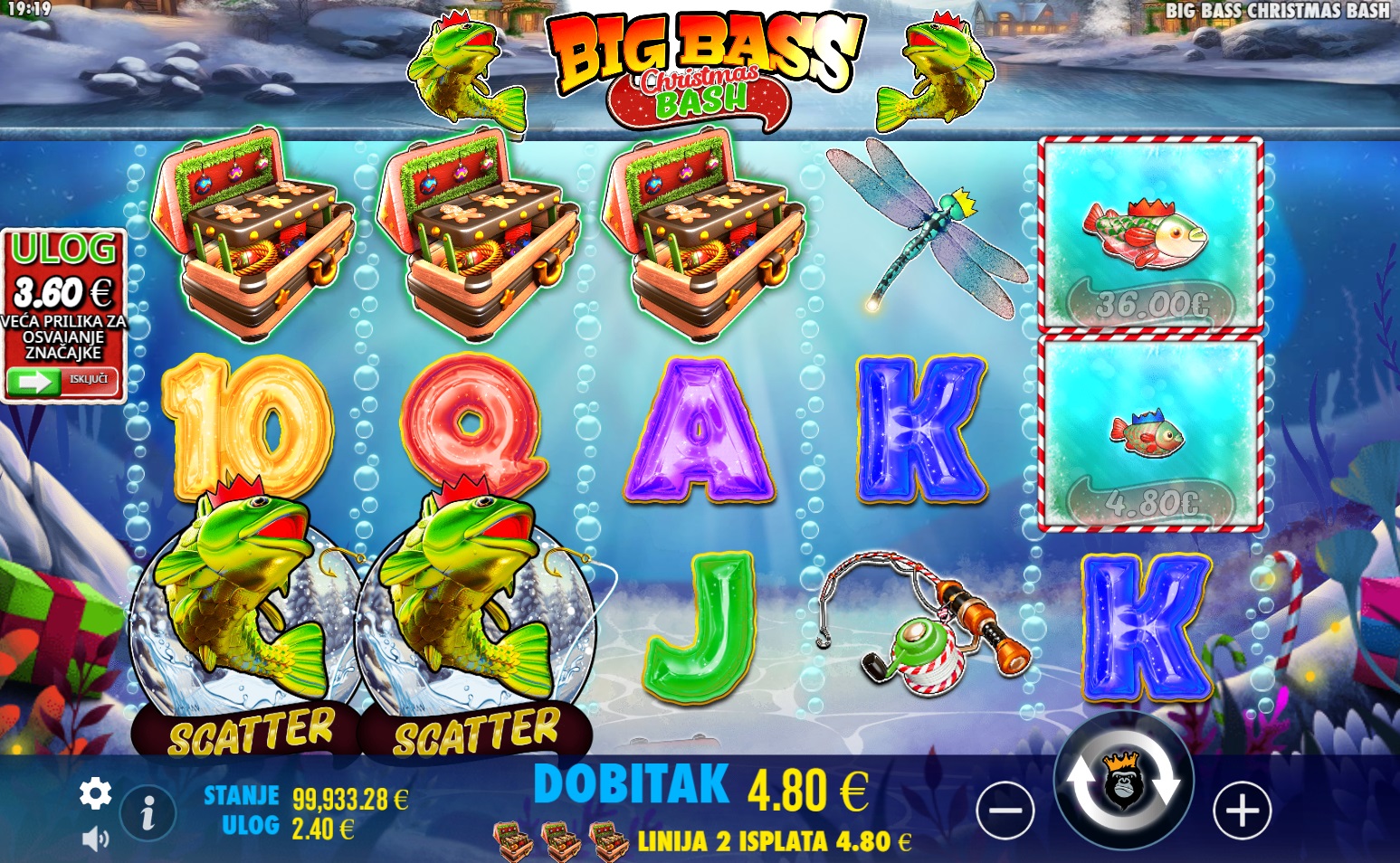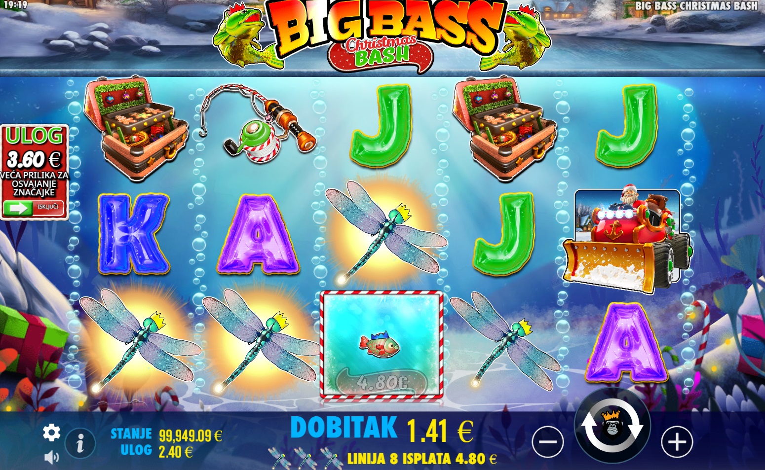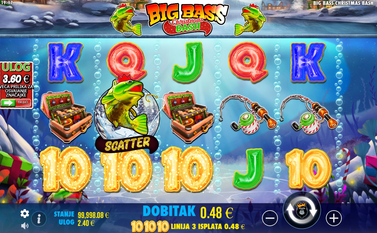 Big Bass Christmas Bash donosi blagdansko veselje uz zabavu i velike dobitke! Ova slot igra ima 5 bubnjeva i nudi 10 dobitnih linija koje se isplaćuju slijeva nadesno. Simboli Wild, koji predstavljaju ribara, pojavljuju se tijekom Besplatnih vrtnji i zamjenjuju sve simbole osim Scatter simbola. Scatter simboli mogu aktivirati značajku Besplatnih vrtnji, gdje 3, 4 ili 5 Scattera donose 10, 15 ili 20 Besplatnih vrtnji. Simboli novca s ribama donose nasumične vrijednosti do 5000x uloga, što čini ovu igru izuzetno uzbudljivom. Uz posebne značajke kao što su dinamitne vrtnje, udice i bazuke, Big Bass Christmas Bash pruža obilje prilika za velike dobitke!
