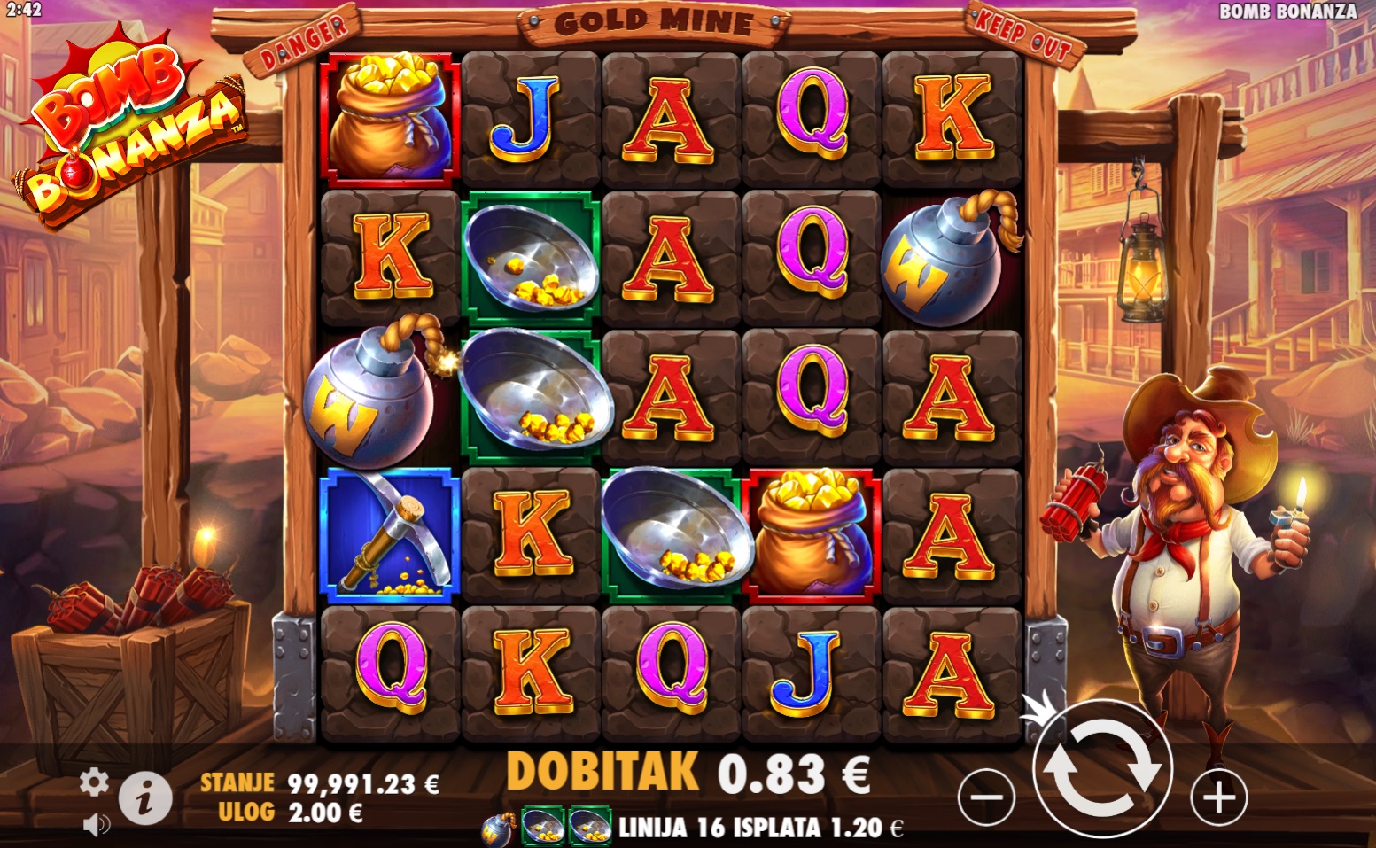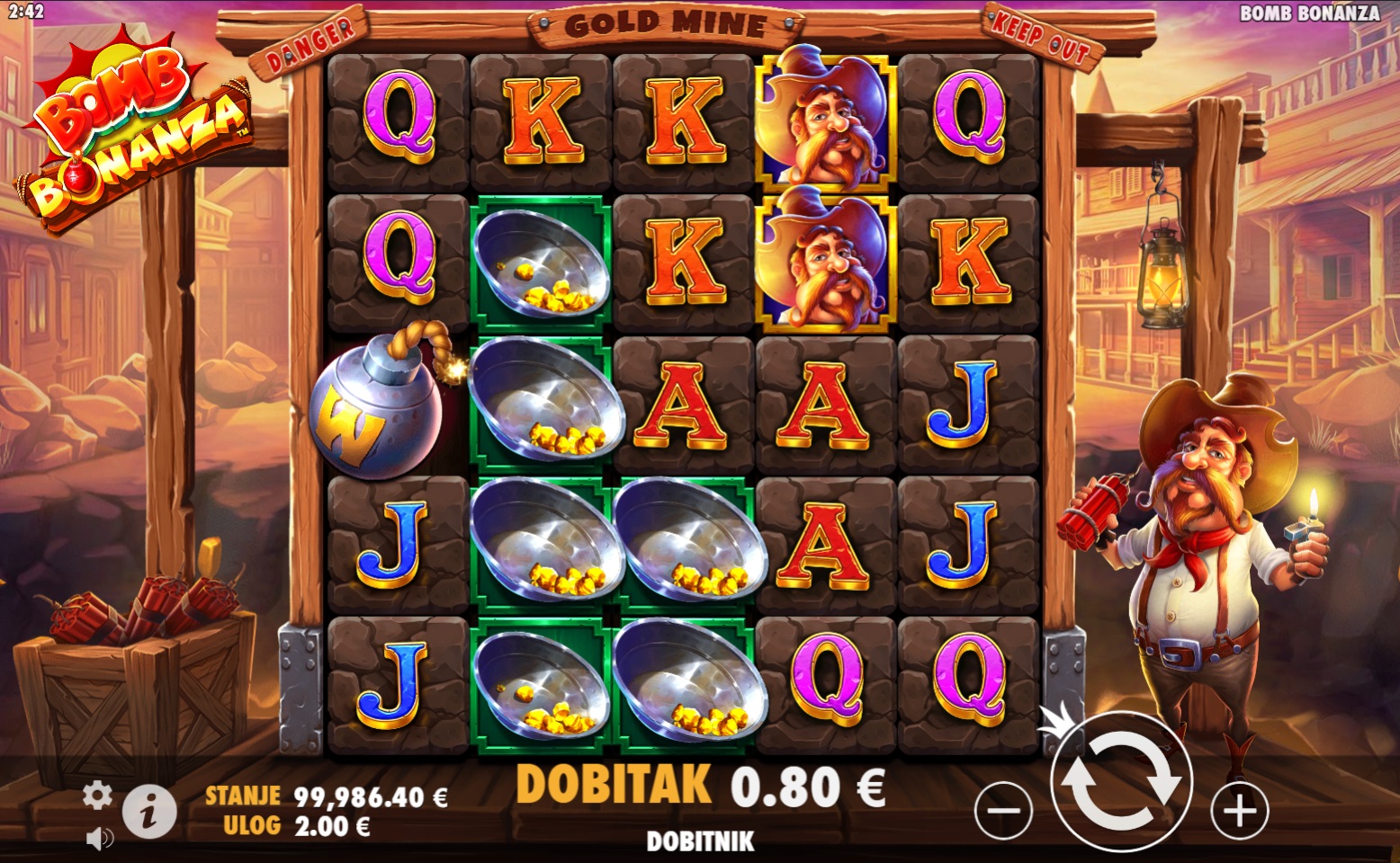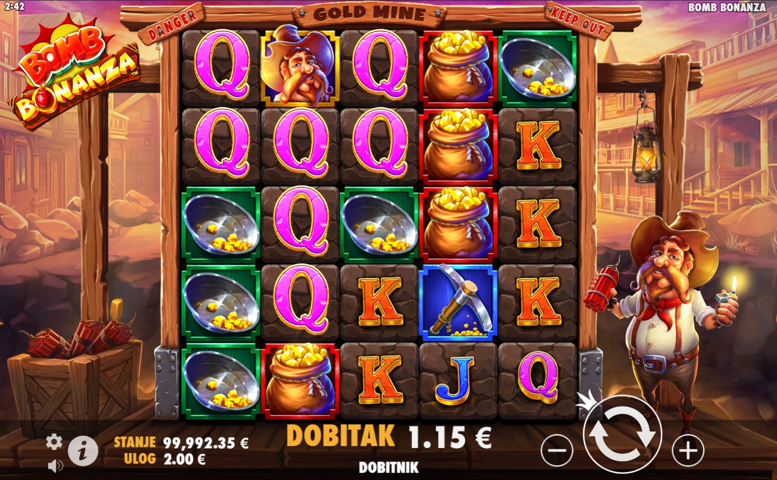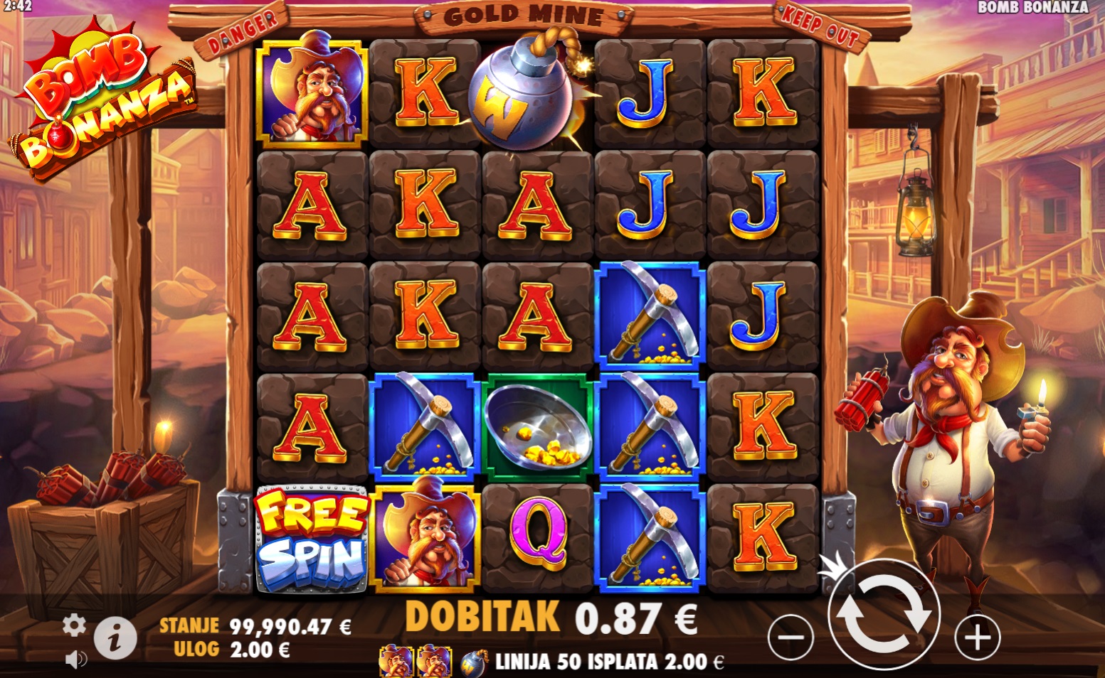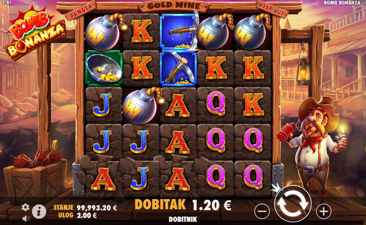 Gameplay u Bomb Bonanza je jednostavan, a istovremeno pun akcije. Šireći Wild simboli mogu se pojaviti bilo gdje na rolama i proširiti se u različitim smjerovima, povećavajući šanse za dobitak. Tri simbola Free Spin pokreću značajku besplatnih vrtnji koja počinje s 6 okretaja. Tijekom besplatnih vrtnji, prikupljaš Zlatne Grumene koji eksplodiraju i omogućuju napredovanje kroz 5 razina igre, gdje se Wild simboli šire u sve većim uzorcima, od 1x1 do 5x5. Svako napredovanje donosi dodatne besplatne vrtnje i više šansi za velike dobitke!