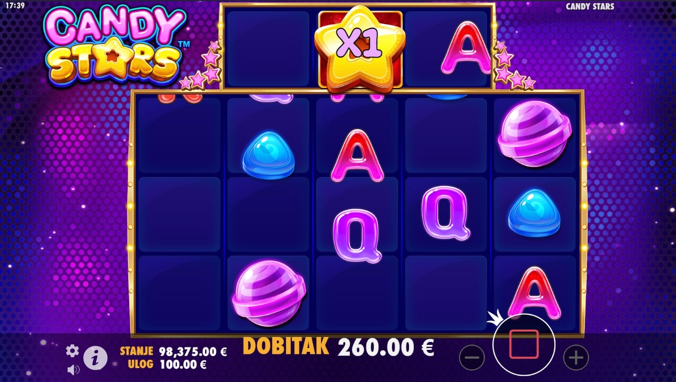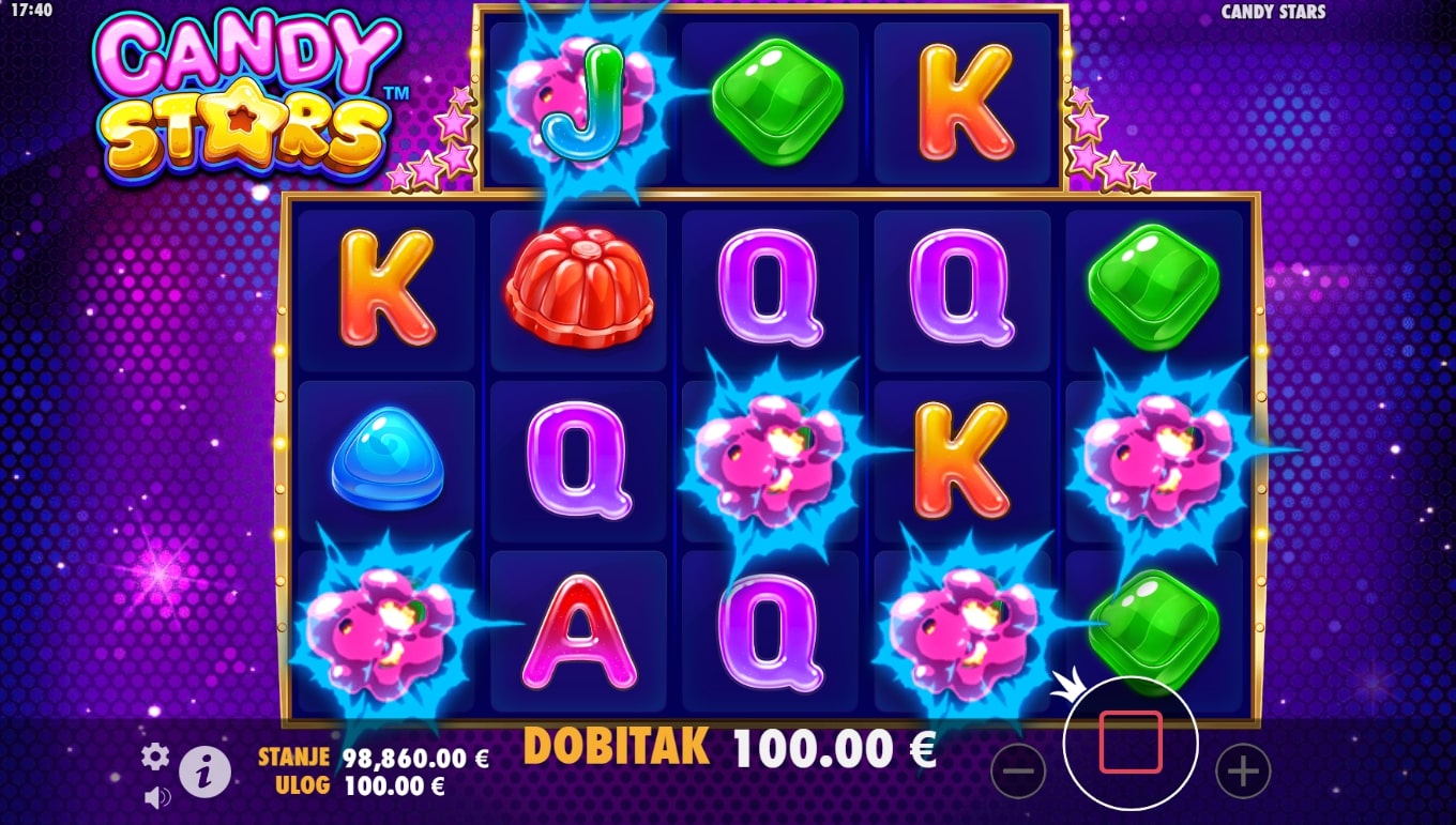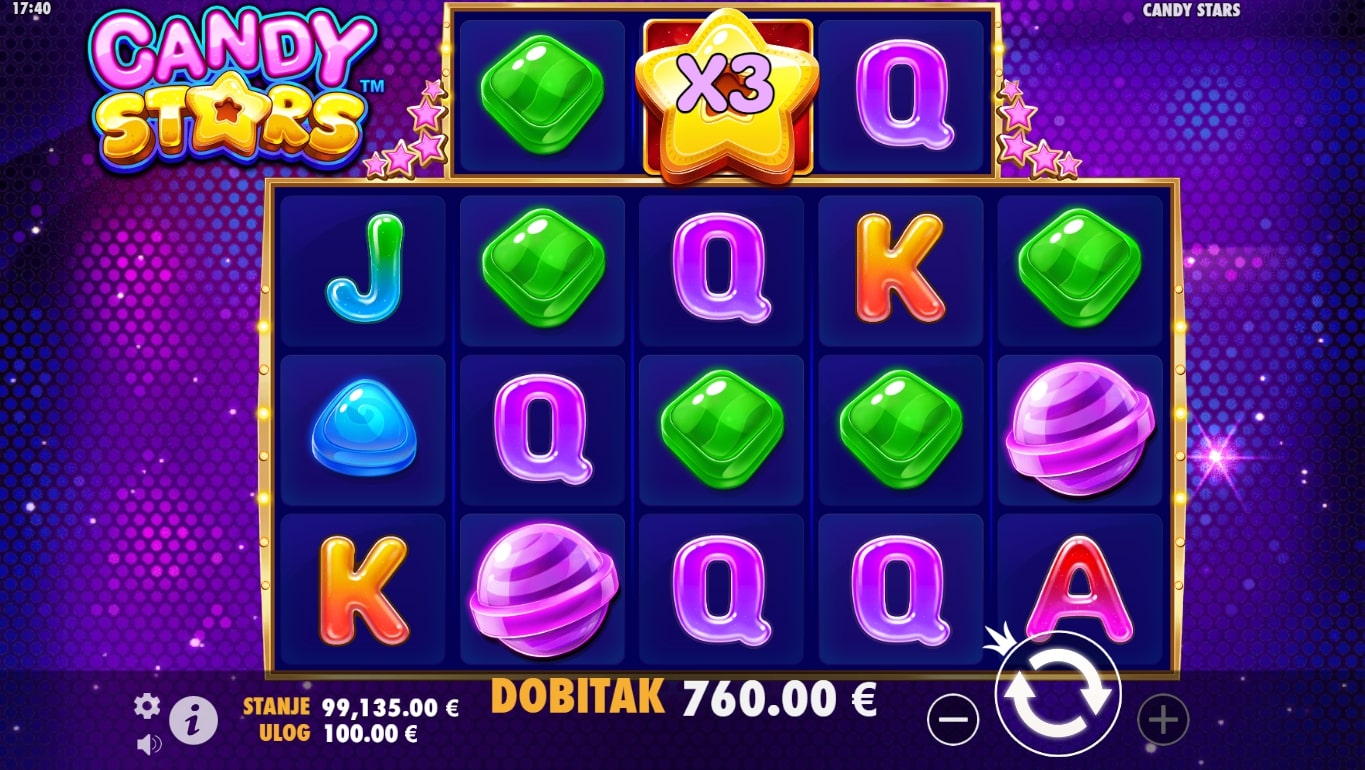 Candy Stars slot je igra tematskog karaktera koja vodi igrača u svijet slatkiša i najfinijih dobitaka. Najviše isplaćuju razne poslastice, dok simbol zvijezde služi kao zamjena za druge simbole u potrazi za dobicima. Uz to, igrač može aktivirati besplatne vrtnje javljanjem simbola dijamanta. Igra sadrži i značajku padanja, odnosno nakon isplate dobitni simboli nestaju, a na njihovo mjesto padaju novi sve dok ne ponestane dobitnih kombinacija. Zaigraj Candy Stars te osvoji slasne nagrade!