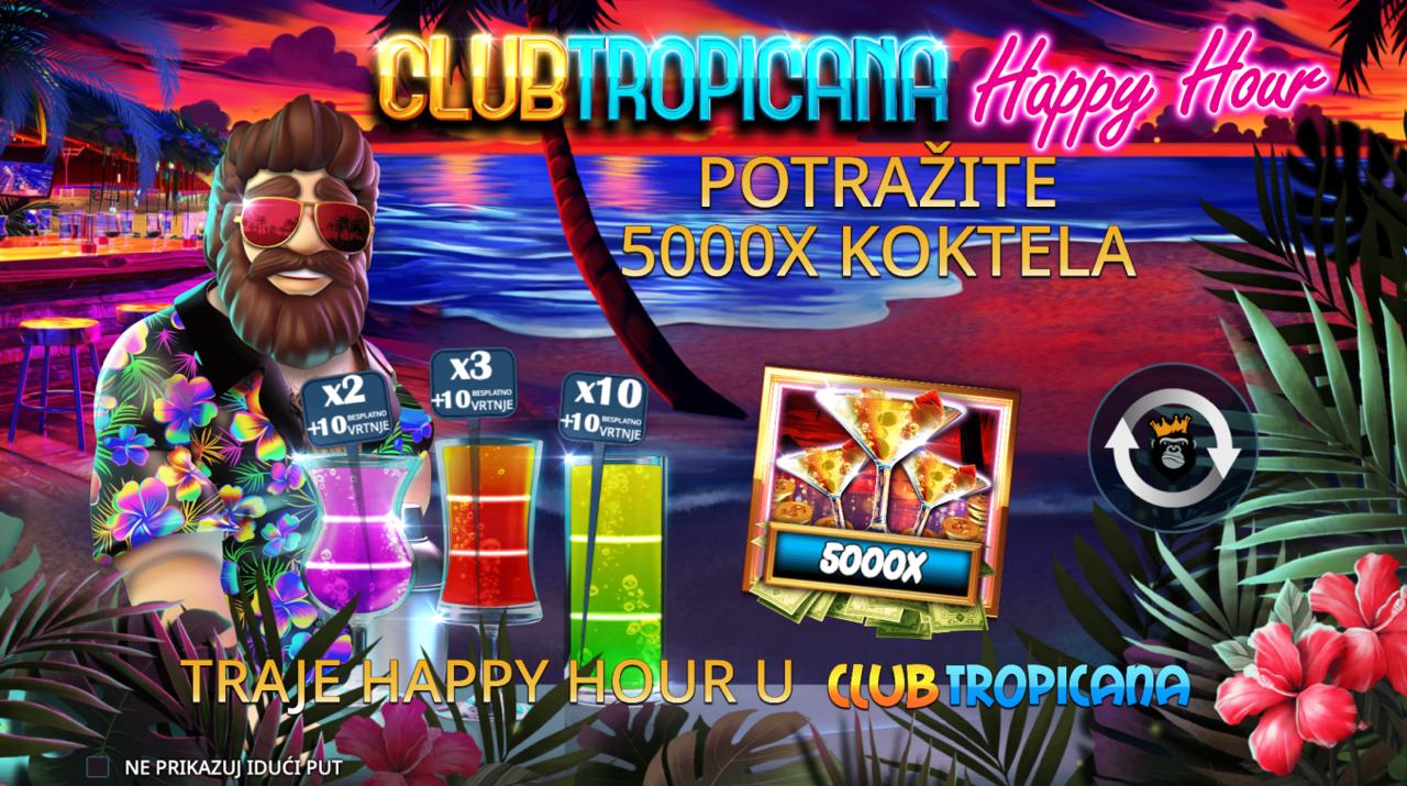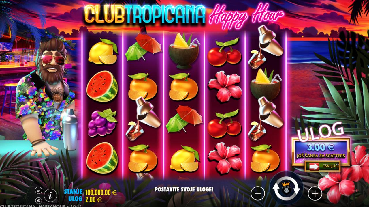 Dođi na sunčanu plažu i osjeti ritam zabave uz Club Tropicana – Happy Hour, slot igru providera Pragmatic Play koja donosi tropsku atmosferu, šarene simbole i opušteni vibe zabave i slavlja. Vizualno privlačna grafika s koktelima, palmama i suncem stvara osjećaj ljetne euforije, a dinamični spinovi i ritmička pozadinska muzika održavaju igru zabavnom i uzbudljivom. Iako igra ne uključuje jackpot, Club Tropicana – Happy Hour nudi brojne prilike za dobitke i savršena je za igrače koji vole šarene, tematske slotove s vedrim ugođajem.