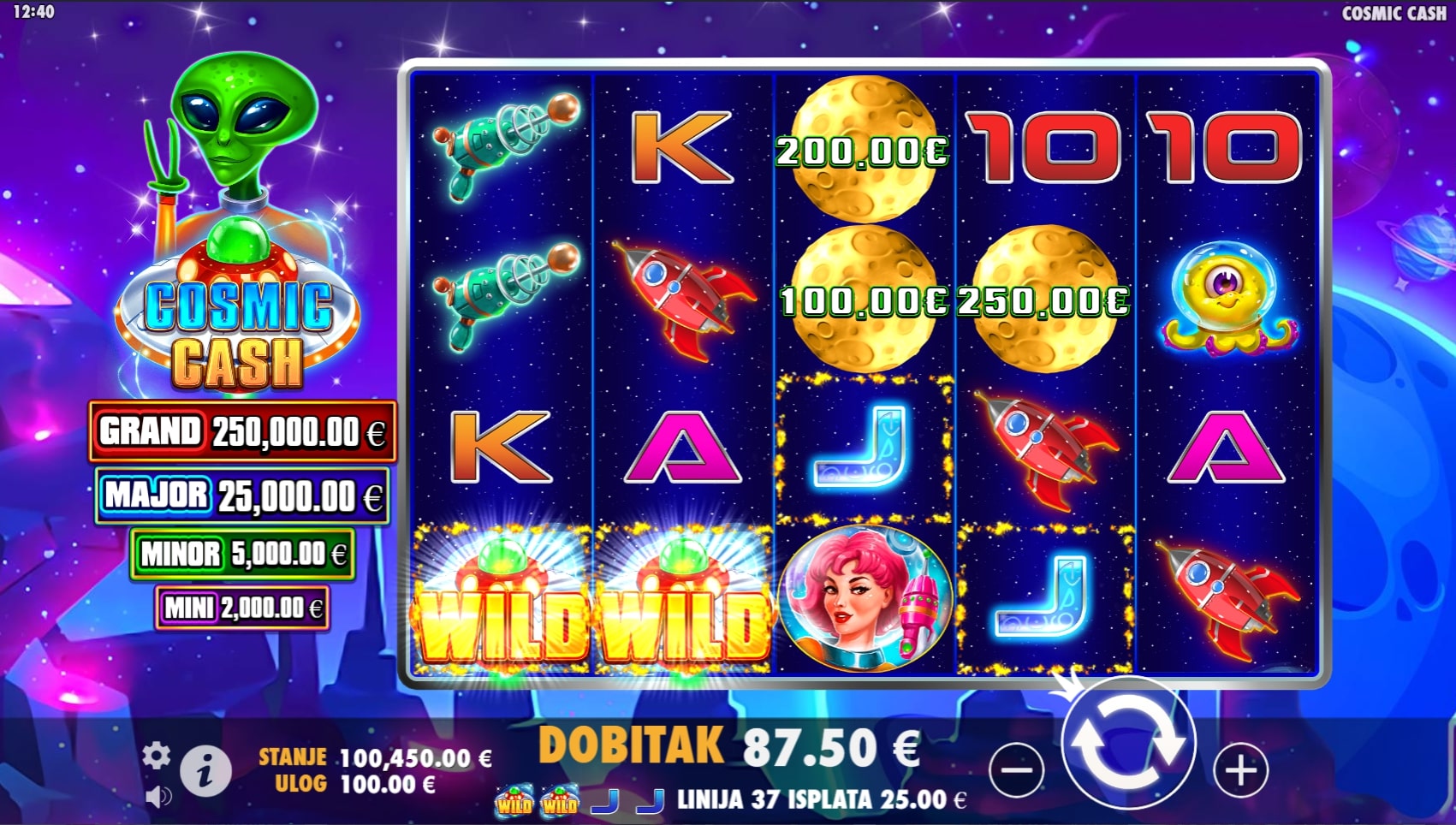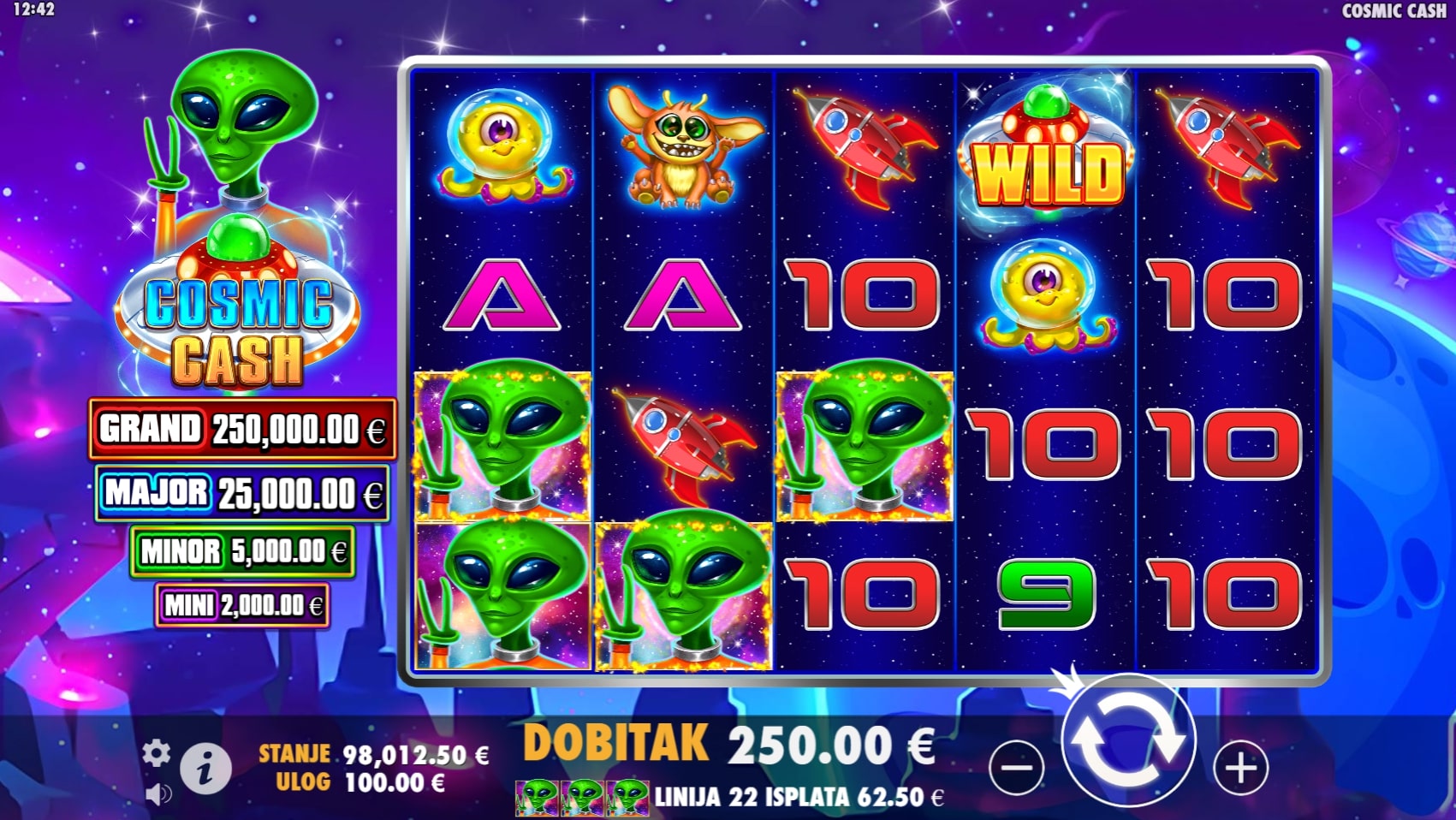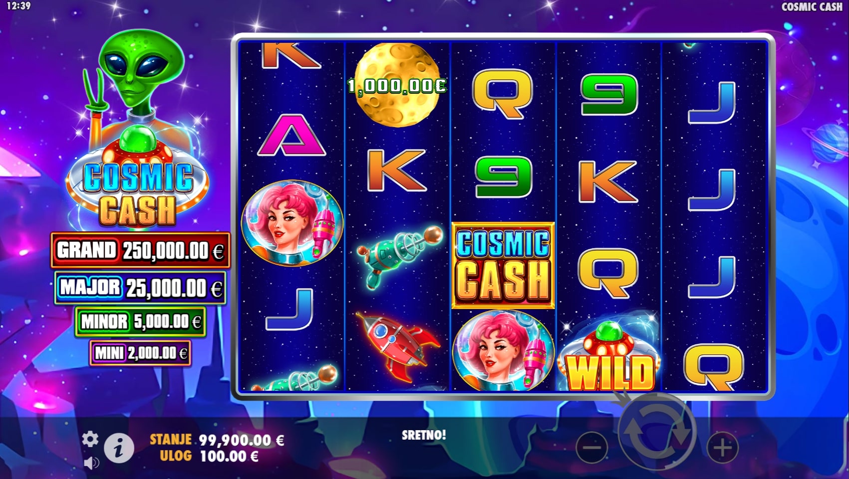 Cosmic Cash tematska je slot igra koja vodi igrača u svijet vanzemaljaca i nadnaravnih dobitaka. Simboli su inspirirani životom van Zemljine atmosfere, dok najviše isplaćuju oni vanzemaljca i raznih zanimljivih stvorenja. Uz to, igra sadrži simbol svemirskog broda koji mijenja druge simbole, dok Cosmic Cash simbol vodi igrača u paralelni svemir besplatnih vrtnji. Zaigraj Cosmic Cash te osvoji fantastične nagrade!