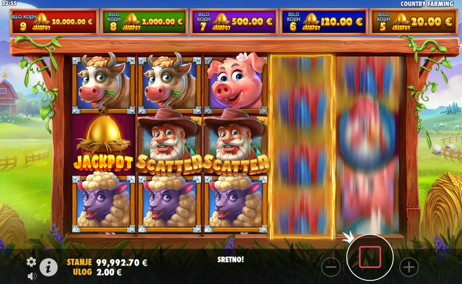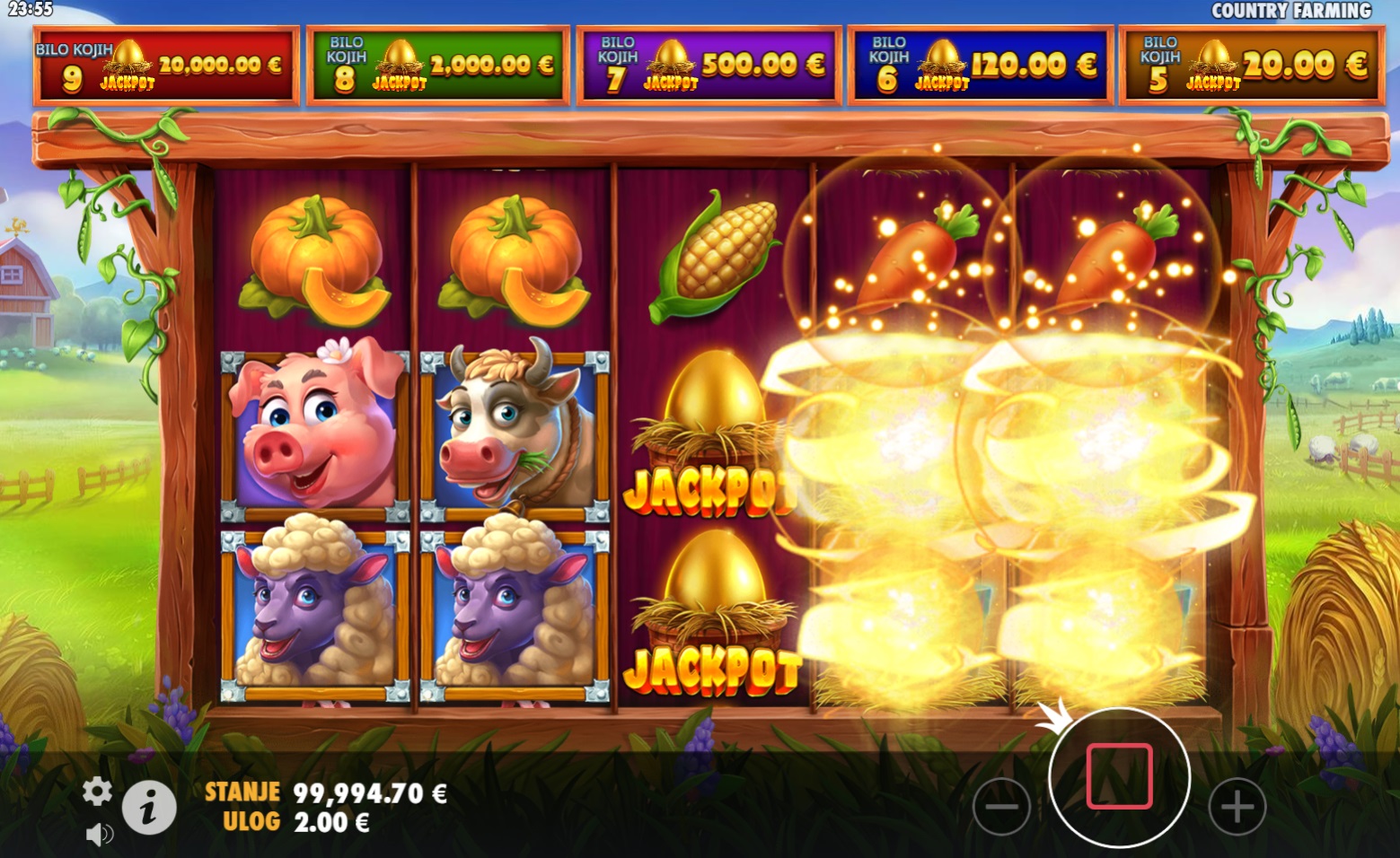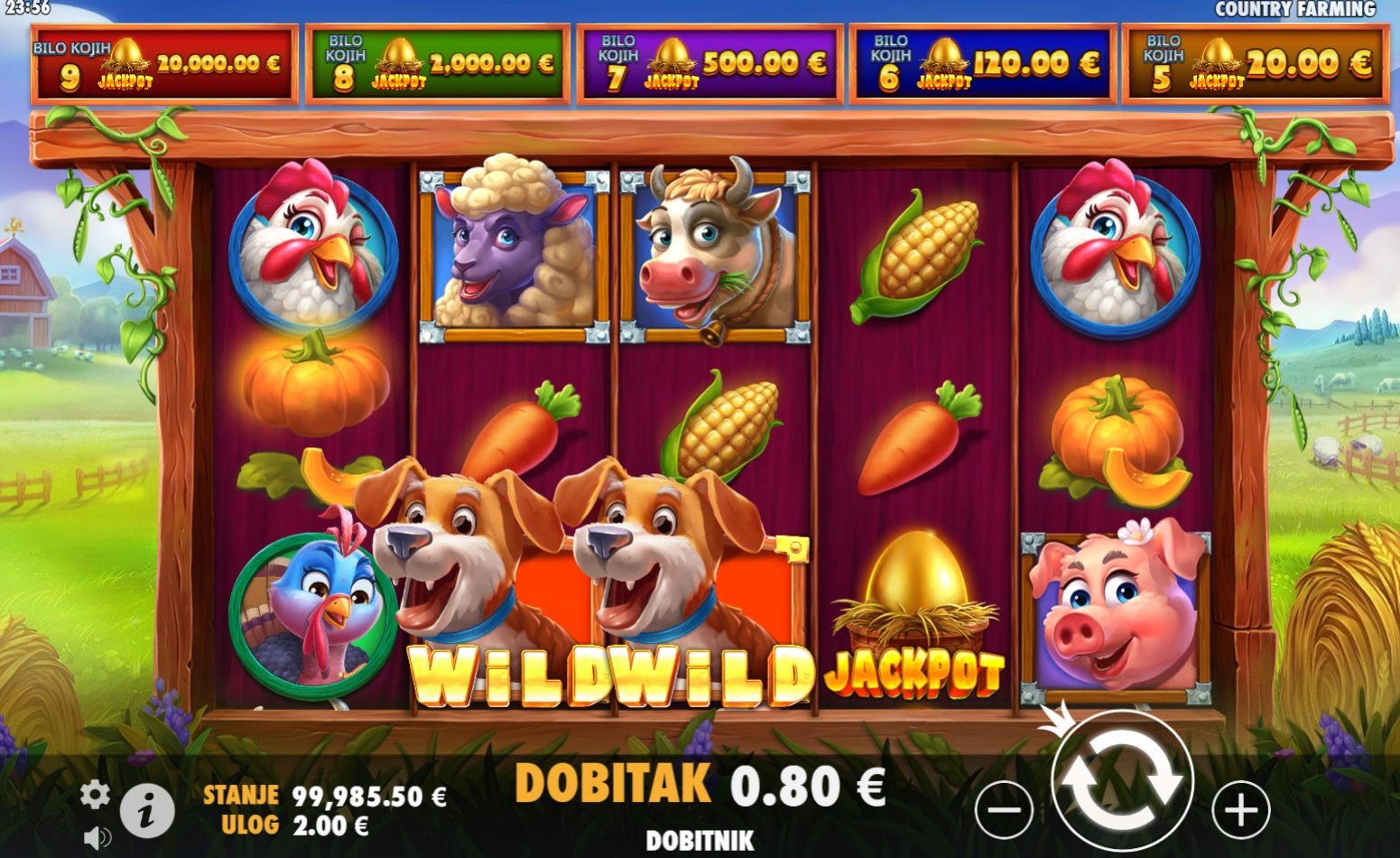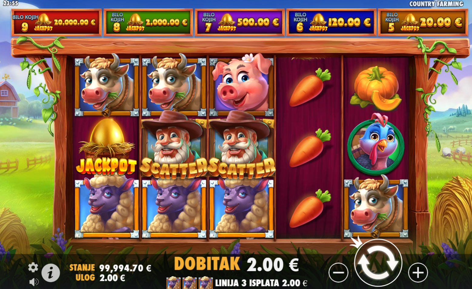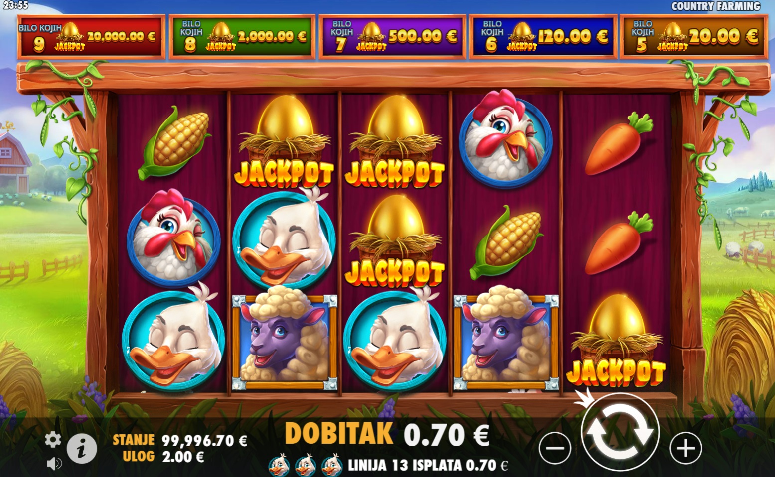 Country Farming™ je jednostavna, ali uzbudljiva igra s pet koluta. Scatter simboli pojavljuju se na drugoj, trećoj i četvrtoj roli te pokreću bonus runde ako ih dobiješ tri ili više. Svaki put kad dobiješ simbol Jackpot na pet kolutova, osvajanje fiksnog jackpot bonusa je tvoje. Wild simboli zamjenjuju sve simbole osim Scatter-a, povećavajući tvoje šanse za dobitak. Besplatne vrtnje donose dodatnu priliku za velike dobitke, a posebne role omogućuju još uzbudljiviju igru.