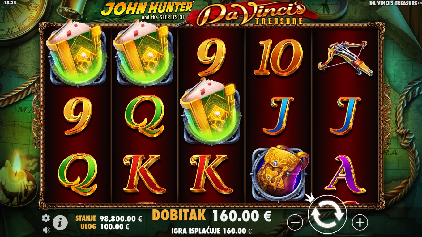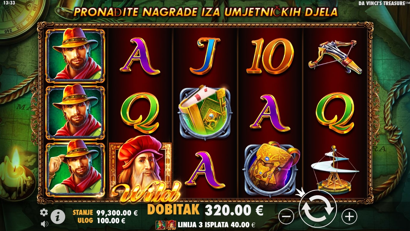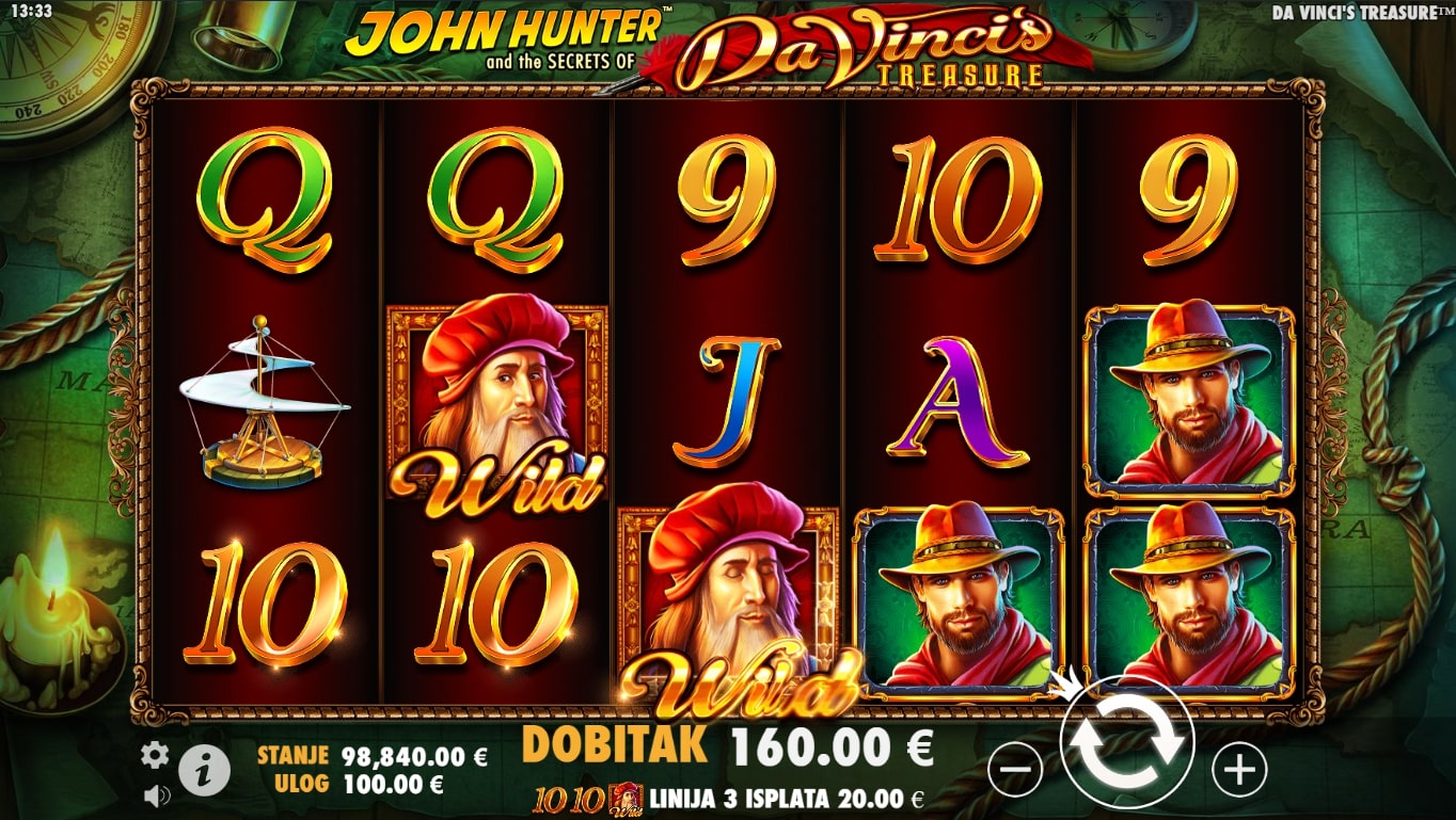 Da Vinci's Treasure slot je igra povijesne tematike koja vodi igrača na avanuturu s famoznim Johnom Hunterom kroz djela jednog od najvećih umova u povijesti. Najviše isplaćuju simboli istraživača, knjige i torbe, dok simbol Leonarda mijenja druge simbole u potrazi za dobicima. Bonus igre ostvaruju se nizanjem simbola brojčanika. Zaigraj Da Vinci's Treasure te osvoji vrhunske nagrade!