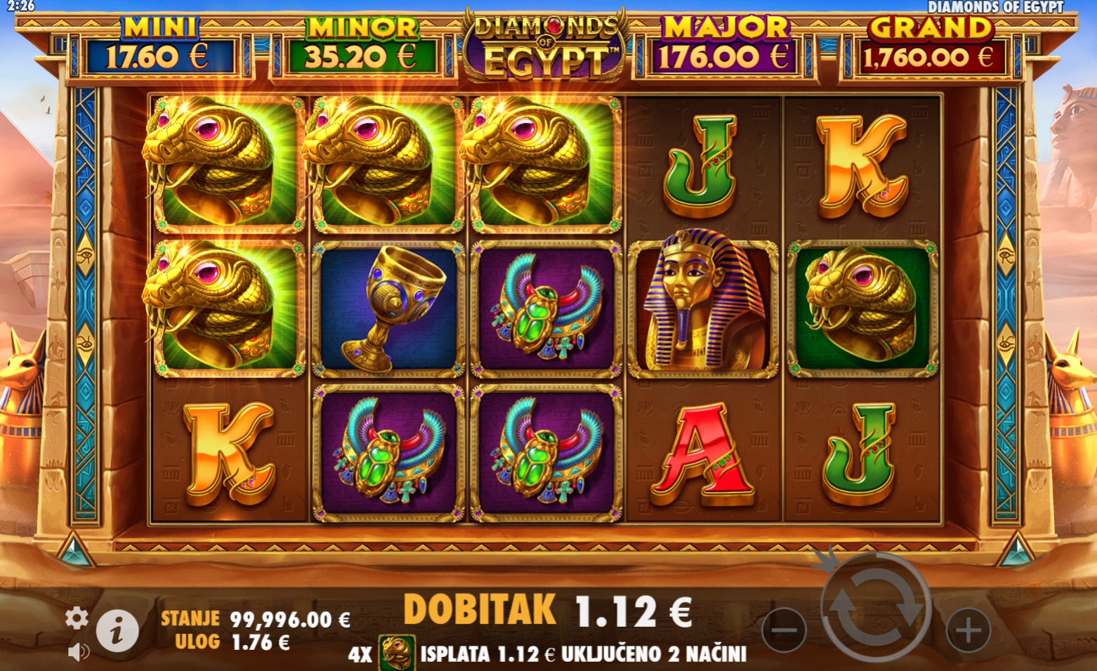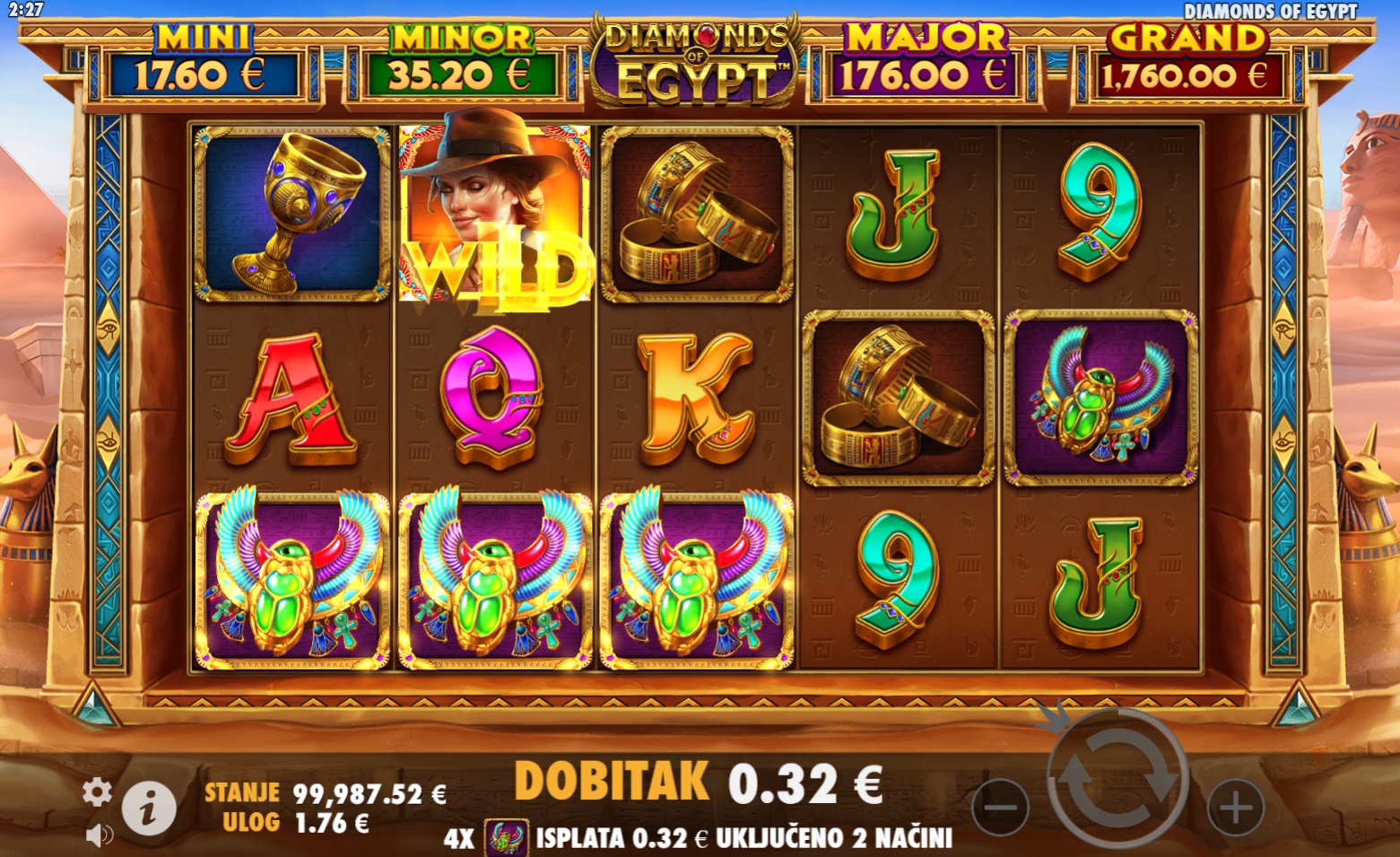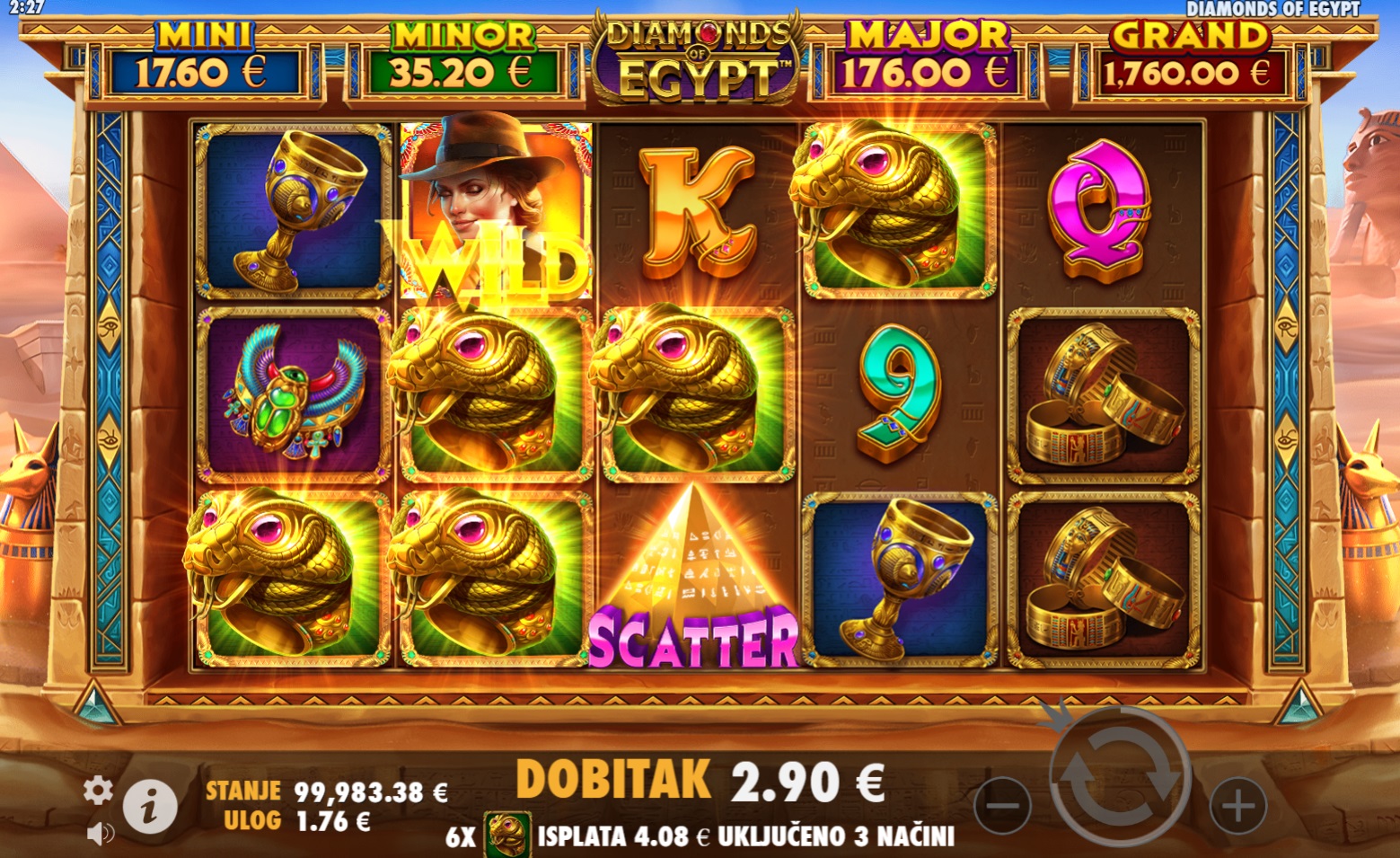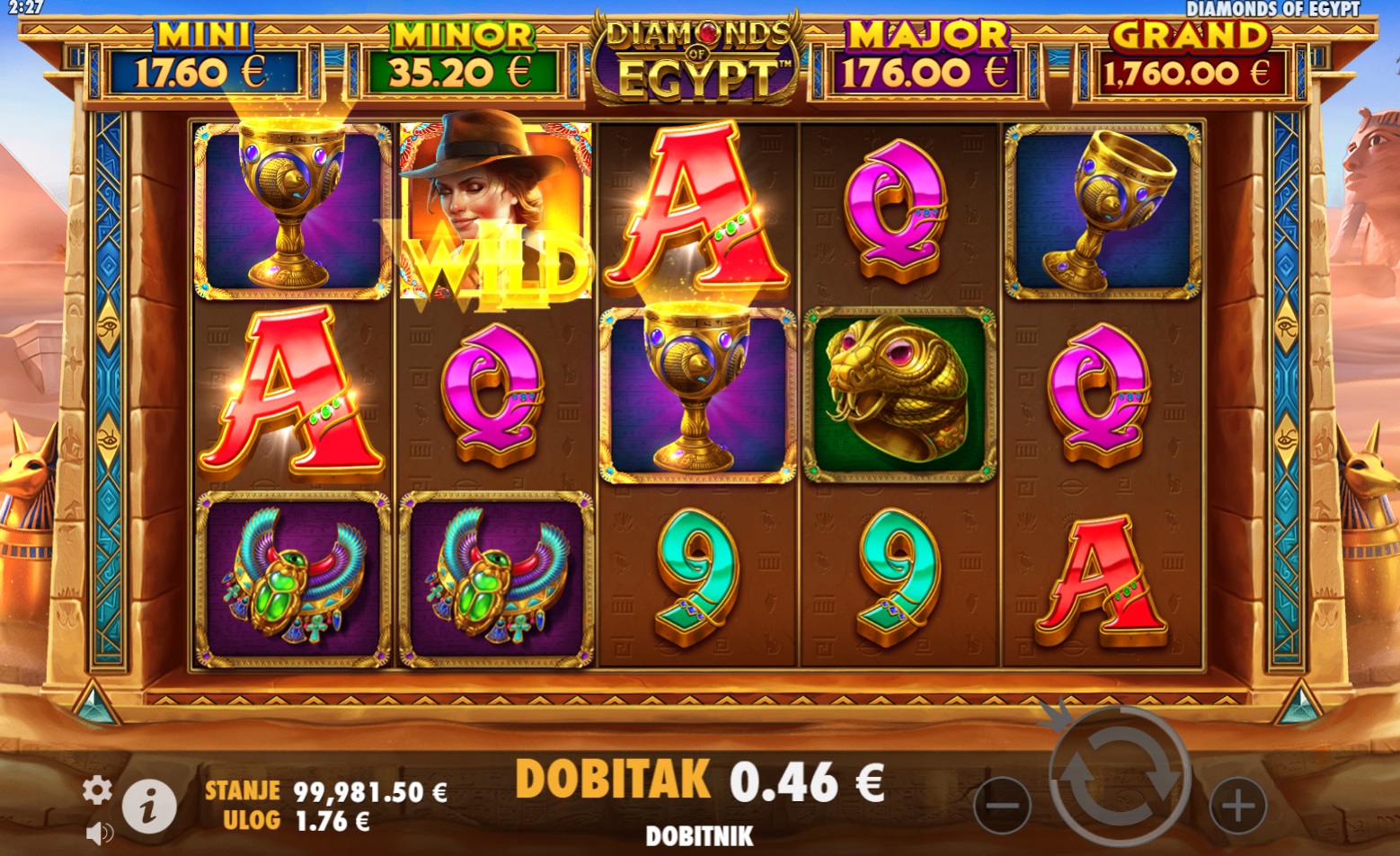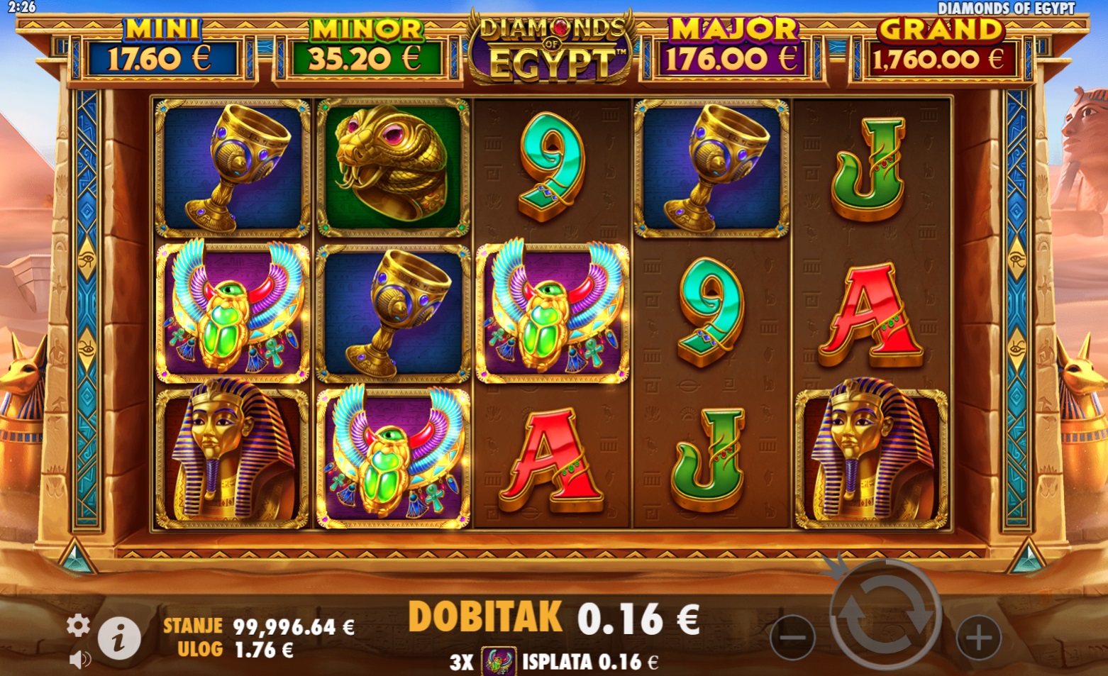 Gameplay u Diamonds of Egypt™ je jednostavan, ali uzbudljiv, pružajući ti 243 načina za dobitak na svakom okretaju. Wild simboli pojavljuju se na srednjim rolama i zamjenjuju sve simbole, dok Wild s množiteljem x5 dodatno povećava tvoje dobitke. Scatter simboli aktiviraju besplatne vrtnje kad se pojave na susjednim rolama, nudeći čak 8 besplatnih okretaja i mogućnost ponavljanja bez ograničenja. U Jackpot Bonus igri možeš osvojiti jedan od četiri jackpota – Grand, Major, Minor ili Mini – čija se vrijednost množi s ukupnim ulogom, donoseći do 1000 puta veći dobitak!