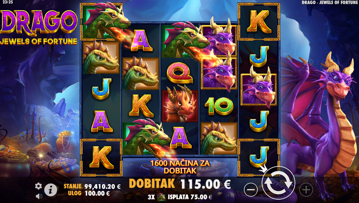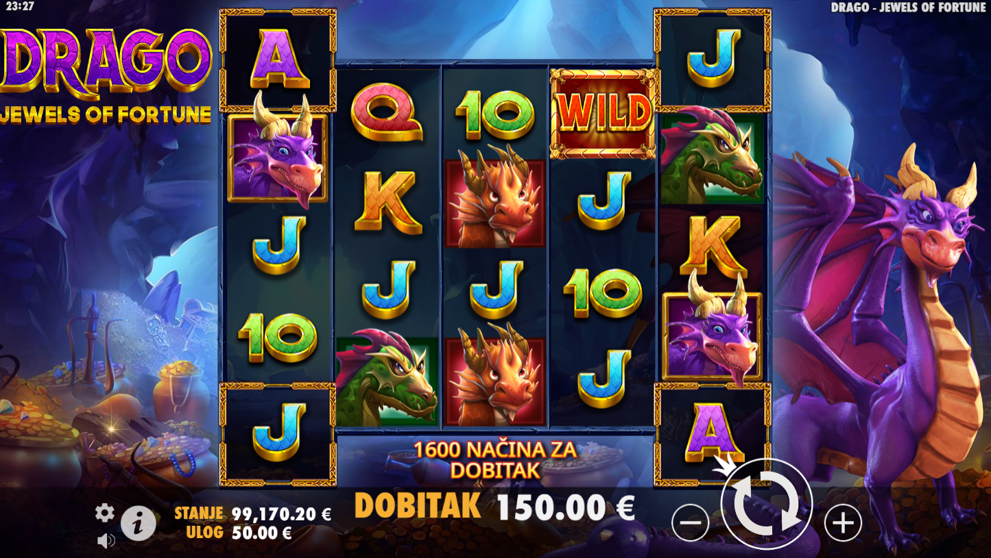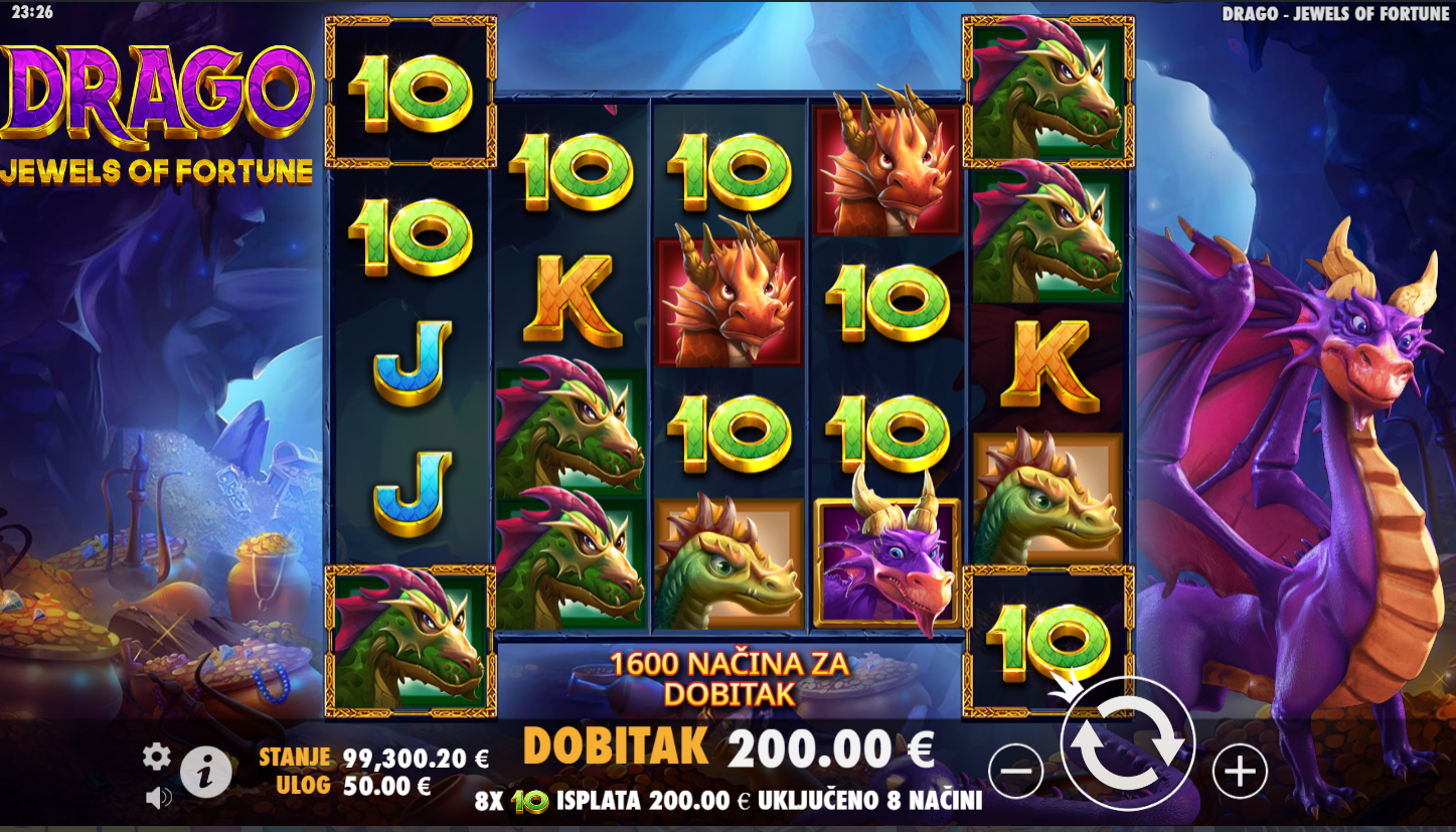Od providera PragmaticPlay, Drago te vodi u mistični zmajev hram prepun blingova i sjaja dok pet rešetki (5-4-4-4-5), 1600 načina za dobitak i četiri šarena zmaja stvaraju atmosferu drevne meksičke riznice. Svaki dražesni zmaj animira se pri dobitku, a svaka opasna situacija obećava eksploziju multiplikatora i misterija!