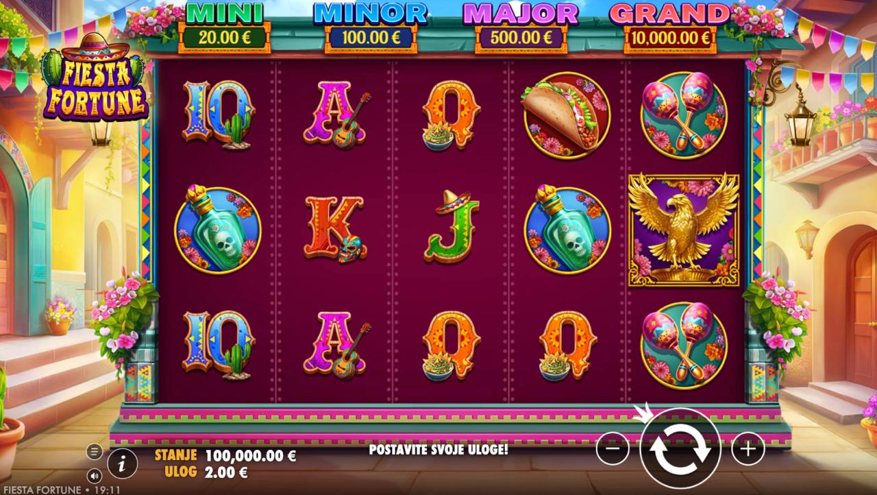 Fiesta Fortune igra se na 5 rola gdje je cilj složiti iste simbole na aktivnim dobitnim linijama kako bi ostvario dobitak. Wild simboli mogu zamijeniti ostale simbole i pomoći u formiranju dobitnih kombinacija, dok Scatter simboli mogu aktivirati bonus značajke poput besplatnih vrtnji ili multiplikatora. Postavi željeni ulog i zavrti role kako bi osvojio šarene nagrade!
