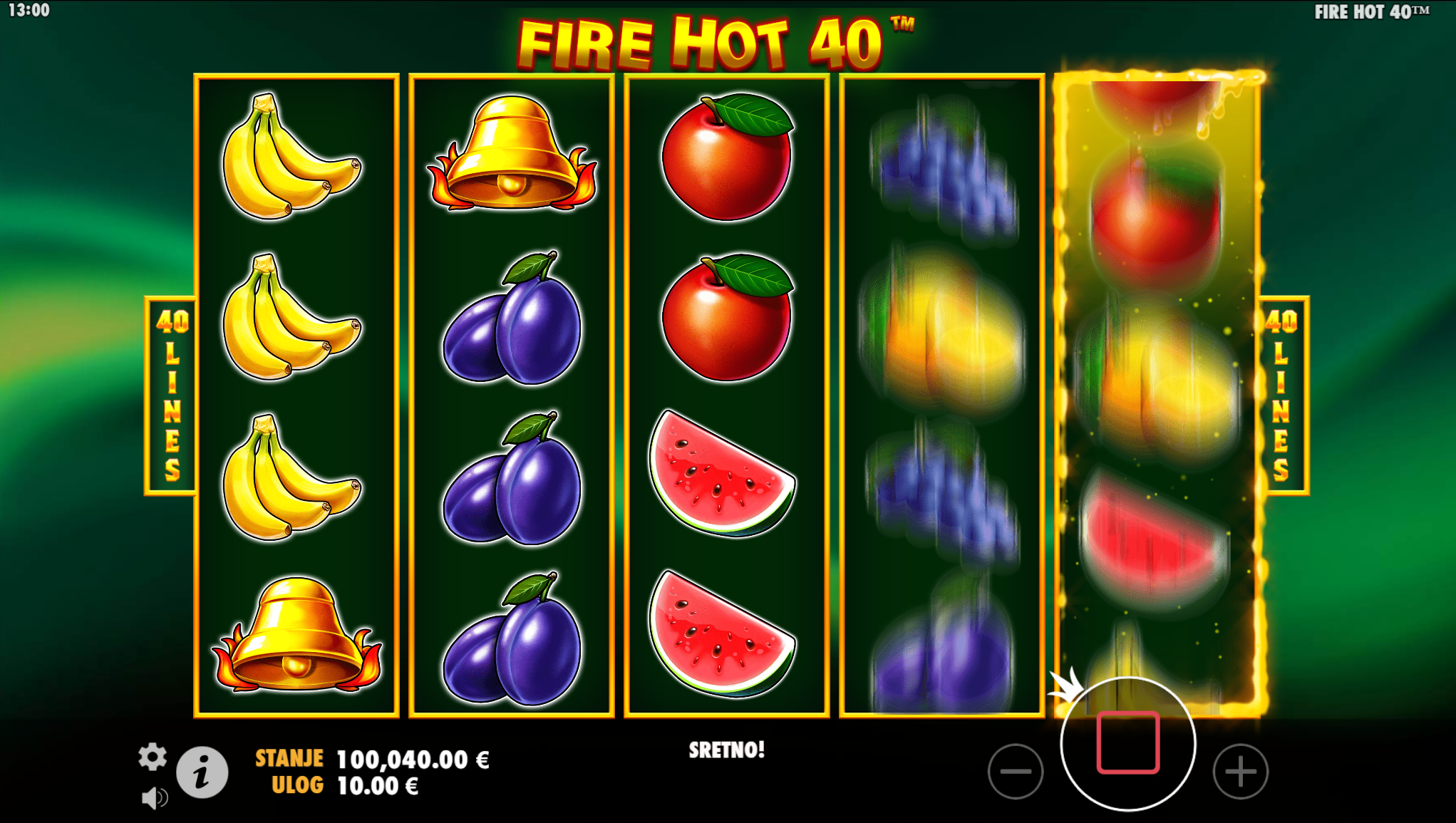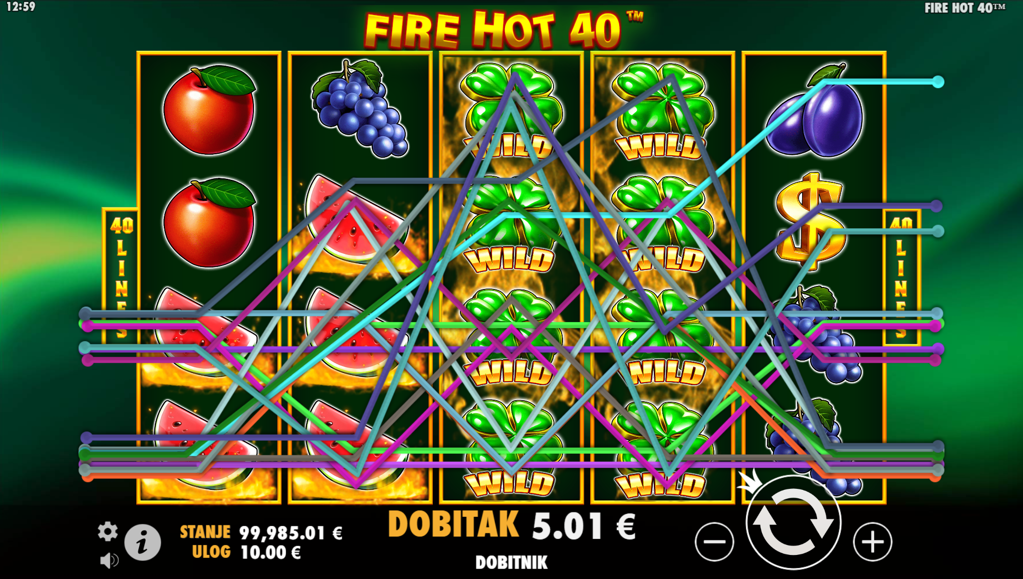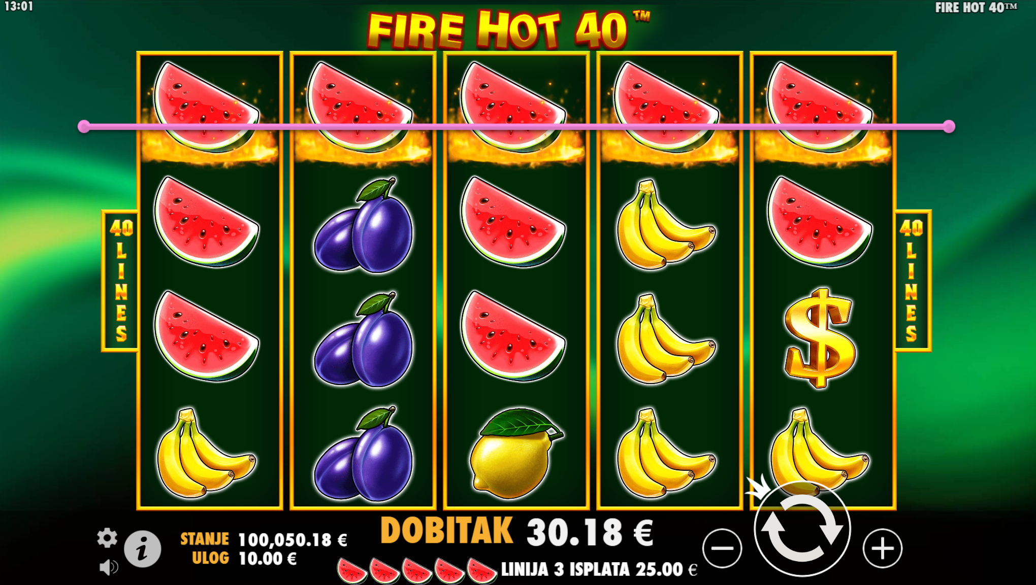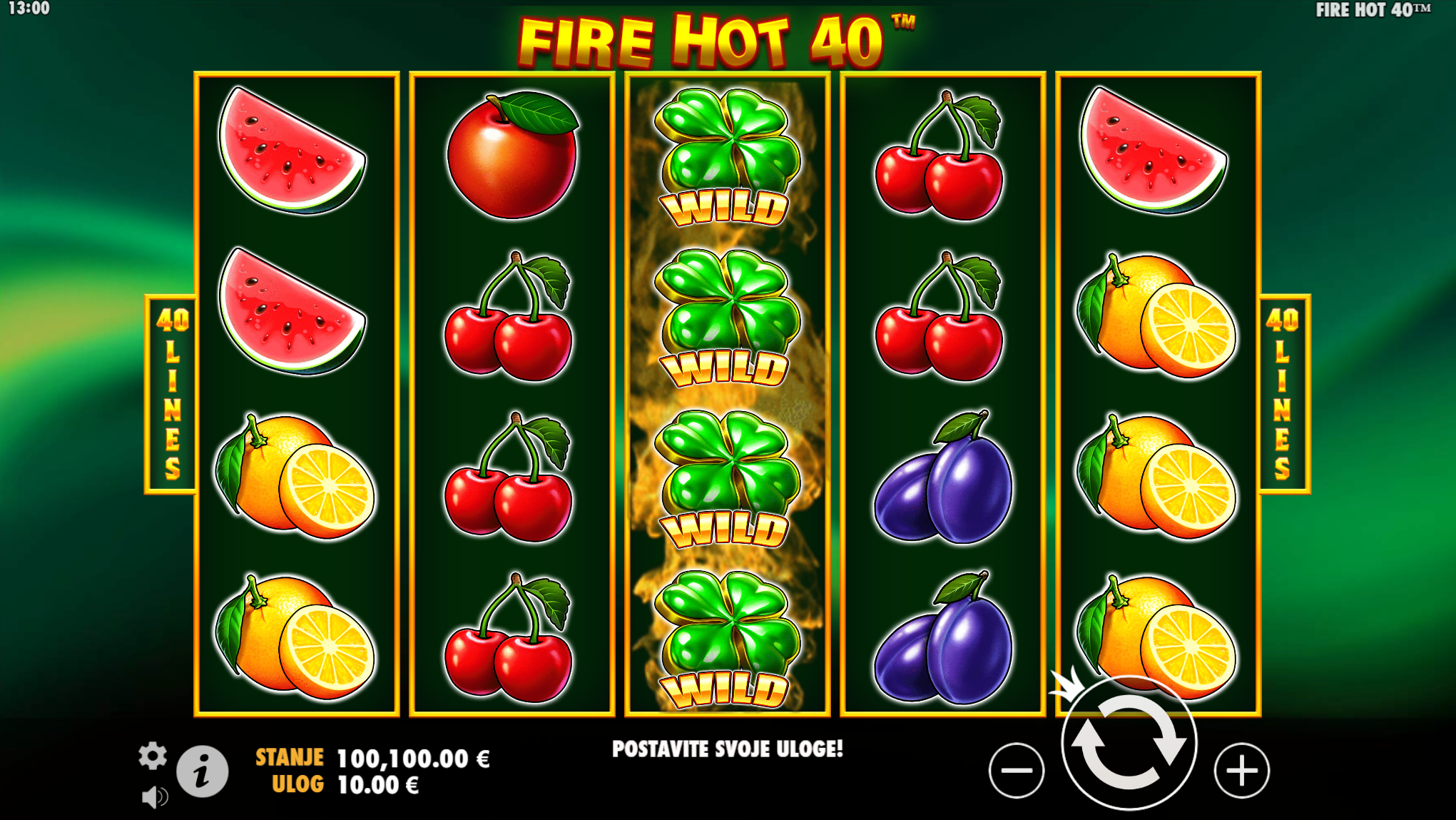 Svatko tko voli jednostavne slotove sa elegantnim simbolima i dozom uzbuđenja na pravom je mjestu, jer Fire Hot 40 pruža sve to, a i mnogo više. Primamljivo ilustrirano voće učiniti će igranje zabavnijim i zanimljivijim, a tajanstvena sretna djetelina super uzbudljivim te bogatim po pitanju dobitaka! Kao jedan od najpopularnijih slotova, Fire Hot 40 odličan je izbor za sve igrače koji vole izvrstan omjer rizika i dobitaka.