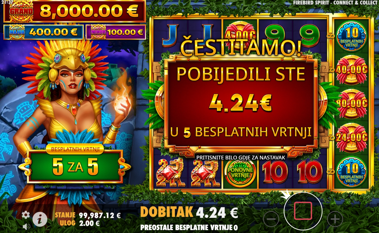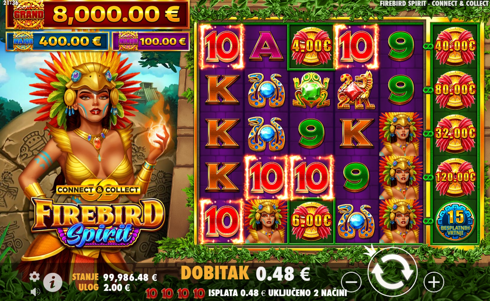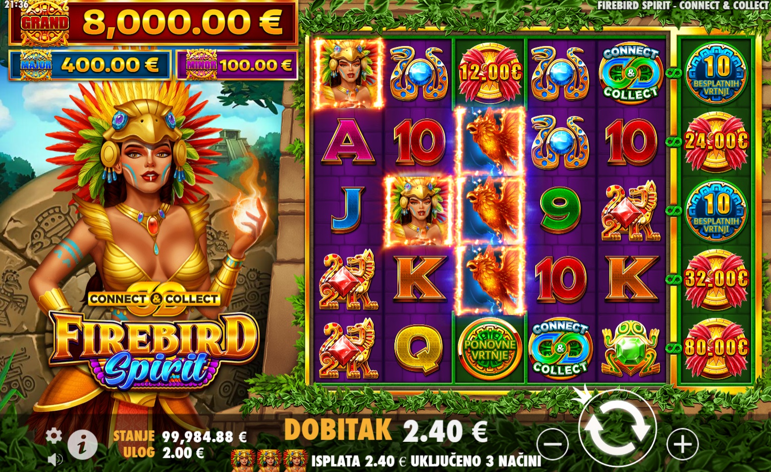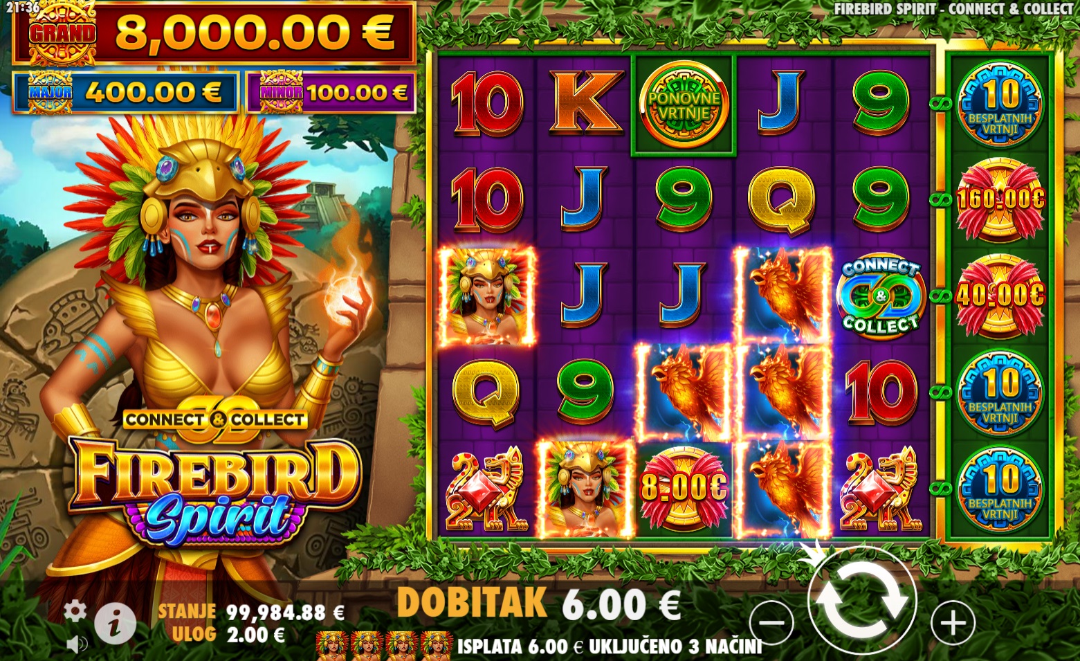 U igri Firebird Spirit uživat ćeš u dinamičnom i zabavnom gameplayu. Igra se na pet rola s dodatnom posebnom 6. rolom, gdje se pojavljuju posebni simboli koji aktiviraju jedinstvene bonuse. Cilj je spojiti simbole Connect & Collect koji se pojavljuju na rolama, povezujući ih s posebnim položajima na 3. i 6. roli, što može donijeti velike nagrade. Posebni simboli poput Quick Collect i Ponovna Vrtnja dodatno obogaćuju igru, dajući ti priliku za dodatne vrtnje i veće dobitke. Uz brojne mogućnosti za besplatne vrtnje i množitelje, Firebird Spirit će te držati na rubu sjedala tijekom cijele igre.