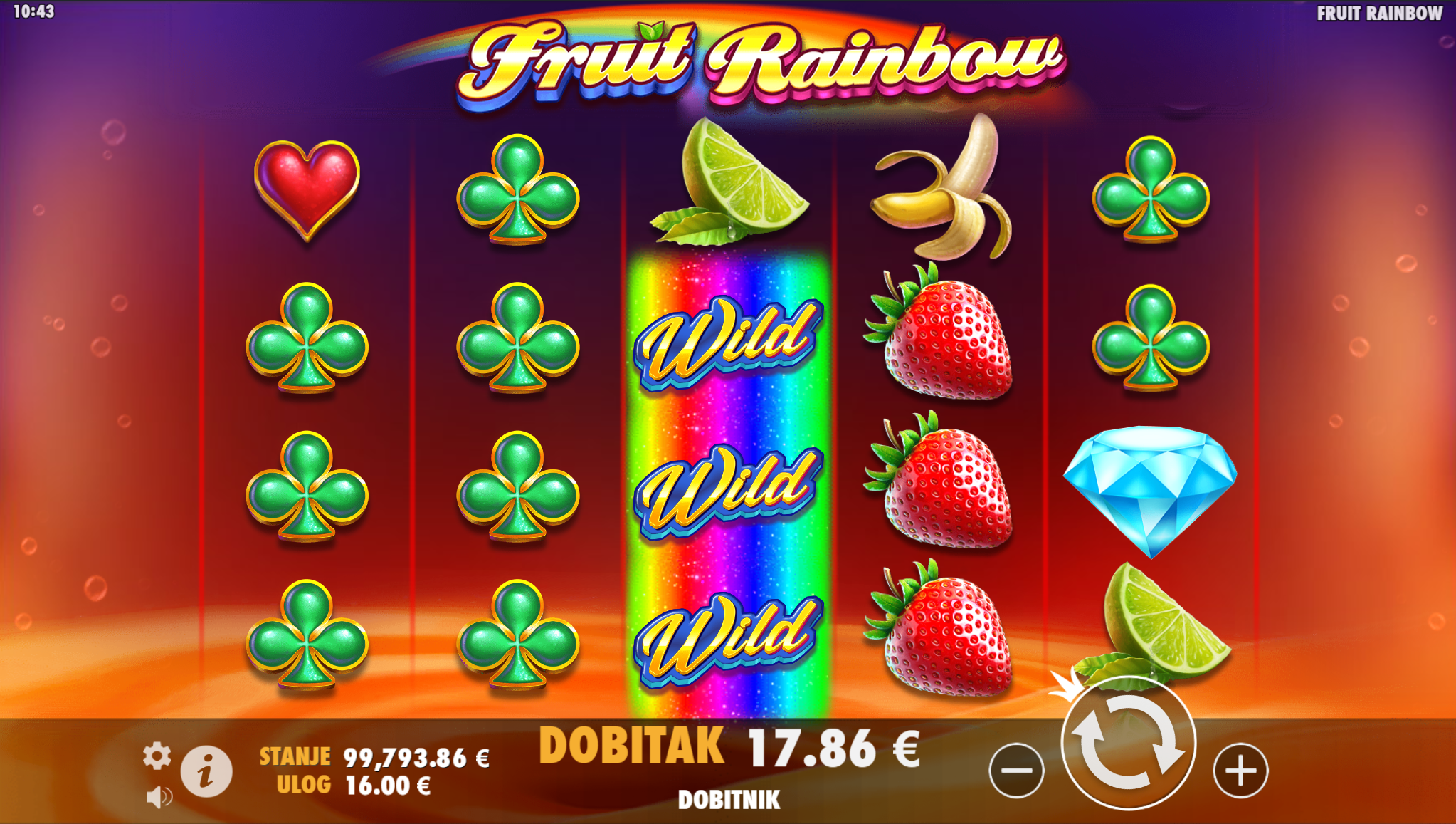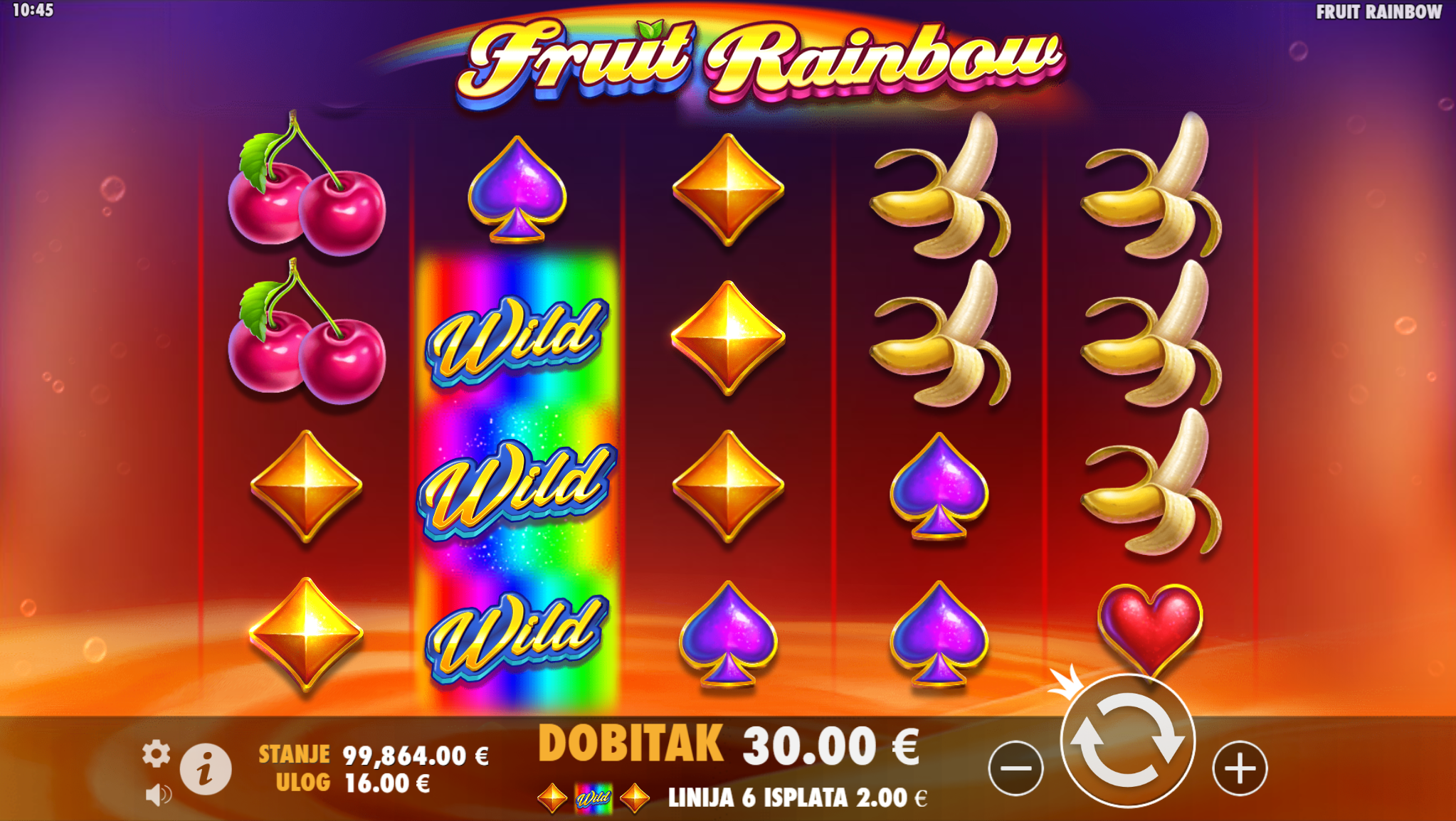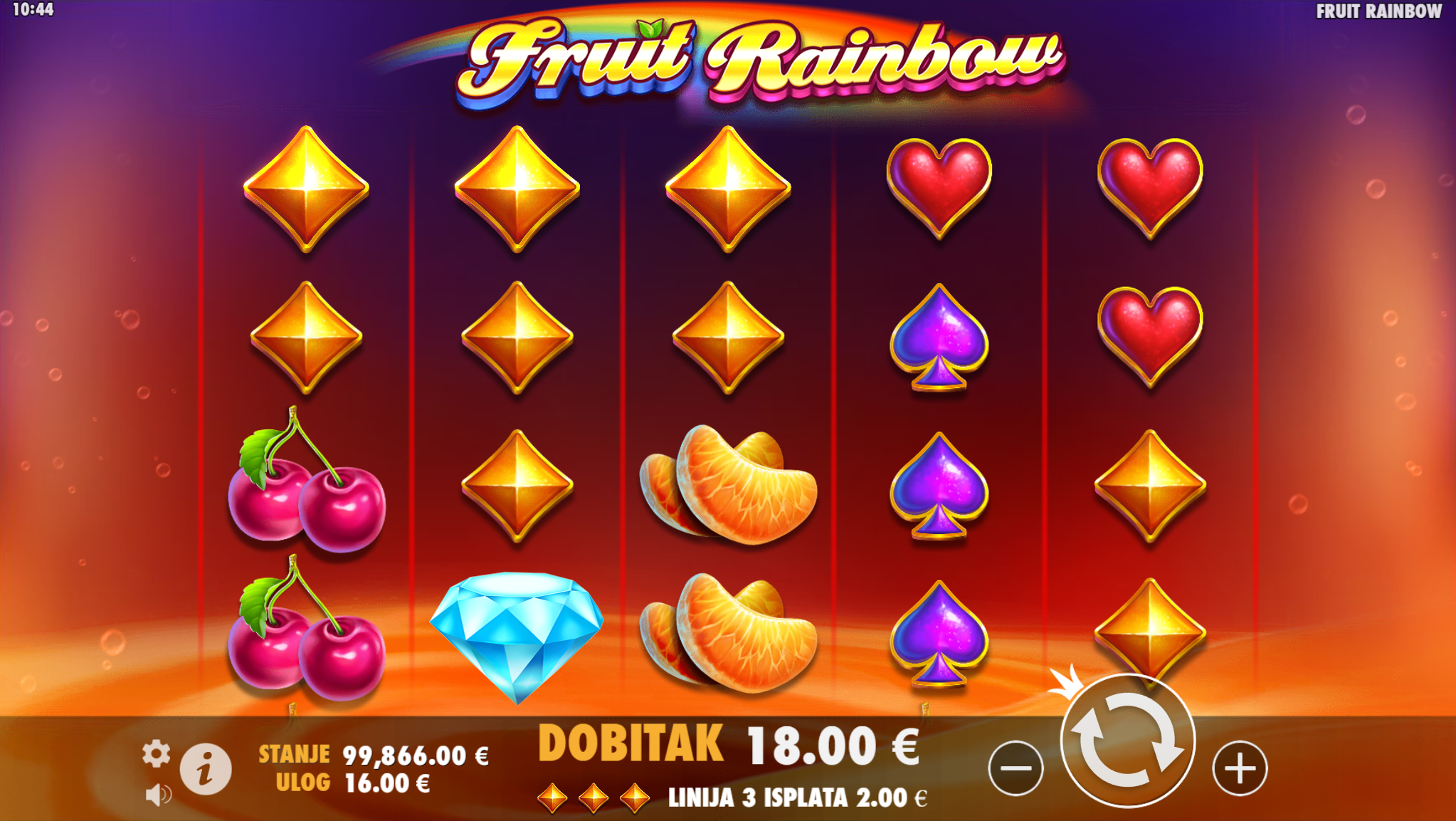 Fruit Rainbow vodi svoje igrače kroz zabavnu avanturu obogaćenu pažljivo ilustriranim voćnim simbolima uz dodatak zlatnih efekata. Super jednostavan način igranja omogučiti će igračima dugotrajnu zabavu, a kako bi ona također bila i uzbudljiva pobrinuti će se Fruit Rainbow simboli wild duge koji će tvoje dobitke pretvoriti u veće i učestalije. Ako voliš igre koje ti pružaju izvrstan omjer rizika i dobitaka došao si na pravo mjesto! Prepusti se zabavi i užitku te sa sobom odnesi velike dobitke!