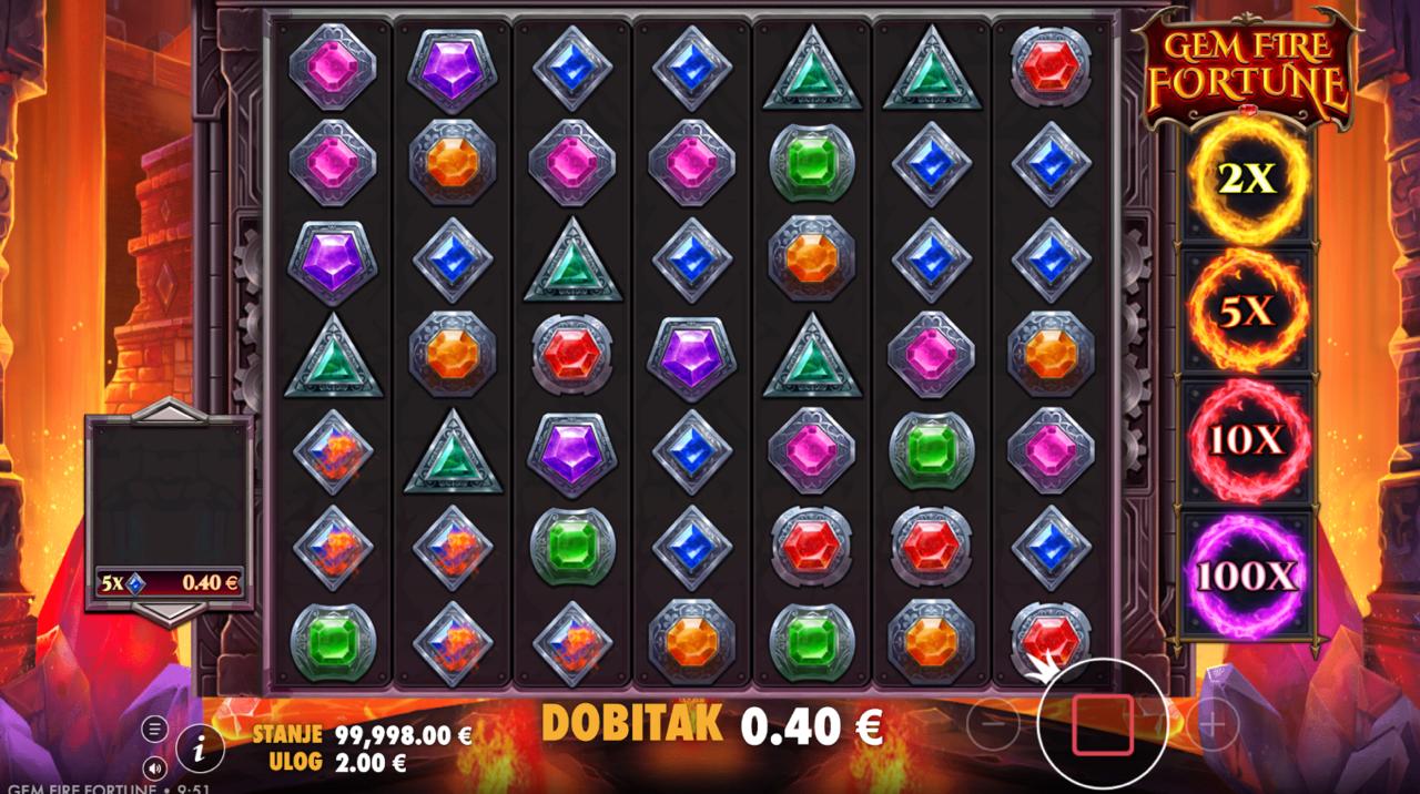 Igri Gem Fire Fortune pristupa se jednostavno: igra se na 5 rola, a cilj je složiti iste simbole na aktivnim dobitnim linijama, počevši s lijeve strane, kako bi ostvario dobitak. Sjajni simboli dragulja donose različite razine nagrada, dok posebni simboli mogu povećati tvoje šanse za veće isplate. Postavi željeni ulog, zavrti role i uživaj u briljantnim kombinacijama i mogućnostima dobitaka!