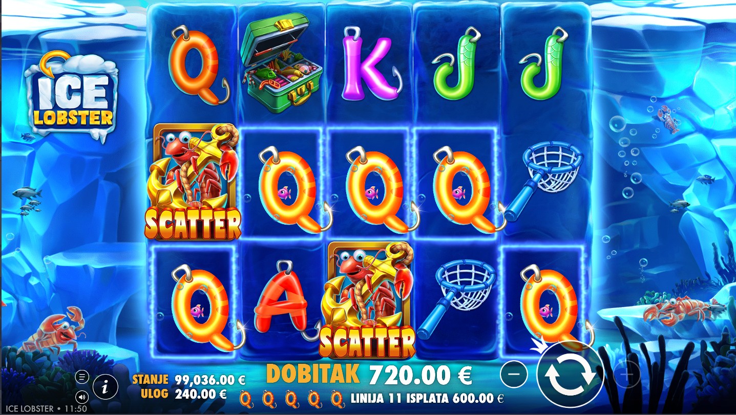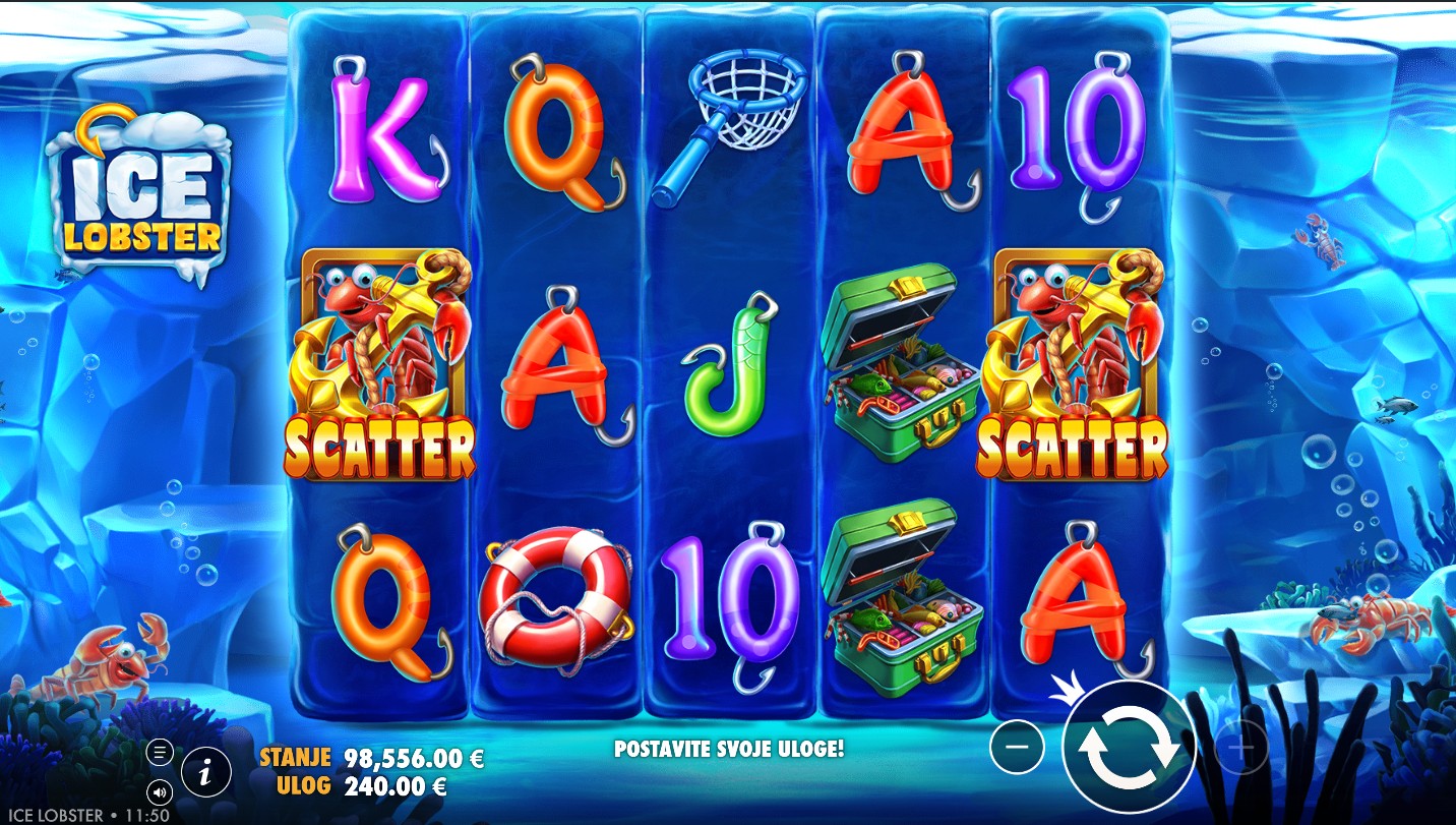 Ice Lobster vodi te u ledene dubine oceana u slotu providera PragmaticPlay s 5 valjaka i 20 fiksnih isplatnih linija. Wild simbol, prikazan kao zlatna riba, zamjenjuje sve simbole osim scattera i money simbola. Scatter simbol aktivira besplatne vrtnje kada se tri, četiri ili pet scattera pojave bilo gdje na valjcima, dodjeljujući 8, 12 ili 15 besplatnih vrtnji. Tijekom besplatnih vrtnji pojavljuju se money simboli s vrijednostima od 0,5x do 1000x ukupnog uloga, a pozicije scattera postaju zamke koje se zaključavaju. Kada se sakupi šest zamki, vrijednosti money simbola se udvostručuju, dok se pri deset ili više zamki utrostručuju. Maksimalni potencijalni dobitak doseže 5000x ukupnog uloga.