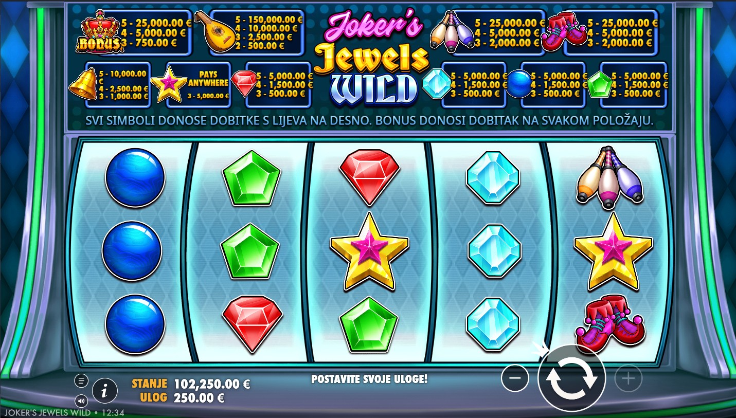 Joker’s Jewels Wild se igra na 5 valjaka i 5 fiksnih isplatnih linija, a dobitke ostvaruješ kada se isti simboli pojave na susjednim valjcima počevši s prve role. Wild simbol Jokera može se pojaviti na valjcima i proširiti po cijeloj roli čime zamjenjuje druge simbole i pojačava dobitke. Scatter simboli isplaćuju izravne nagrade.