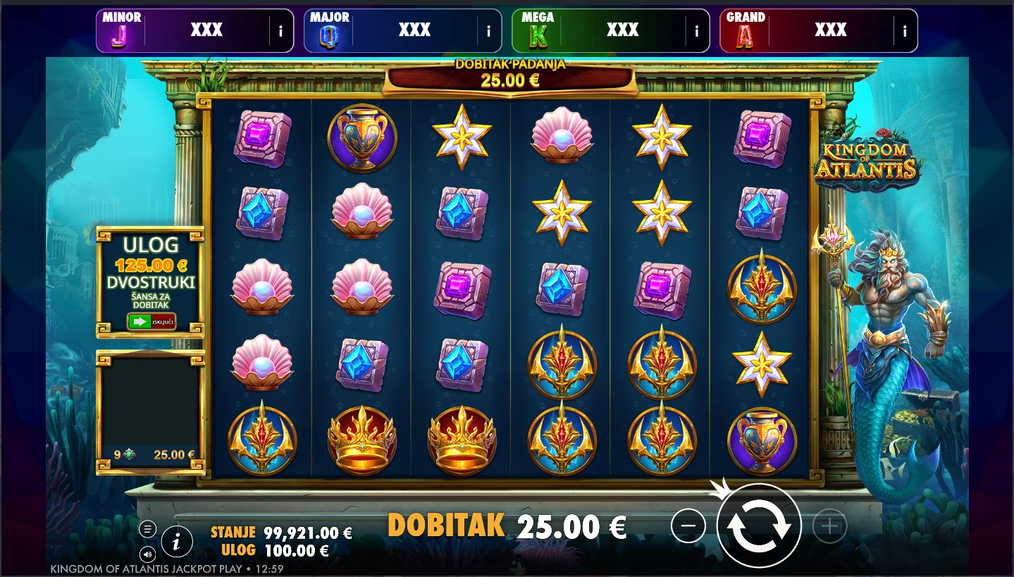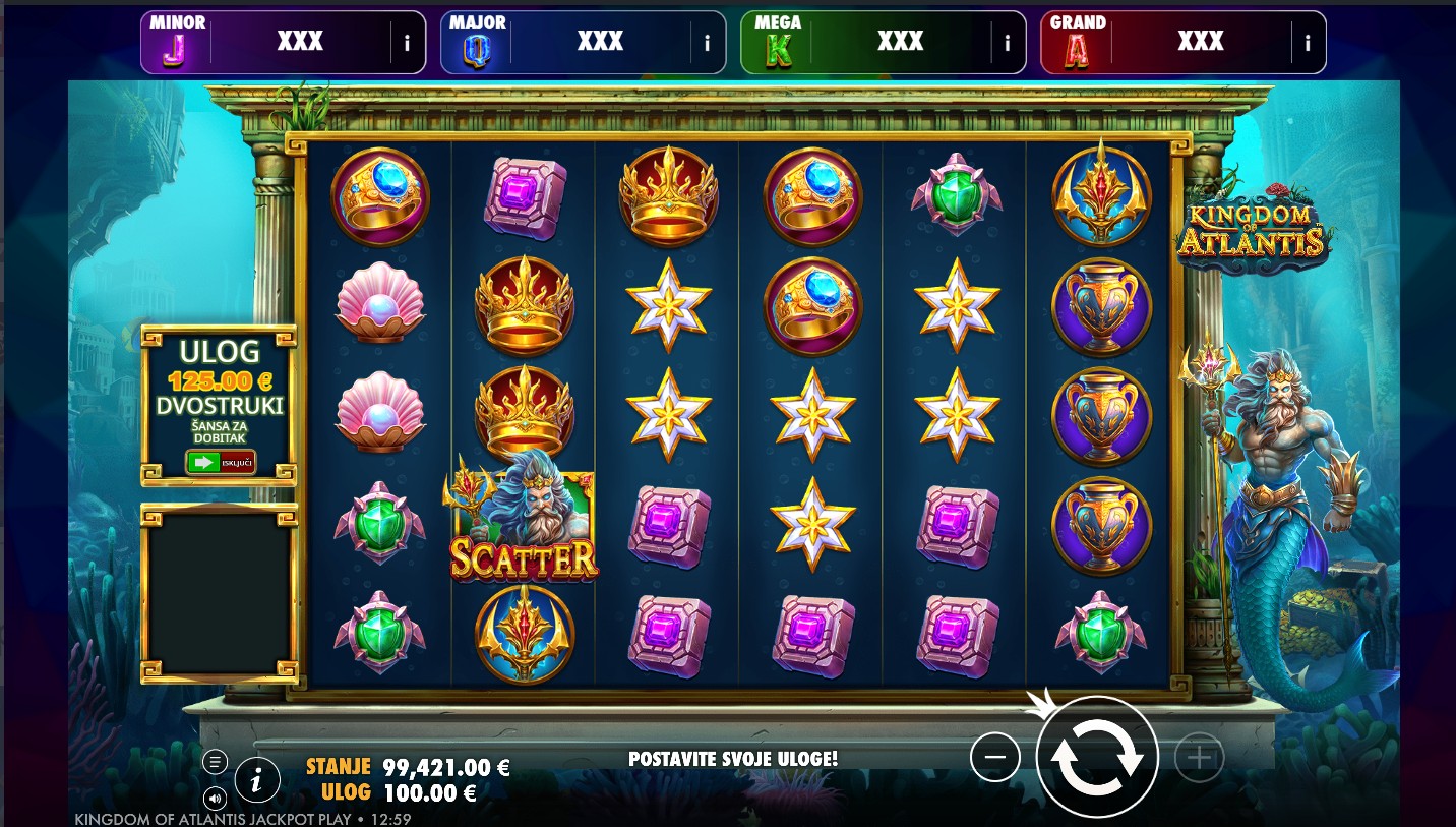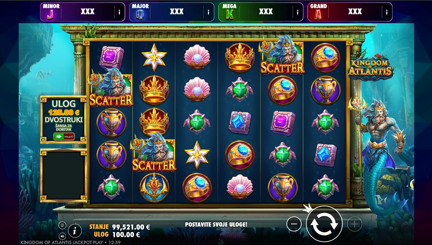 Kingdom of Atlantis Jackpot Play se igra na 6 valjaka i 20 fiksnih isplatnih linija. Dobitne kombinacije ostvaruju se kada se isti simboli pojave s prve role prema desno. Wild simbol zamjenjuje sve regularne simbole i olakšava formiranje dobitaka. Scatter simboli pokreću besplatne vrtnje. Tijekom igre možeš osvojiti bogati progresivni jackpot na 4 razine, a za dodatno uzbuđenje tu se i mogućnost osvajanja mnoštva množitelja sve do 500x.