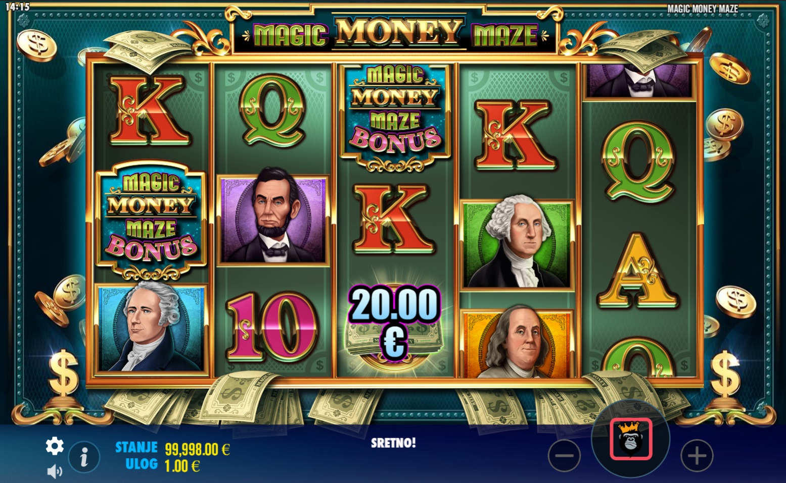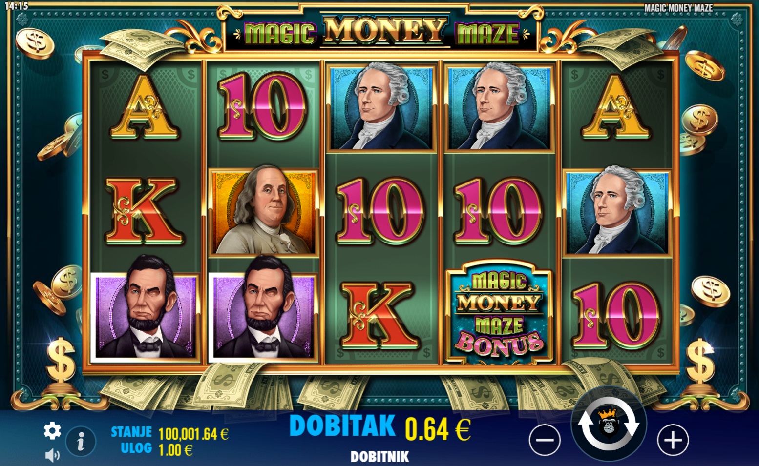 Zaboravi klasične automate – Magic Money Maze, slot igra providera Pragmatic Play, odvodi te u sasvim drugačiji svijet. Ovdje glavnu riječ vodi simpatična glava majmuna koja te vodi kroz bonus ploču punu nagrada, mnoštva iznenađenja i, naravno, zamki. Na šest rola mogu se pojaviti simboli Novca i Bonusa koji otvaraju vrata do uzbudljive bonus igre na ploči 7x7. Ako voliš igre koje kombiniraju sreću, strategiju i dobru dozu adrenalina – ovo je prava poslastica za tebe.