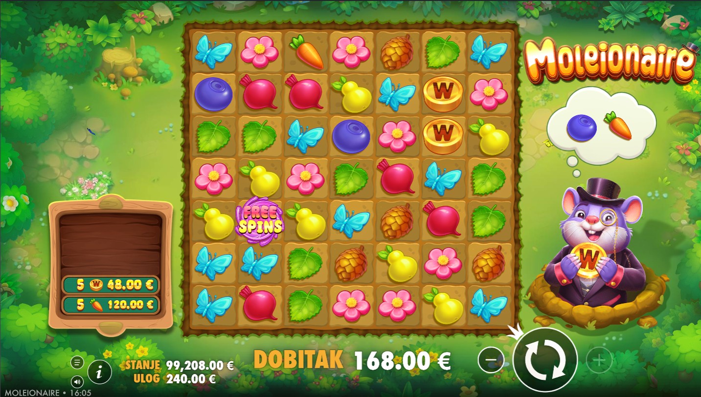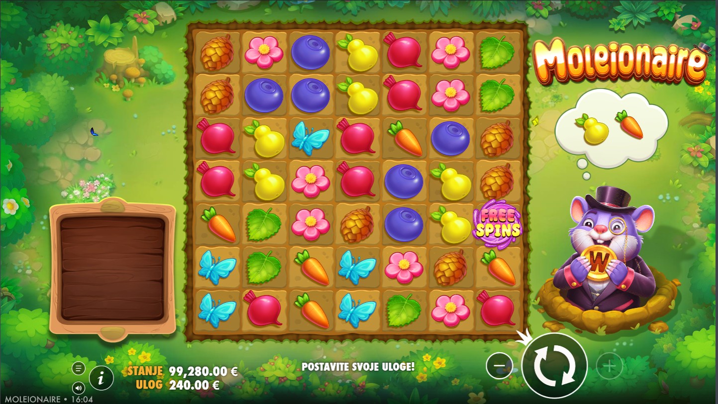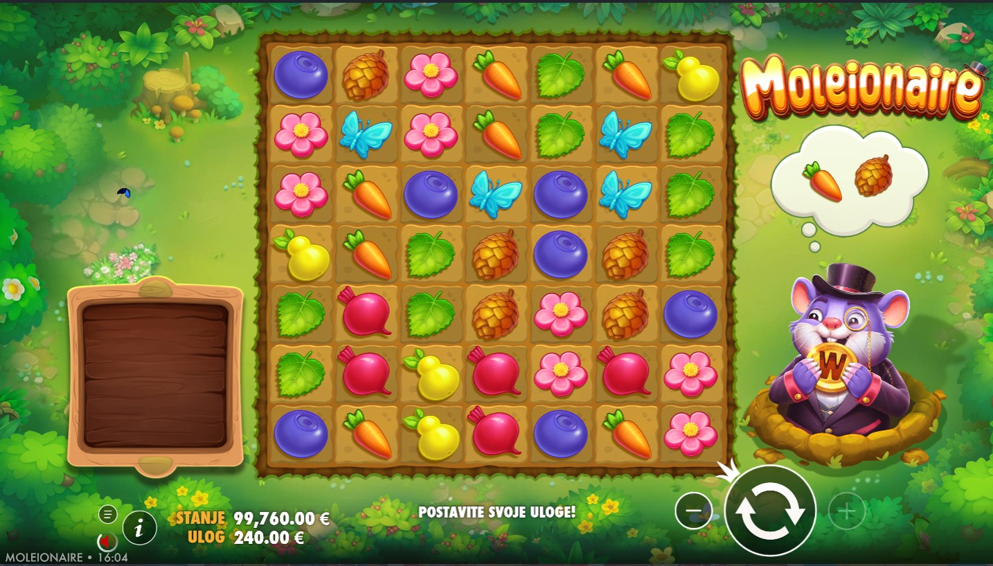 Moleionaire vodi te u svijet zabavnih krtica providera PragmaticPlay na 5 valjaka i 3 retka s 10 fiksnih linija za dobitak. Glavni simbol u ovoj slot igri je krtica koji se pojavljuje kao wild i zamjenjuje sve ostale simbole kako bi pomogao u stvaranju dobitnih kombinacija. Tri ili više scatter simbola novčića pokreću rundu besplatnih vrtnji, a tijekom bonus igre svaki wild koji se pojavi ostaje zalijepljen na svom mjestu i povećava šanse za veće dobitke. Maksimalni dobitak iznosi 5000x uloga.