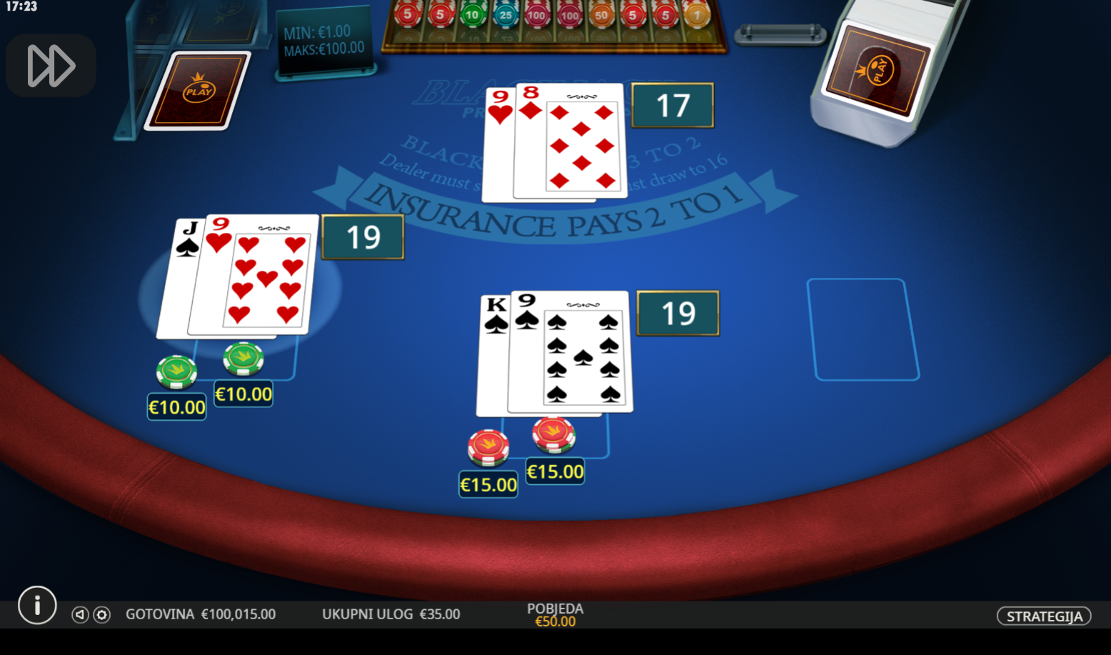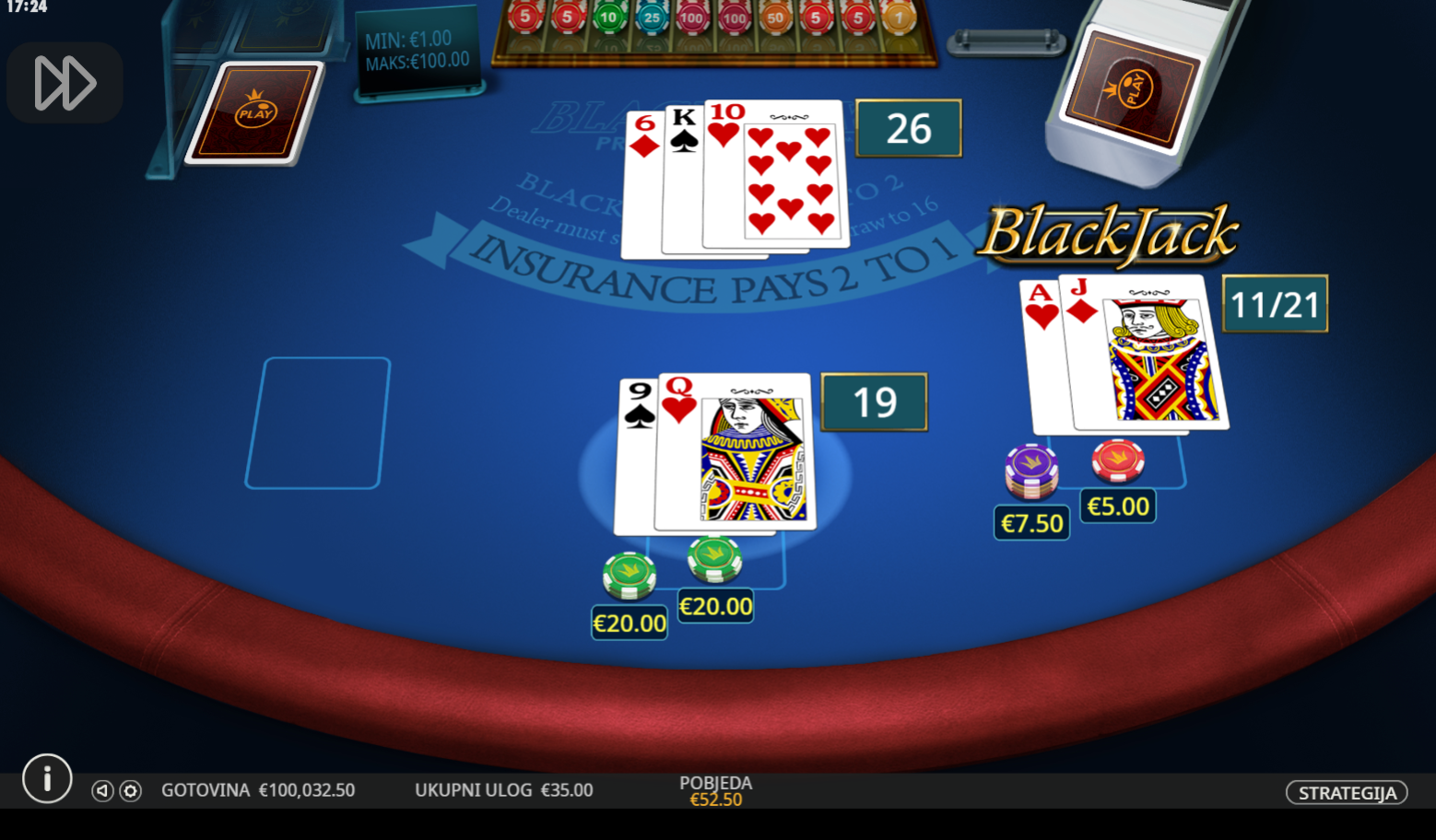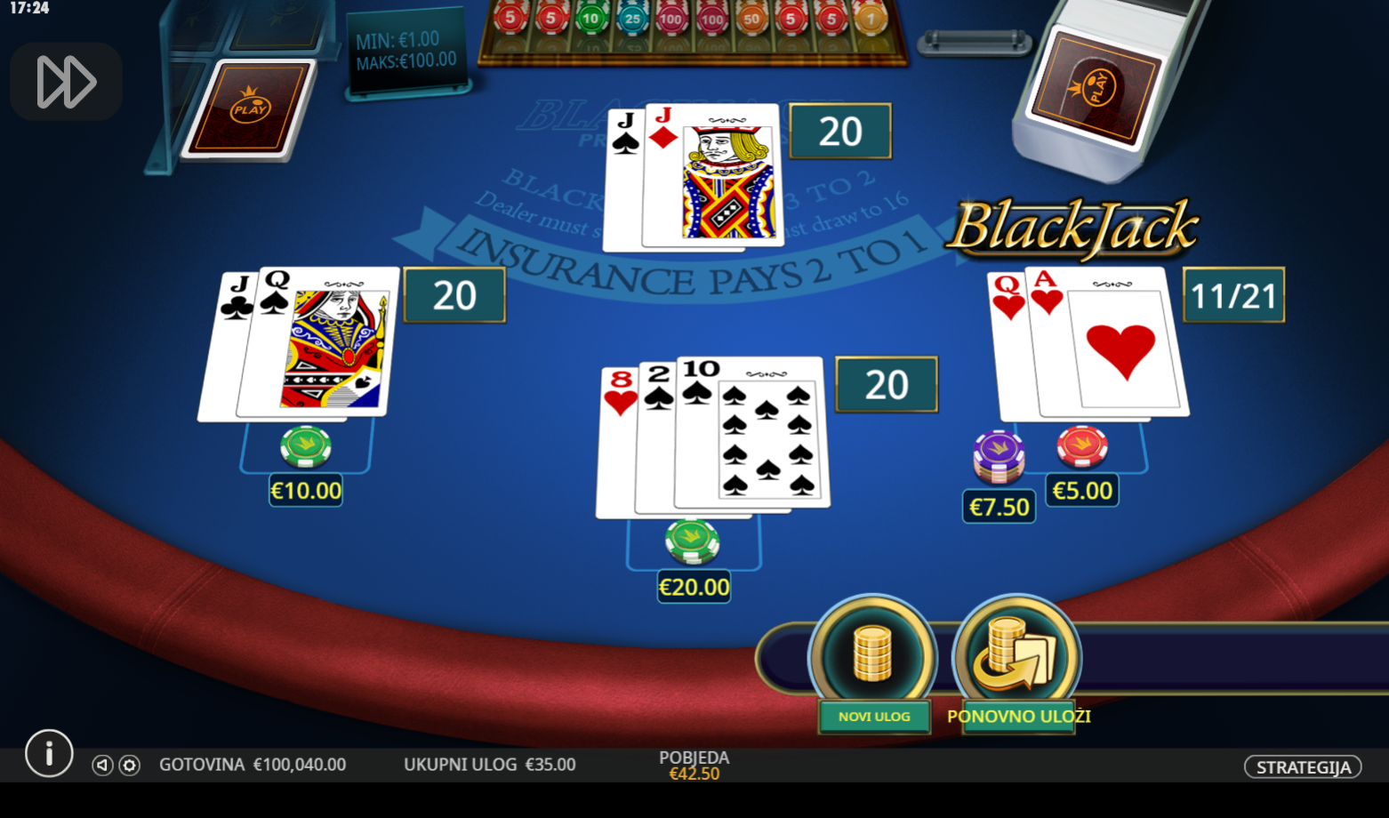 Multi-Hand Blackjack pruža ti priliku da pokažeš svoje vještine i pobijediš djelitelja uz strategiju i sreću. Ova verzija klasičnog blackjacka omogućava igranje s više ruku odjednom, čineći svaki krug još uzbudljivijim. Pravila igre su jednostavna: cilj je imati bolji zbroj bodova od djelitelja, ali pritom ne prijeći 21 bod. S 8 špilova u igri, mogućnostima za Double, Split i Osiguranje, Multi-Hand Blackjack nudi brojne načine za povećanje dobitka.