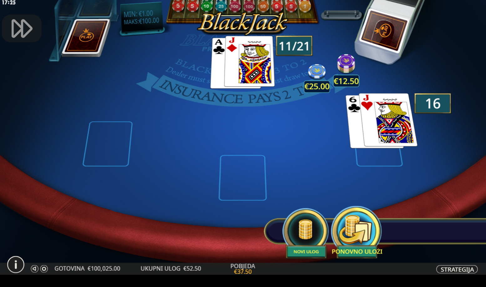 U Multi-Hand Blackjacku koristiš osnovna pravila blackjacka, ali s dodatnom mogućnošću igranja više ruku odjednom. Nakon postavljanja uloga, djelitelj dijeli dvije karte tebi i sebi – s jednom okrenutom licem prema gore. Ako djelitelj ima as, možeš uložiti na Osiguranje protiv mogućnosti da djelitelj ima Blackjack. Ako ti dobiješ Blackjack, odmah pobjeđuješ. Možeš birati između Stand (stajanje) ili Hit (uzimanje nove karte), dok opcije Double i Split omogućavaju dodatne prilike za dobitak. Igra se nastavlja dok djelitelj ne dosegne 17 bodova ili više, a ako prijeđe 21, svi igrači koji su ostali u igri osvajaju dobitak.