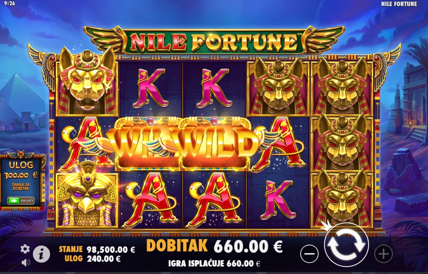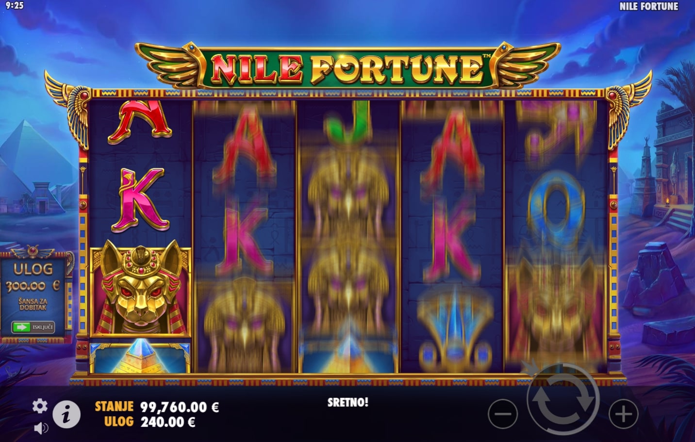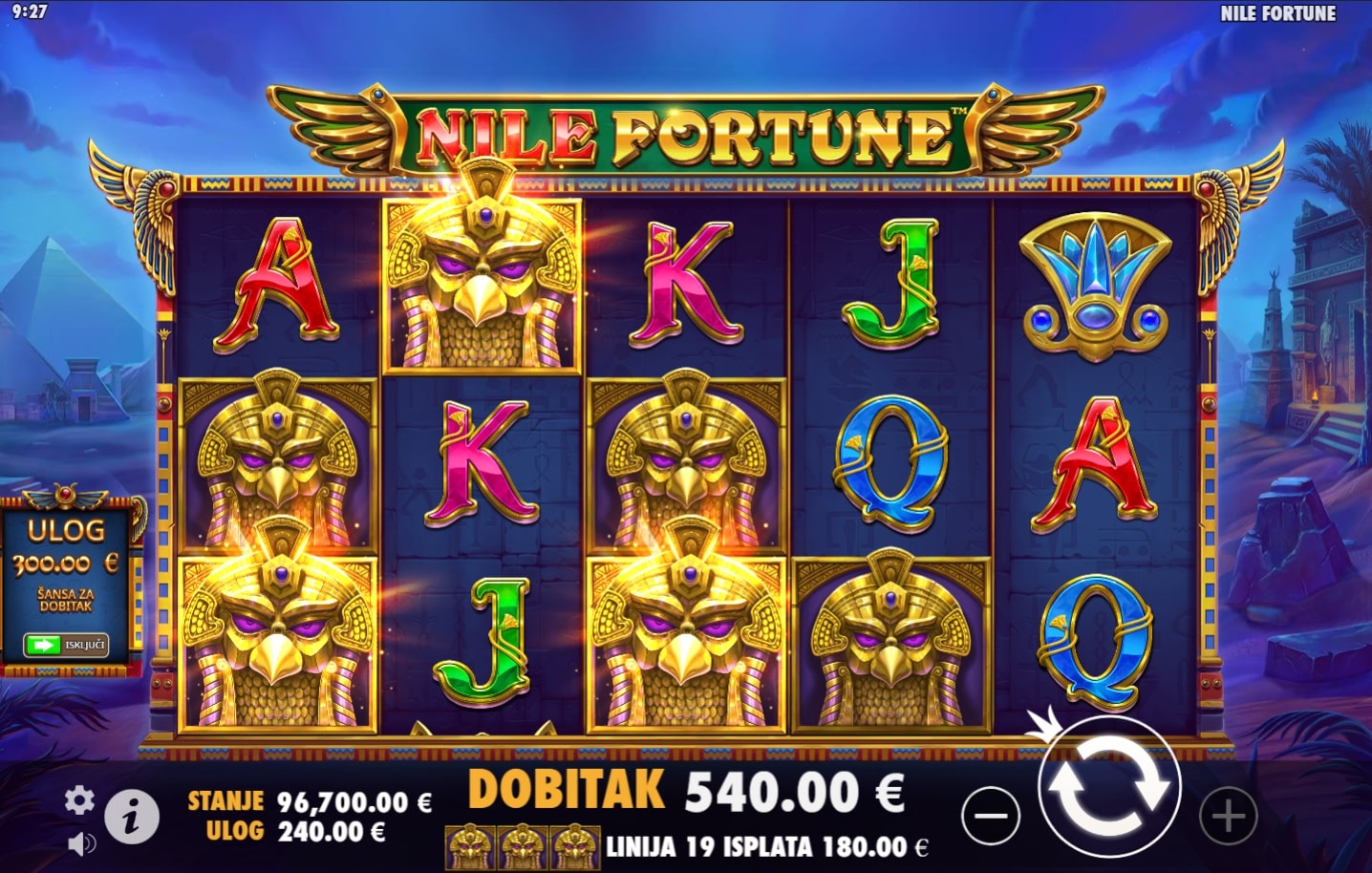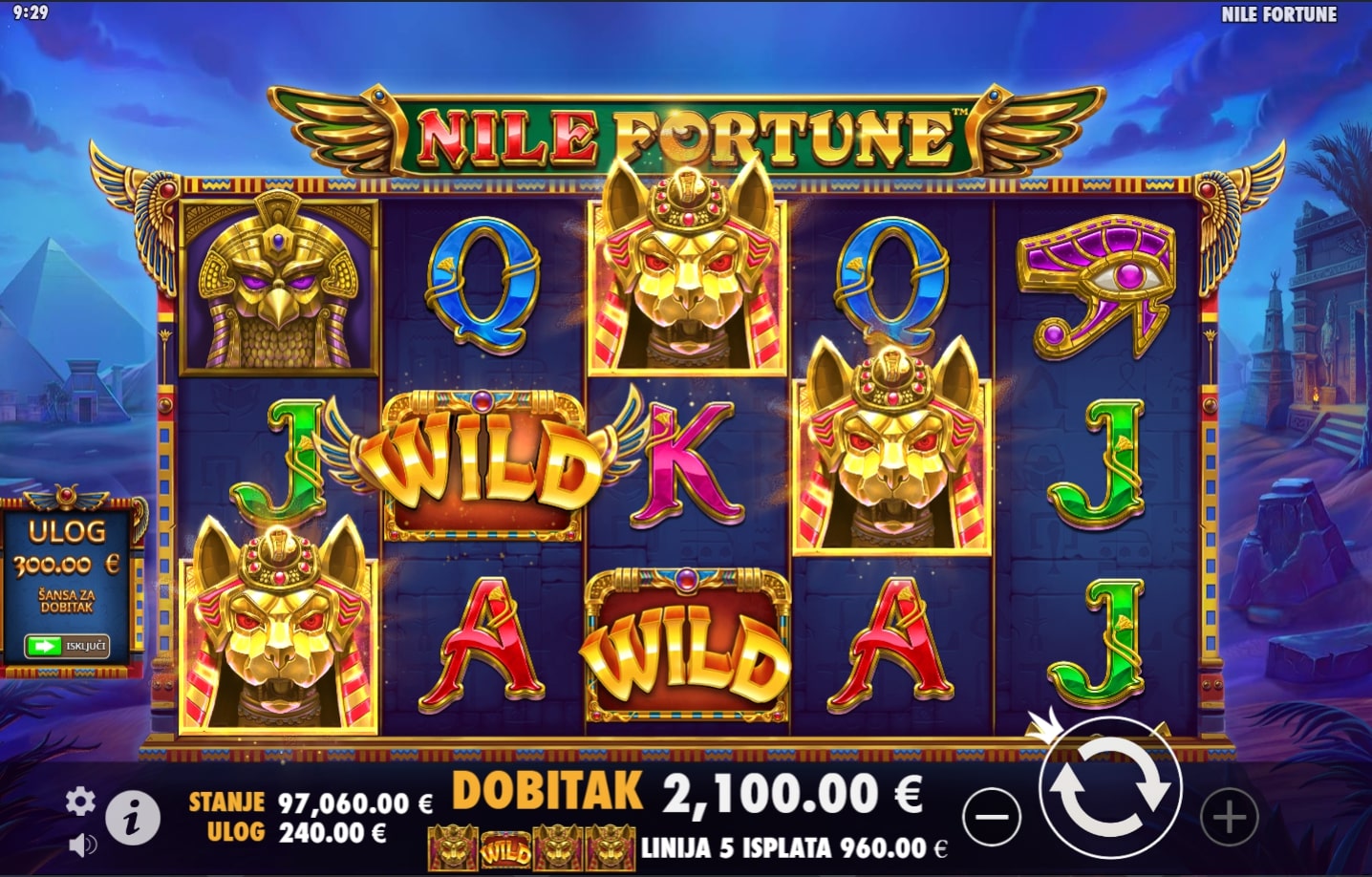 Nile Fortune slot je igra povijesne tematike koja vodi igrača u drevni Egipat na obale rijeke Nil u potrazi za fantastičnim dobicima. Najviše isplaćuju simbolii povezani s mitologijom starih Egipćana, a igrač uz to može okrenuti posebne simbole Wilda i Scatter piramide koji mijenjaju druge simbole, odnosno šalju igrača u svijet besplatnih vrtnji. Igra također sadrži zanimljive značajke kao što su nasumični Wild, role koje se šire ili Wild s množiteljem. Zaigraj Nile Fortune i osvoji vrhunske nagrade!