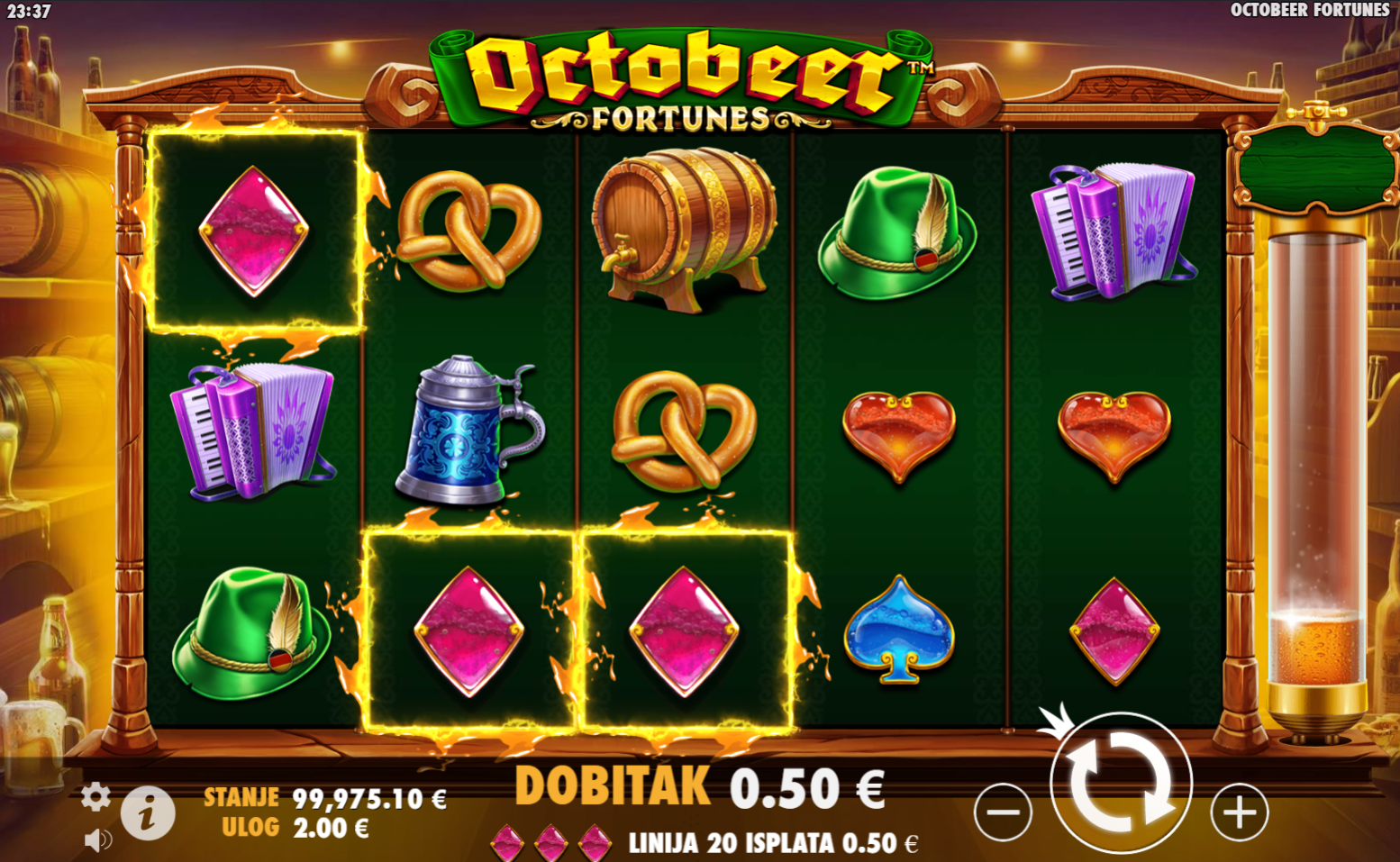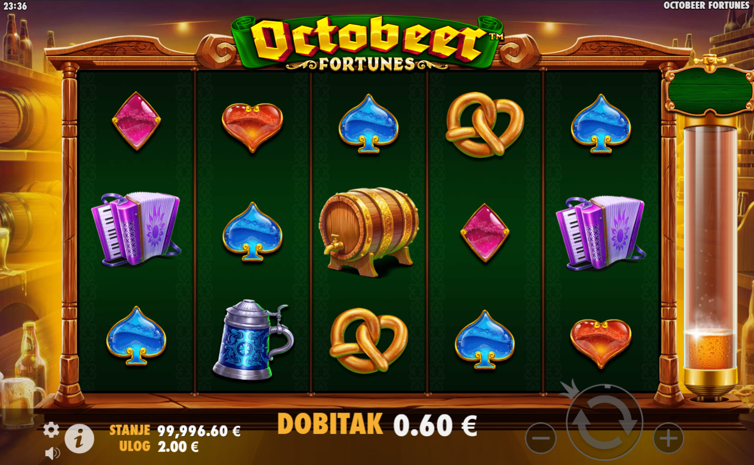 Octobeer Fortunes ima RTP od 96.53%, što igračima pruža dobre šanse za povrat sredstava. Igra ima visoku volatilnost, što znači da su dobici rjeđi, ali potencijalno veći, pružajući priliku za velike nagrade u kraćem vremenu.