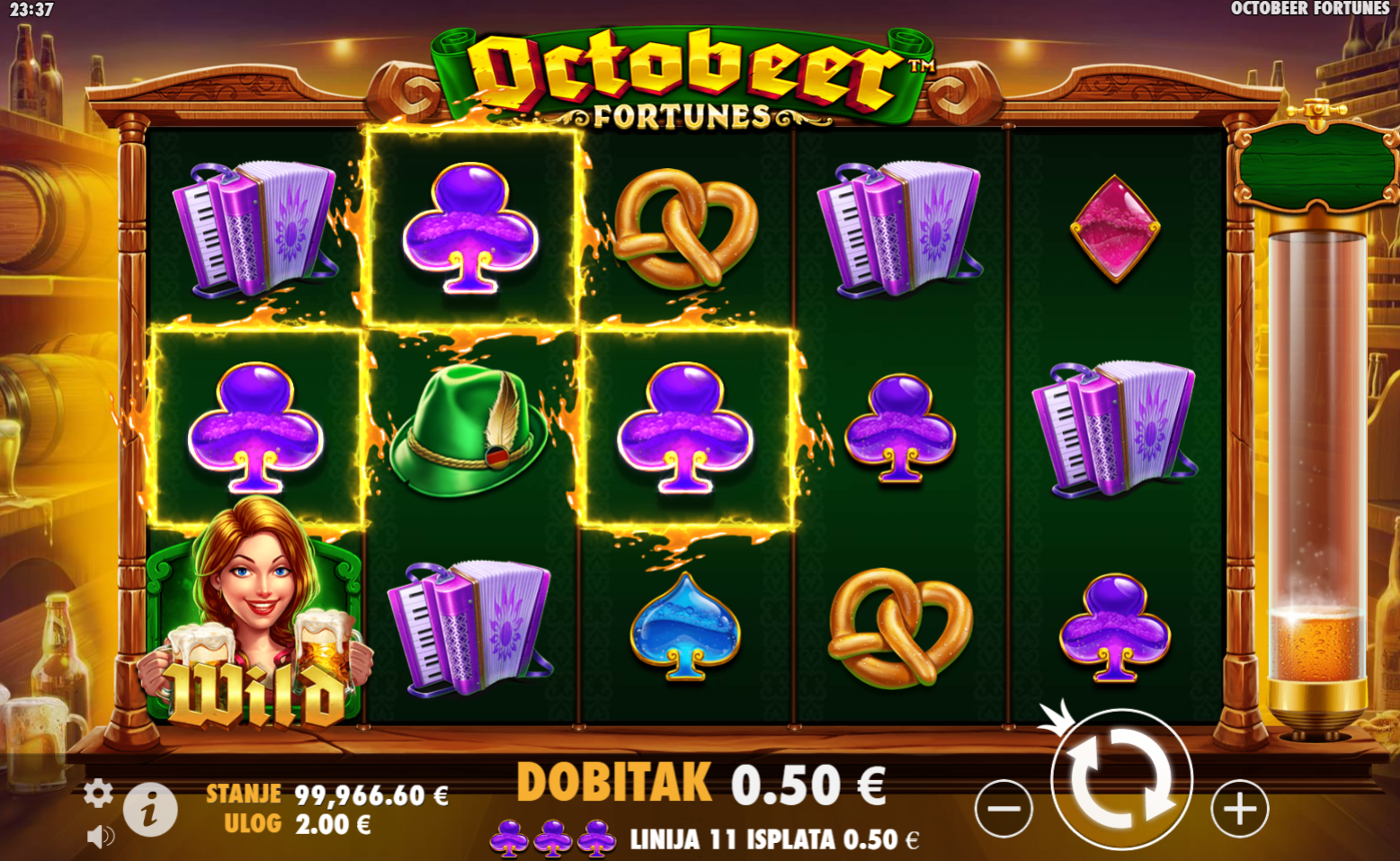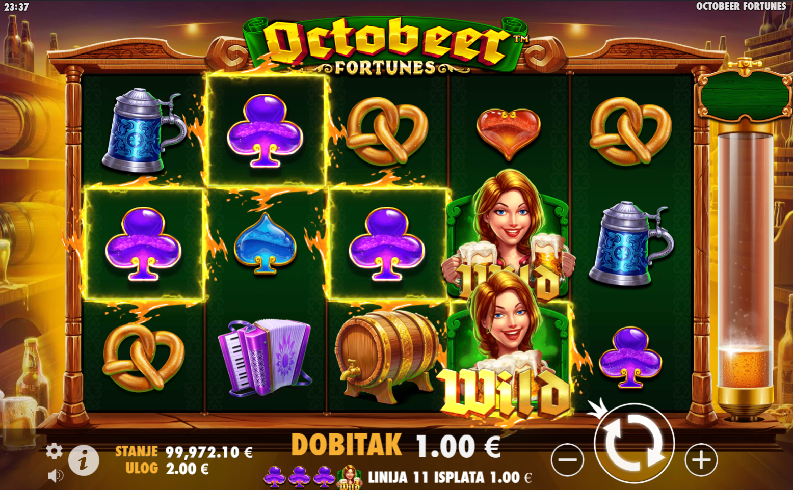 Octobeer Fortunes je uzbudljiv video slot s pet valjaka, gdje se dobitne kombinacije formiraju s lijeva nadesno. Igra nudi mnoštvo prilika za dobitak kroz Wild simbole i Novac simbole, dok besplatne vrtnje donose još veće šanse za osvajanje nagrada. Wild simboli zamjenjuju sve ostale simbole osim simbola Novca i prikupljaju vrijednosti novčanih simbola na zaslonu, čime povećavaju ukupni dobitak.