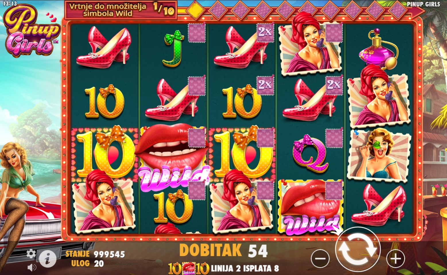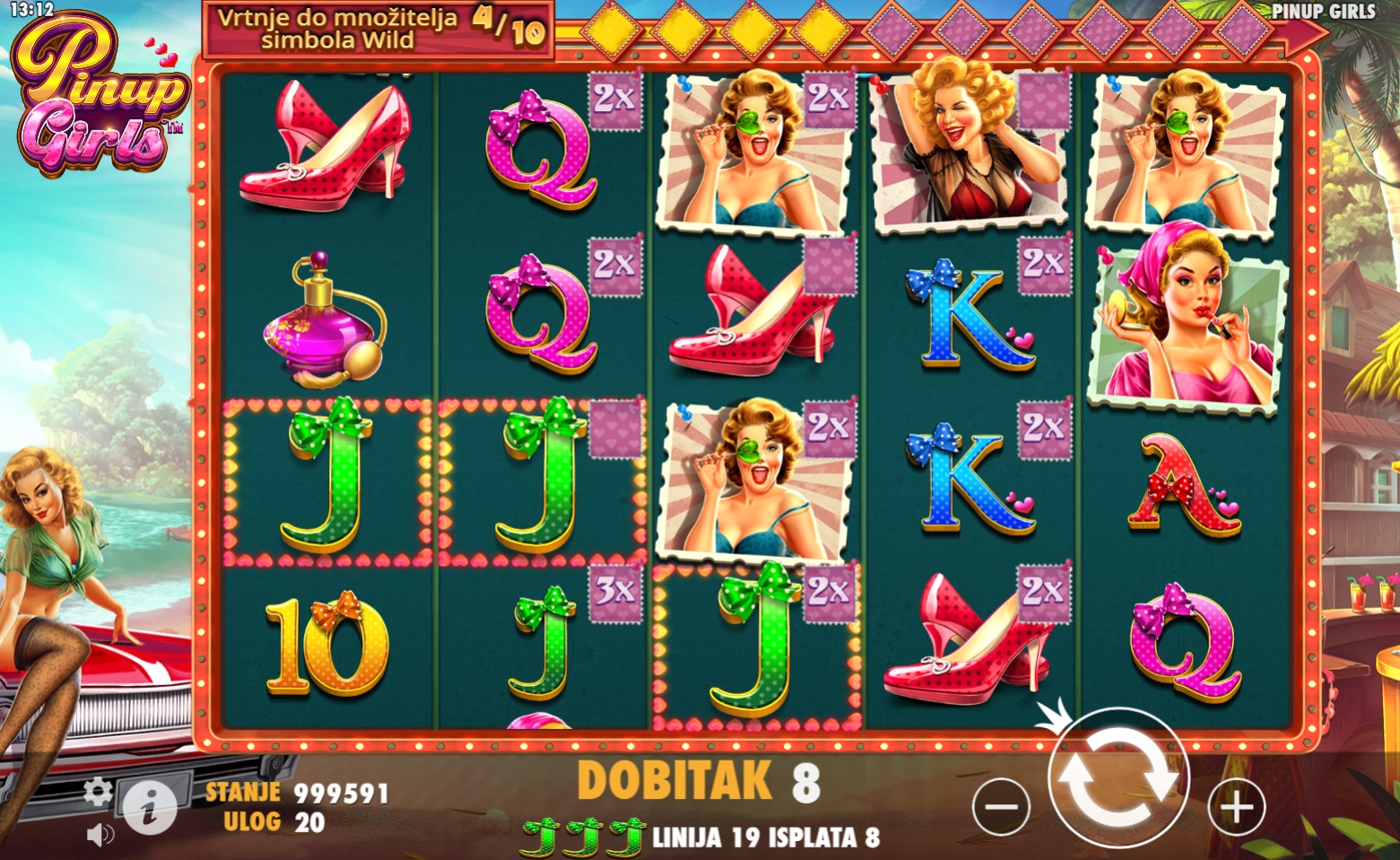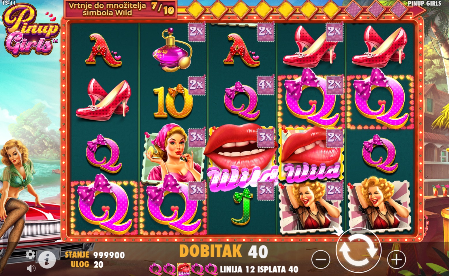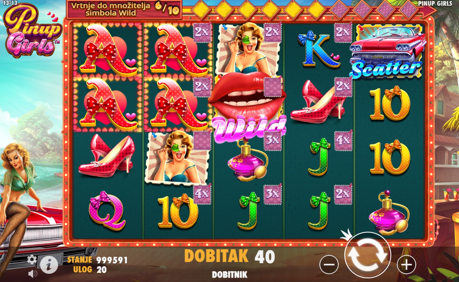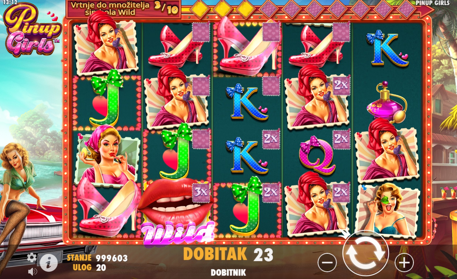 Gameplay u Pinup Girls™ je jednostavan, a istovremeno pun uzbuđenja. Igra se na pet koluta, a tijekom 10 vrtnji možeš prikupljati množitelje koji ostaju na kolutima sve do kraja ciklusa. Wild simboli, koji se pojavljuju na 2., 3. i 4. kolutu, pomažu ti u slaganju dobitnih linija, dok ti Scatter donosi besplatne vrtnje s dodatnim bonusima. Svakih 10 vrtnji, svi skupljeni množitelji primjenjuju se na dobitke, što može značajno povećati tvoje nagrade.