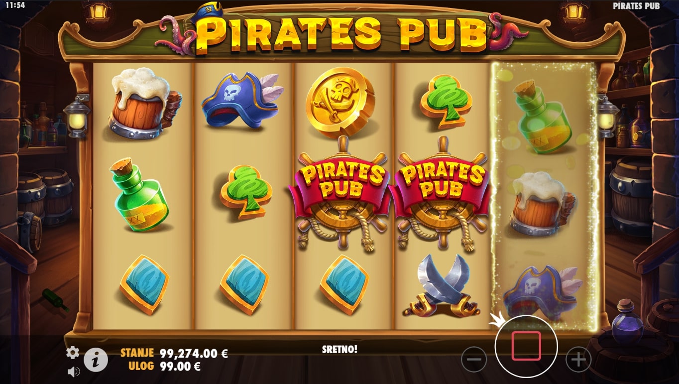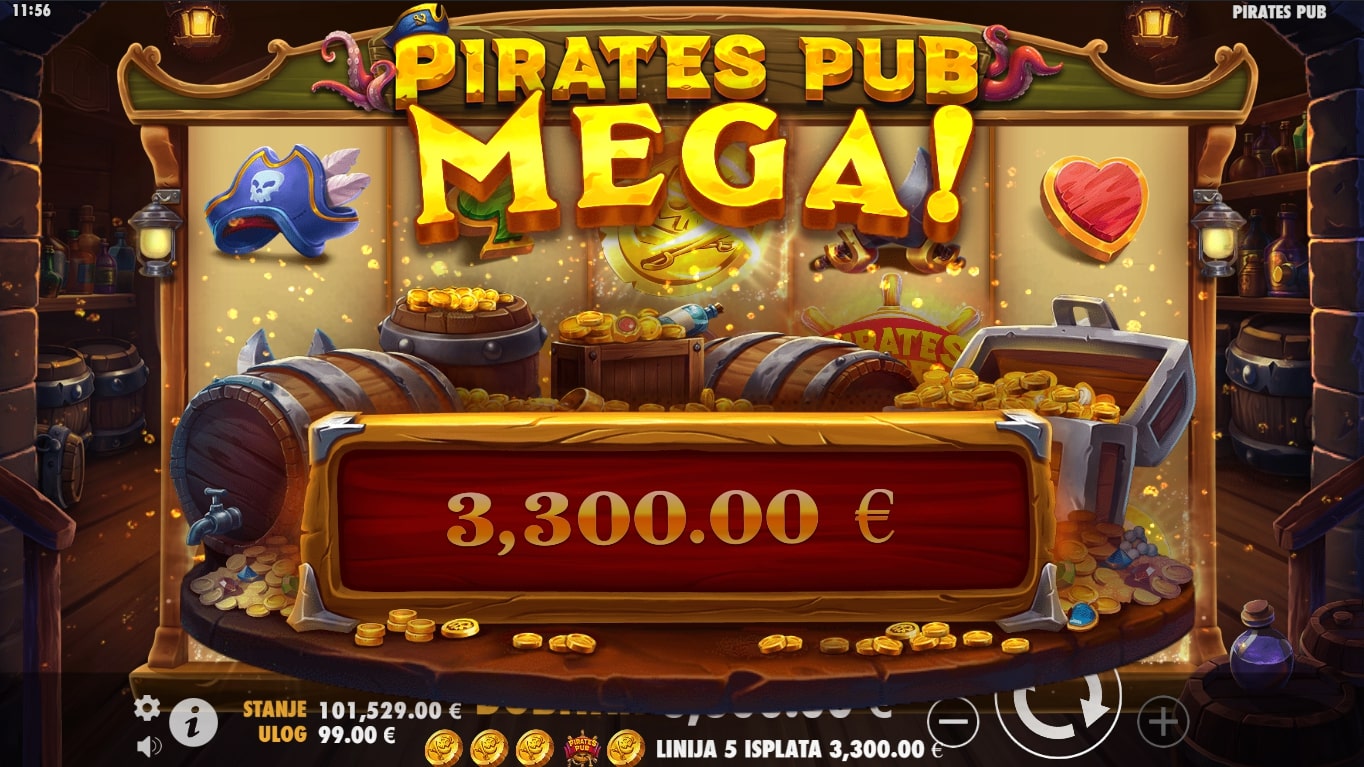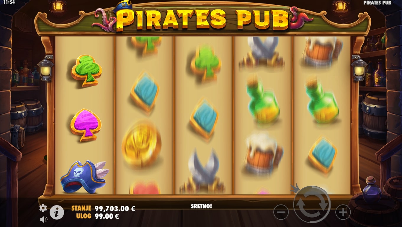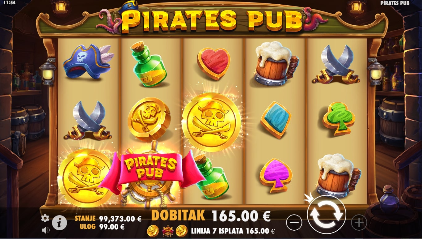 Pirates Pub slot je igra tematskog karaktera koja vodi igrača u nezaboravnu avanturu s gusarima u potrazi za fantastičnim nagradama. Simboli su inspirirani piratskim stilom života punog alkohola i zabave te stoga najviše isplaćuju simboli novčića, gusarske kape, mačeva, ruma i piva. Igra uz to sadrži poseban Pirates Pub simbol koji mijenja druge simbole, a uz to šalje igrača u obećanu zemlju besplatnih vrtnji. Zaigraj Pirates Pub te ostvari legendarne dobitke!
