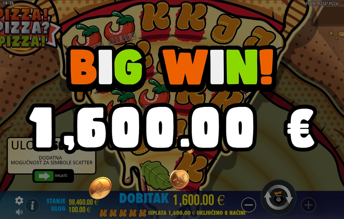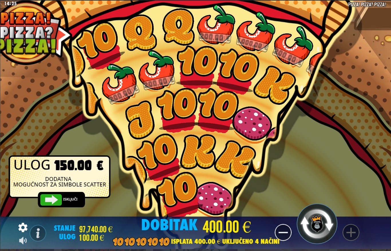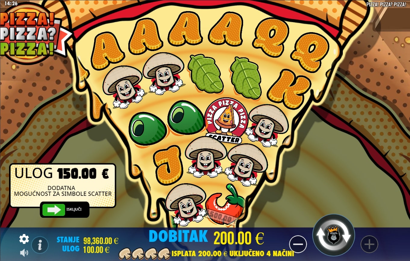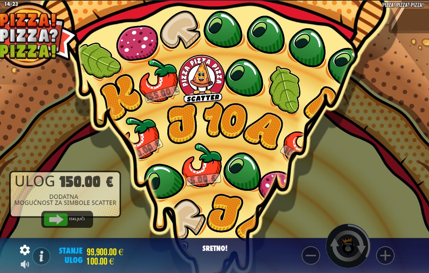 Pizza! Pizza? Pizza! slot je igra koja vodi igrača u kuhinju gdje mora složiti dobitnu kombinaciju sastojaka na pizzi koja okusne pupoljke šalje u drugu dimenziiju. Najviše isplaćuju simboli salame, lista, masline i šampinjona, dok igra sadrži i poseban Scatter simbol koji može aktivirati besplatne vrtnje unutar kojih se javljaju posebni Wild simboli. Moguće je okrenuti i simbole Novca koji na sebi nose vrijednosti do 2000x ukupnog uloga. Zaigraj igru Pizza! Pizza? Pizza! te osvoji slasne nagrade!